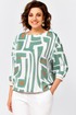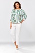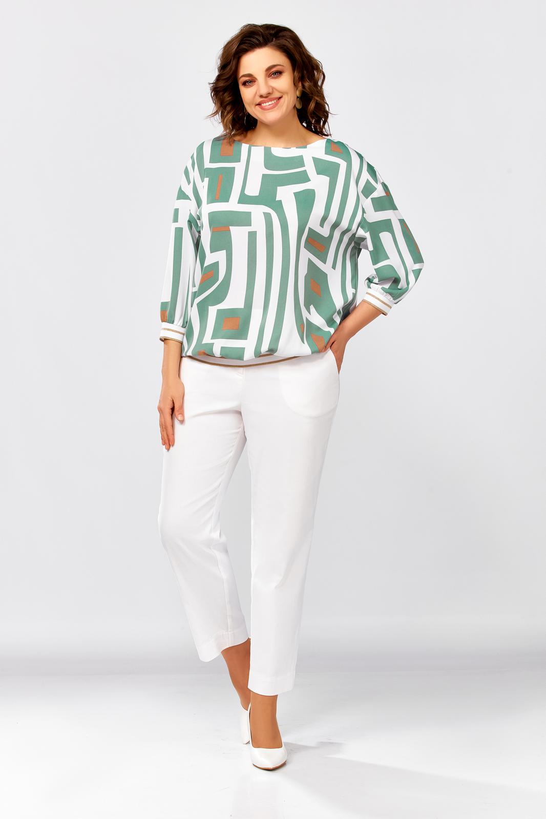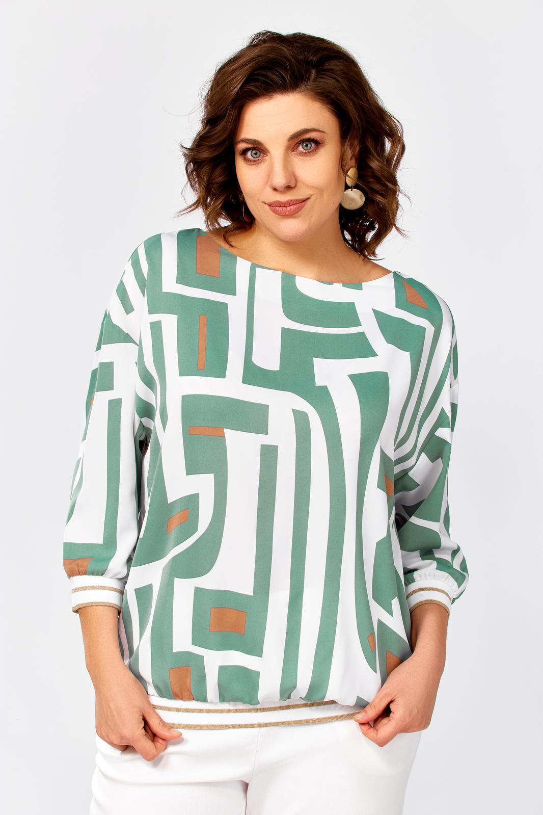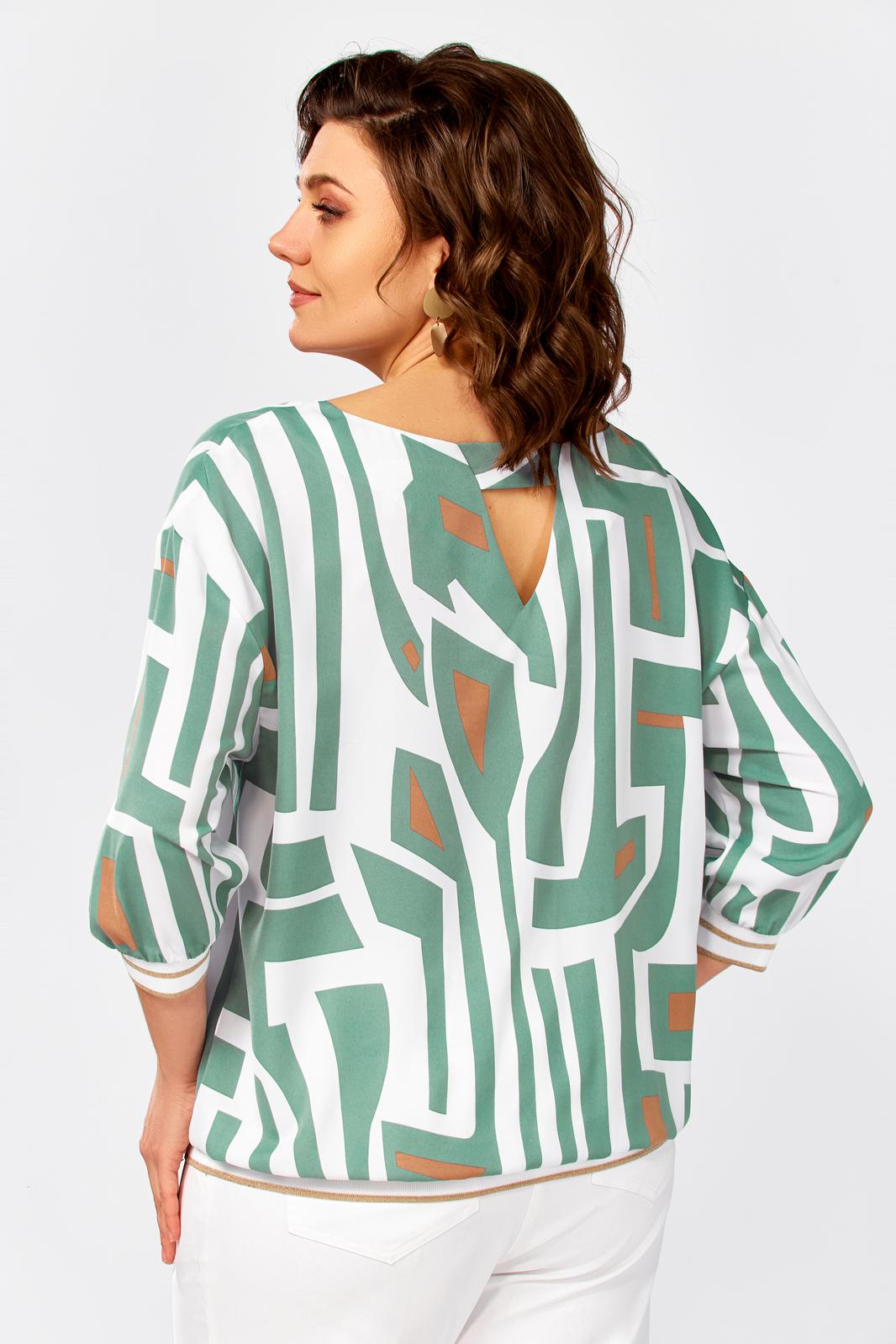 Блузка из мягкой вискозной ткани свободного силуэта со спущенной линией плеча. Горловина по полочке округлой формы, по спинке – V-образный вырез, который соединён планкой. Рукав длиной 3/4. Низ блузки и низ рукавов присобраны на декоративный трикотажный довяз.