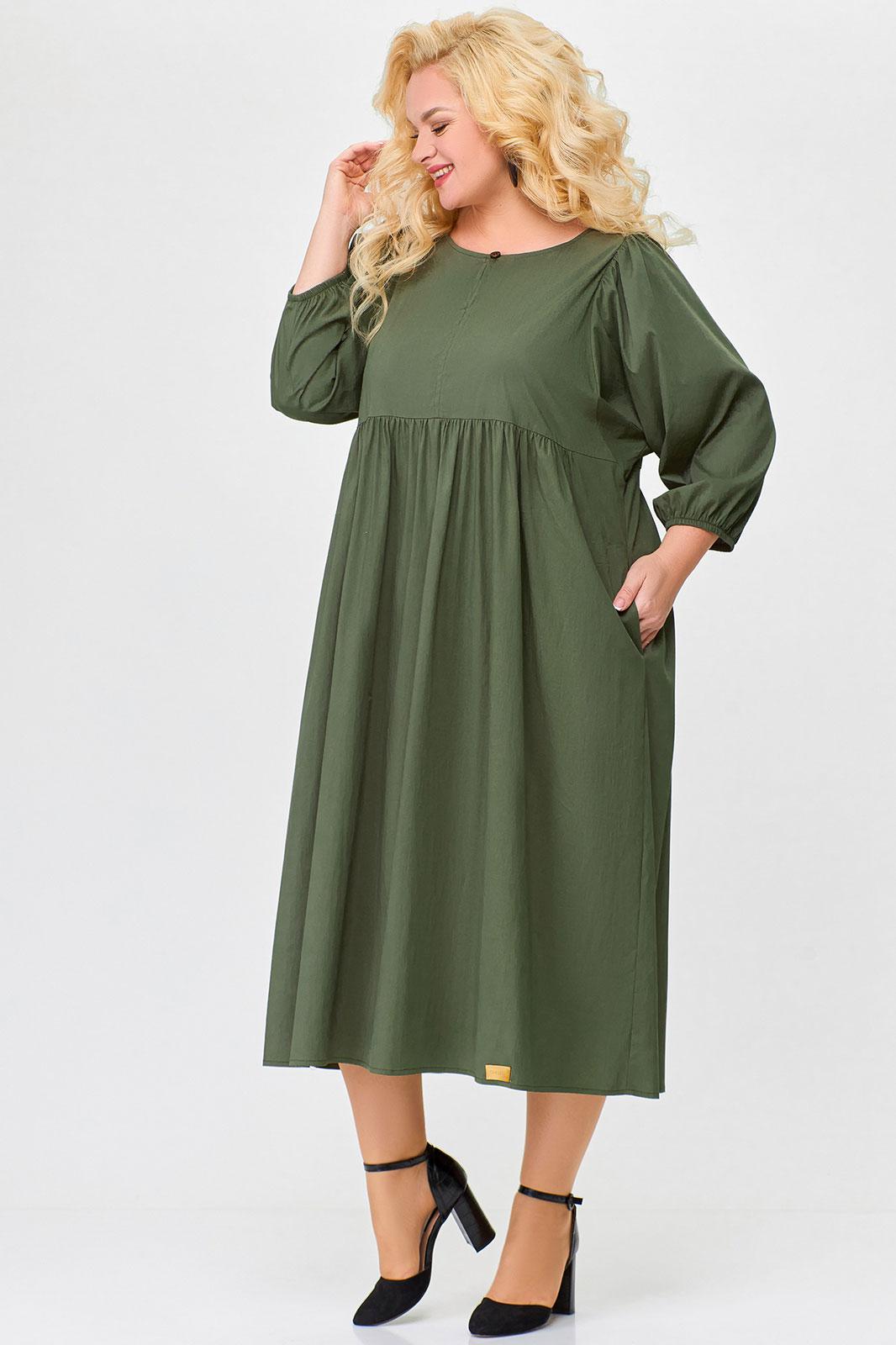 Платье прямого силуэта из эластичной хлопковой ткани. Платье отрезное по линии талии. Перед лифа со средним швом и разрезом с застёжкой по горловине на навесную петлю и декоративную пуговицу. Юбка со сборкой по линии талии и карманами в боковых швах. По низу юбки пришита фирменная эмблема «S W А L L O W». Рукав цельнокроеный, отрезной по линии проймы, со сборкой по окату. Низ рукава собран на эластичную тесьму. Длина изделия по спинке в размерах 52,54 – 115 см, в размерах 56, 58, 60 - 119 см.