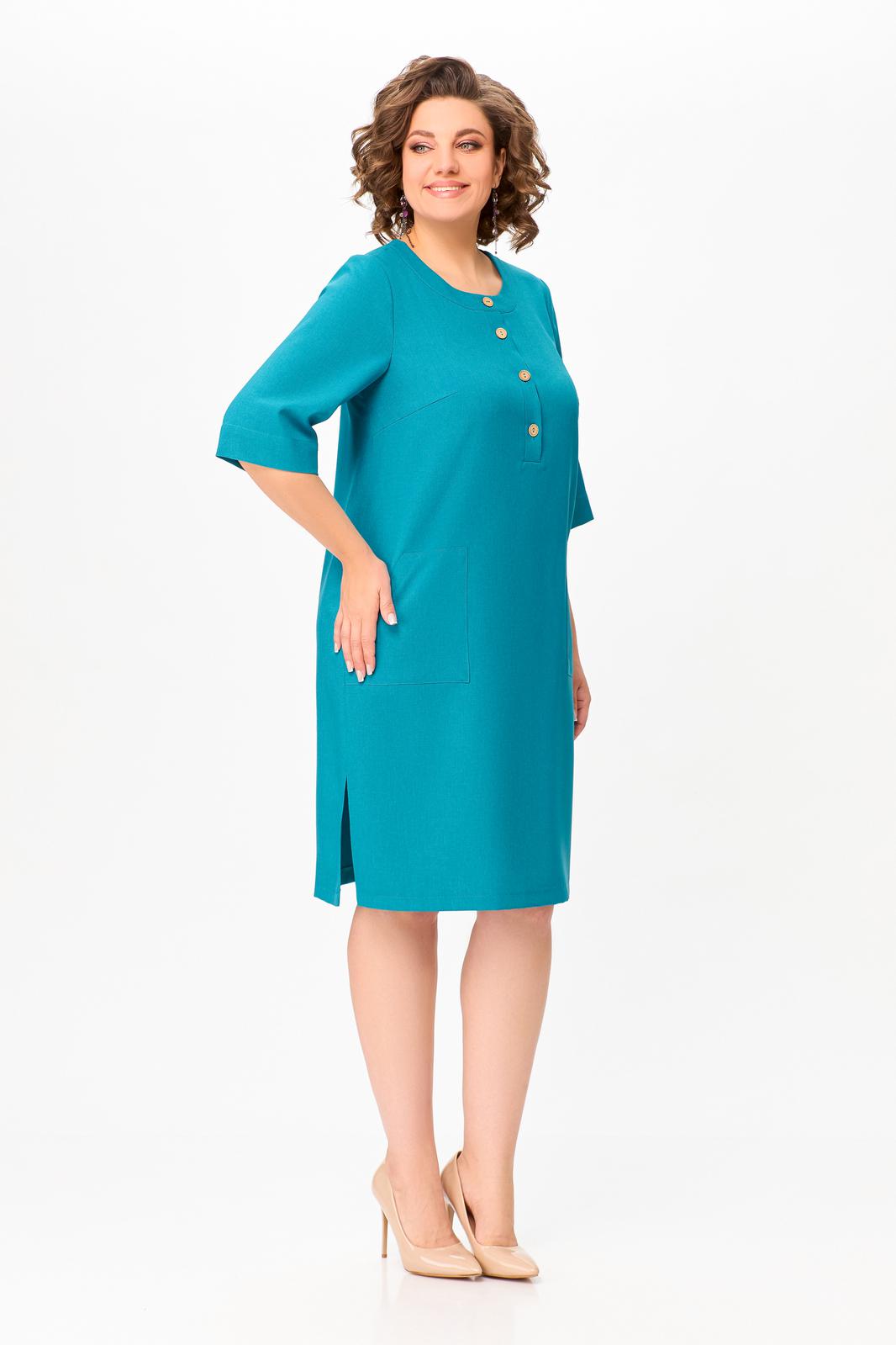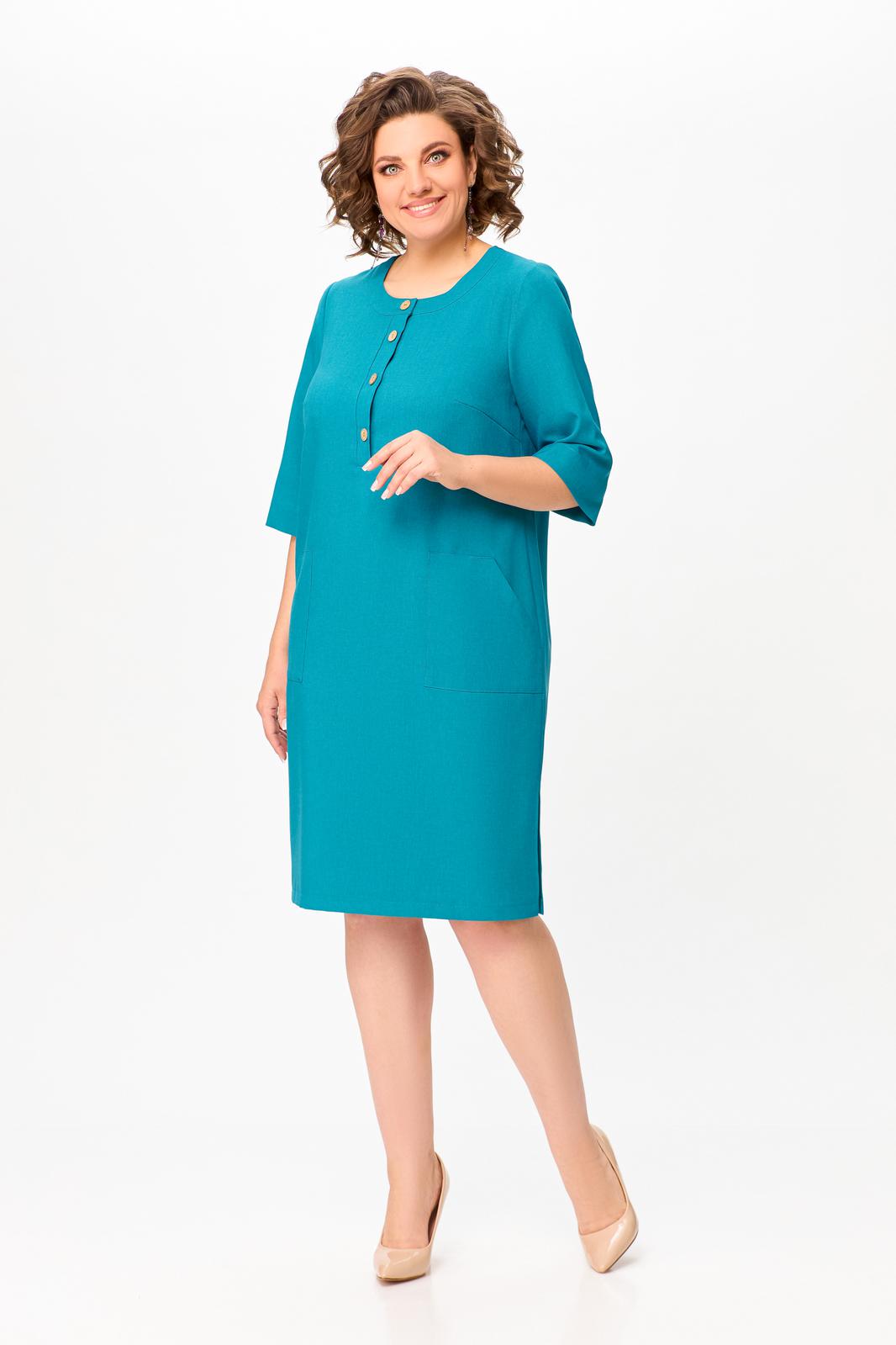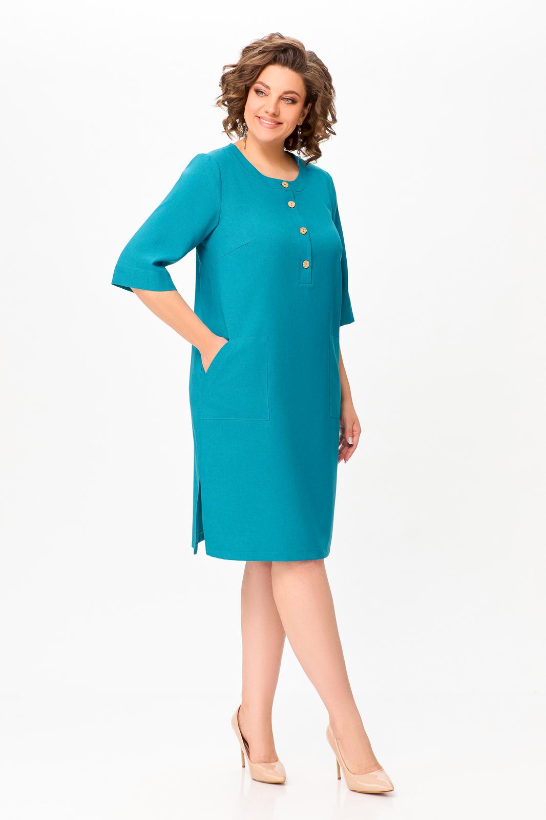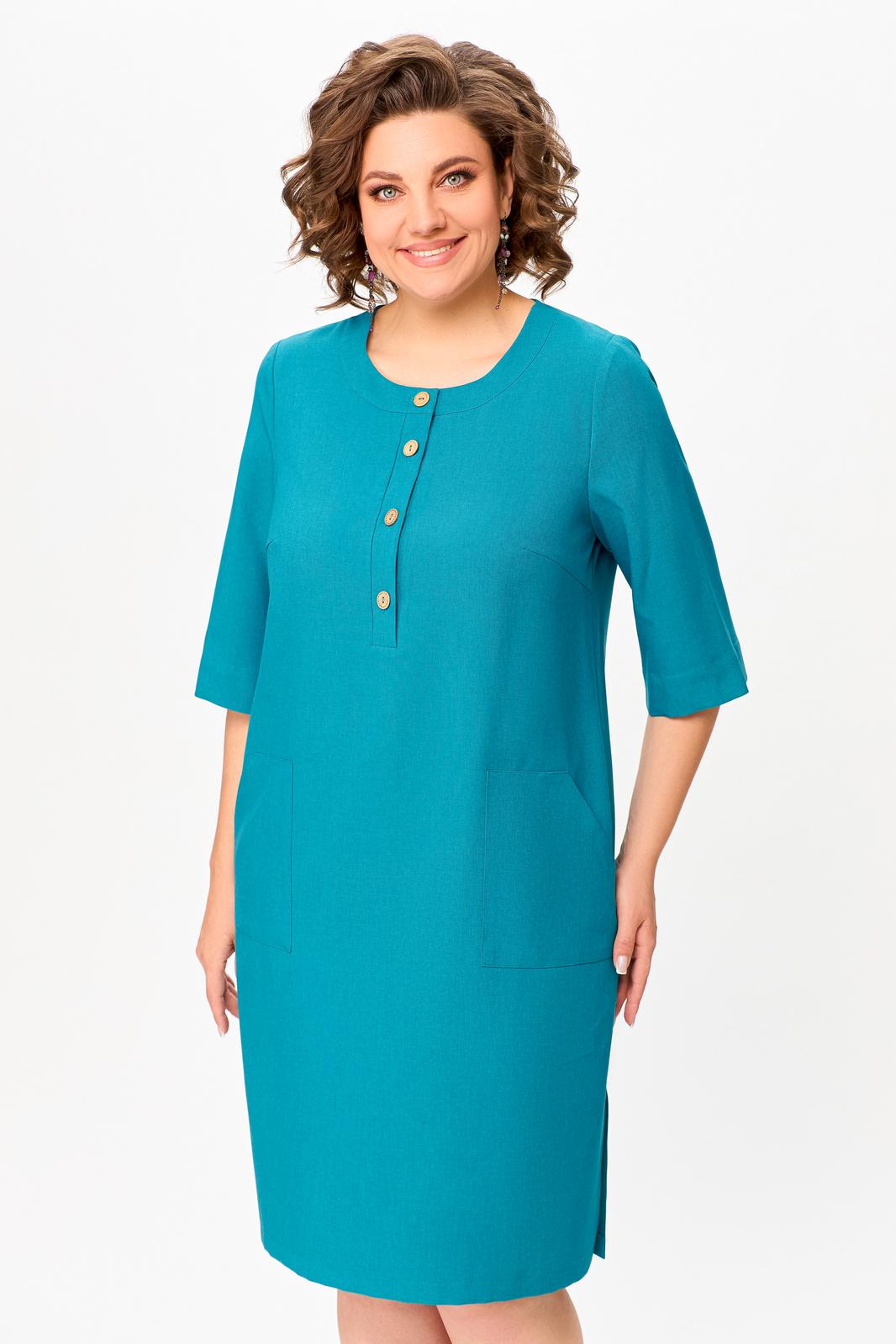 Платье прямого силуэта из вискозно-льняной ткани, полочка с планкой , застегивающейся на петли и декоративные пуговицы, с нагрудными выточками и накладными фигурными карманами в области бёдер, горловина круглая, обработана притачной обтачкой, рукав втачной, одношовный, длиной ниже локтя. В боковых швах разрезы длиной 20 см.