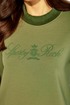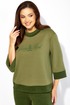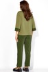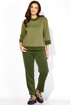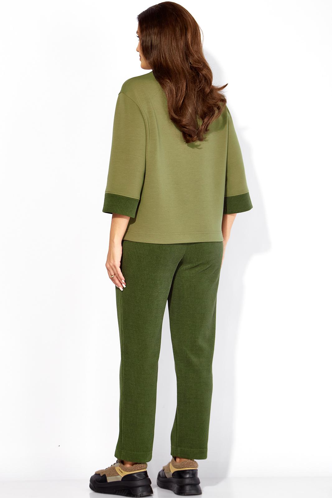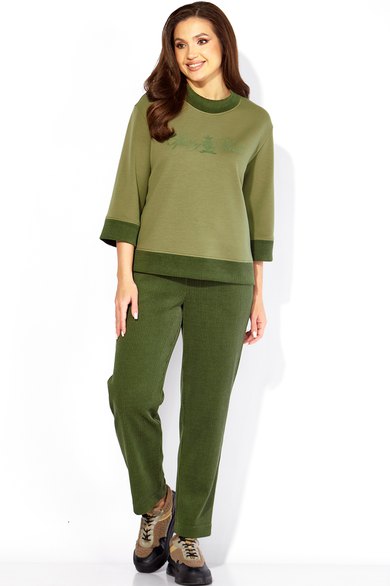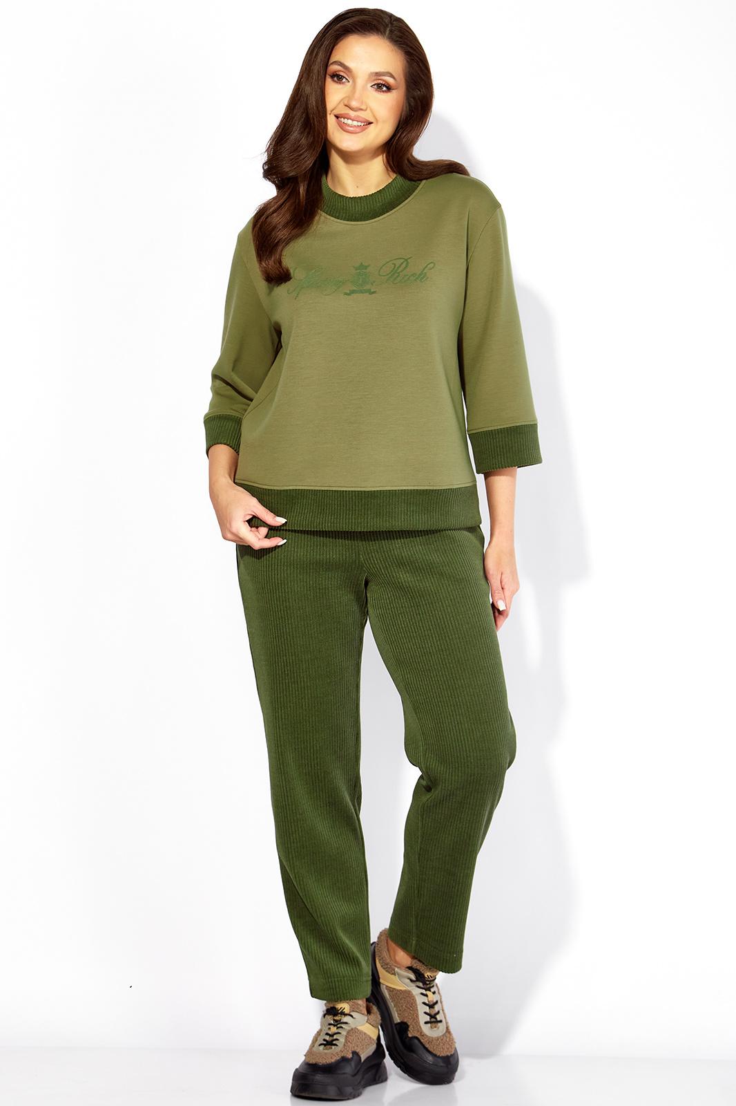 Комплект женский, 2х предметный, состоящий из джемпера и брюк, в сочетании двух видов трикотажного полотна. Джемпер прямого силуэта, с рукавом длинной 3/4. Рукав со спущенной линией плеча. По низу отрезная манжета. Горловина круглой формы, с широкой подрезной бейкой. По низу переда отрезная планка. Перед задекорирован принтом. Манжеты рукавов, бейка горловины и планка низа из отделочного трикотажного полотна. Спинка без особенностей. Брюки прямые. По переду наклонные карманы. Пояс притачной с резинкой и кулисой.