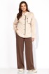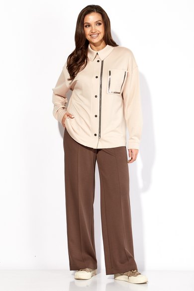 Костюм женский, 2х предметный, изготовлен из трикотажного полотна T E N S E L , состоящий из рубашки и брюк. Рубашка прямого силуэта с длинным рукавом. Рукав со спущенной линией плеча. По низу манжета, с застежкой на кнопку. Застежка центральная, с отрезной планкой на кнопки и чуть смещенную тесьму «молния» Воротник рубашечный, на стойке. На левой полочке карман, акцентированный принтом. Плечевые швы, проймы, воротник и низ изделия выполнеы с открытым срезом, с закрепляющей строчкой. Брюки широкие, прямые. По боку подрезной лапмас и карманы. По центру переда пристрочены защипы «стрелки» Пояс притачной, с гладкой центральной частью, дальше резинка по кругу.