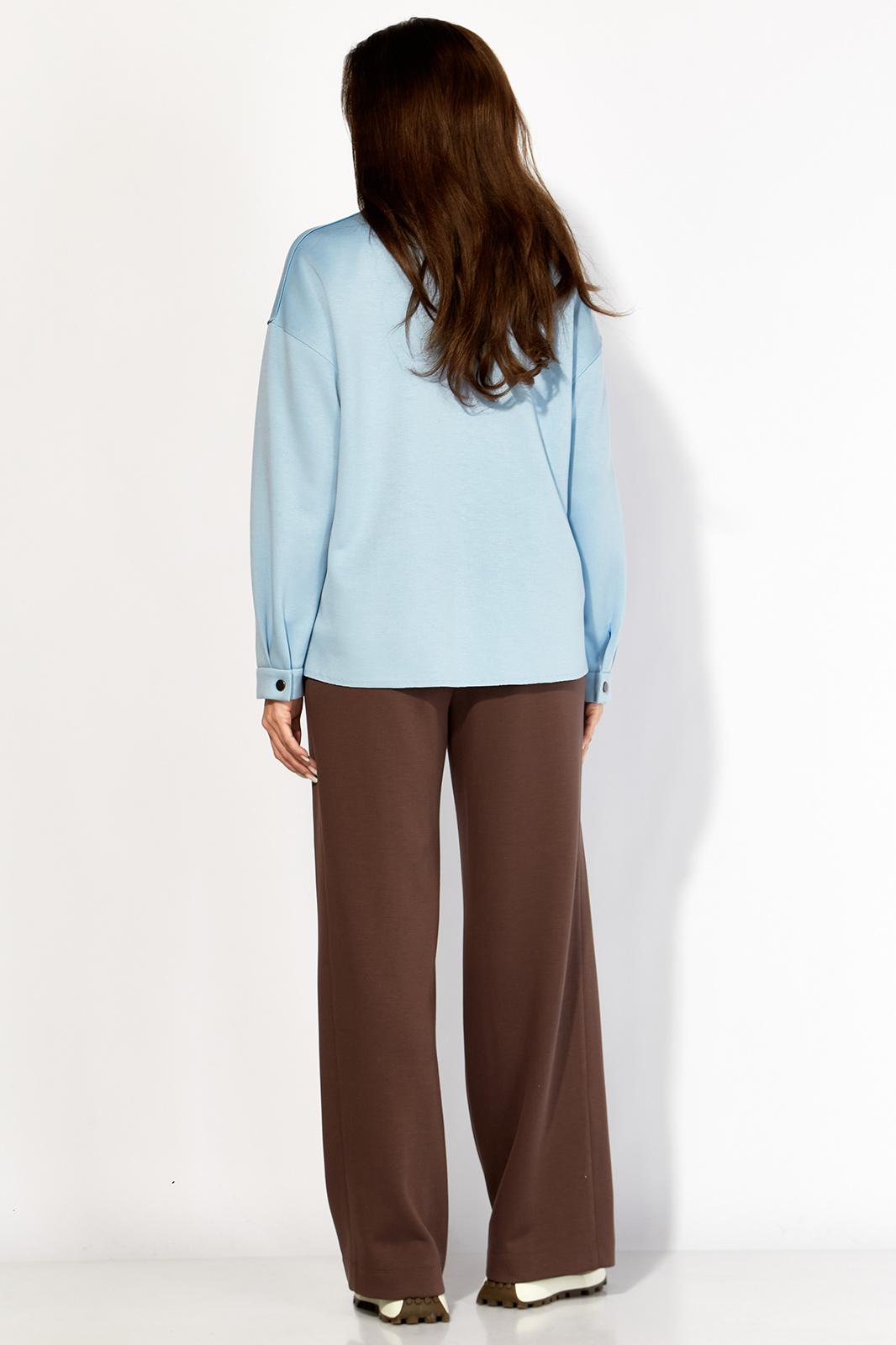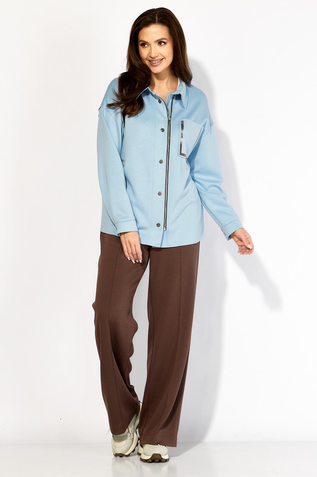 Костюм женский, 2х предметный, изготовлен из трикотажного полотна T E N S E L , состоящий из рубашки и брюк. Рубашка прямого силуэта с длинным рукавом. Рукав со спущенной линией плеча. По низу манжета, с застежкой на кнопку. Застежка центральная, с отрезной планкой на кнопки и чуть смещенную тесьму «молния» Воротник рубашечный, на стойке. На левой полочке карман, акцентированный принтом. Плечевые швы, проймы, воротник и низ изделия выполнеы с открытым срезом, с закрепляющей строчкой. Брюки широкие, прямые. По боку подрезной лапмас и карманы. По центру переда пристрочены защипы «стрелки» Пояс притачной, с гладкой центральной частью, дальше резинка по кругу.