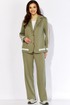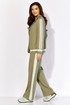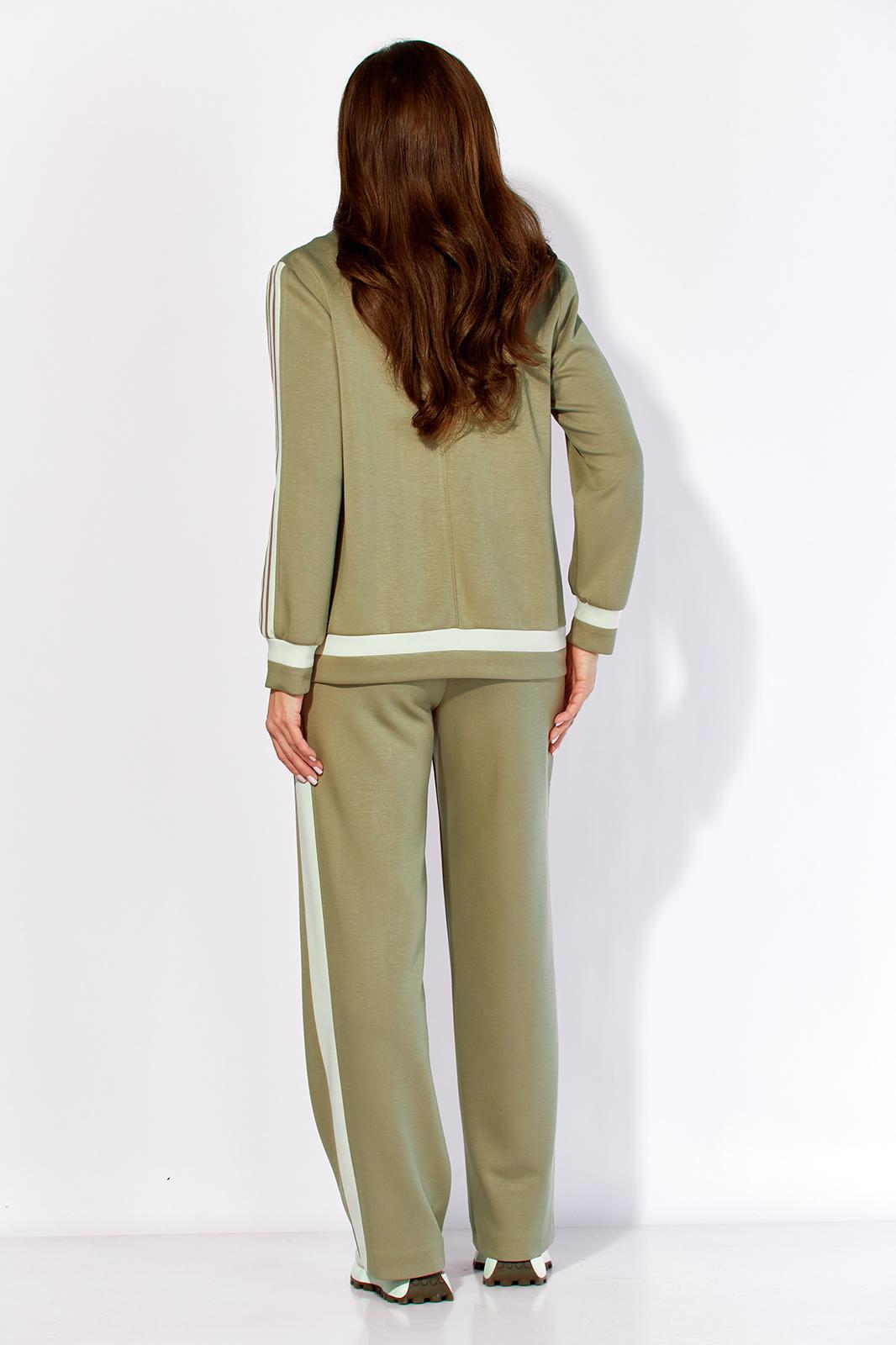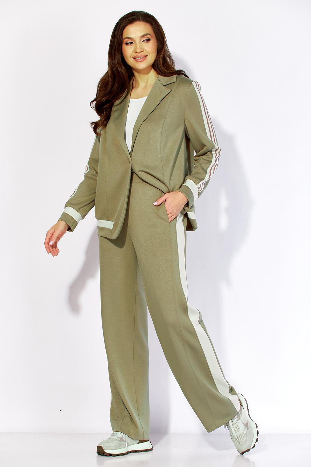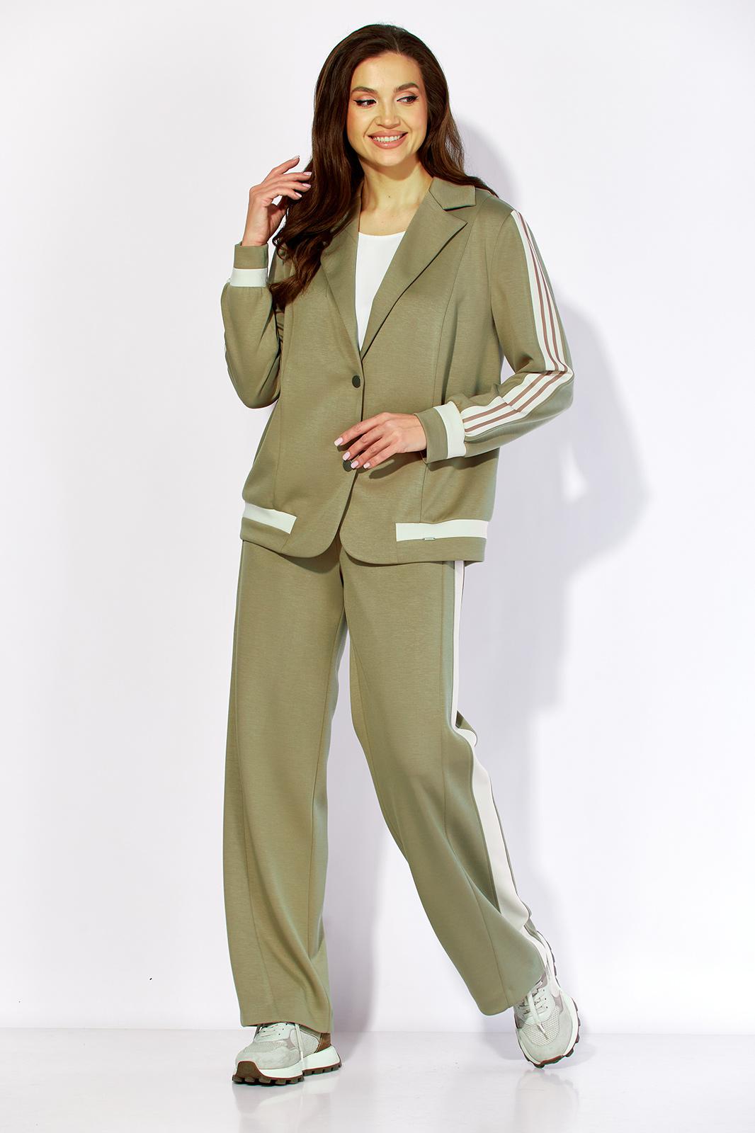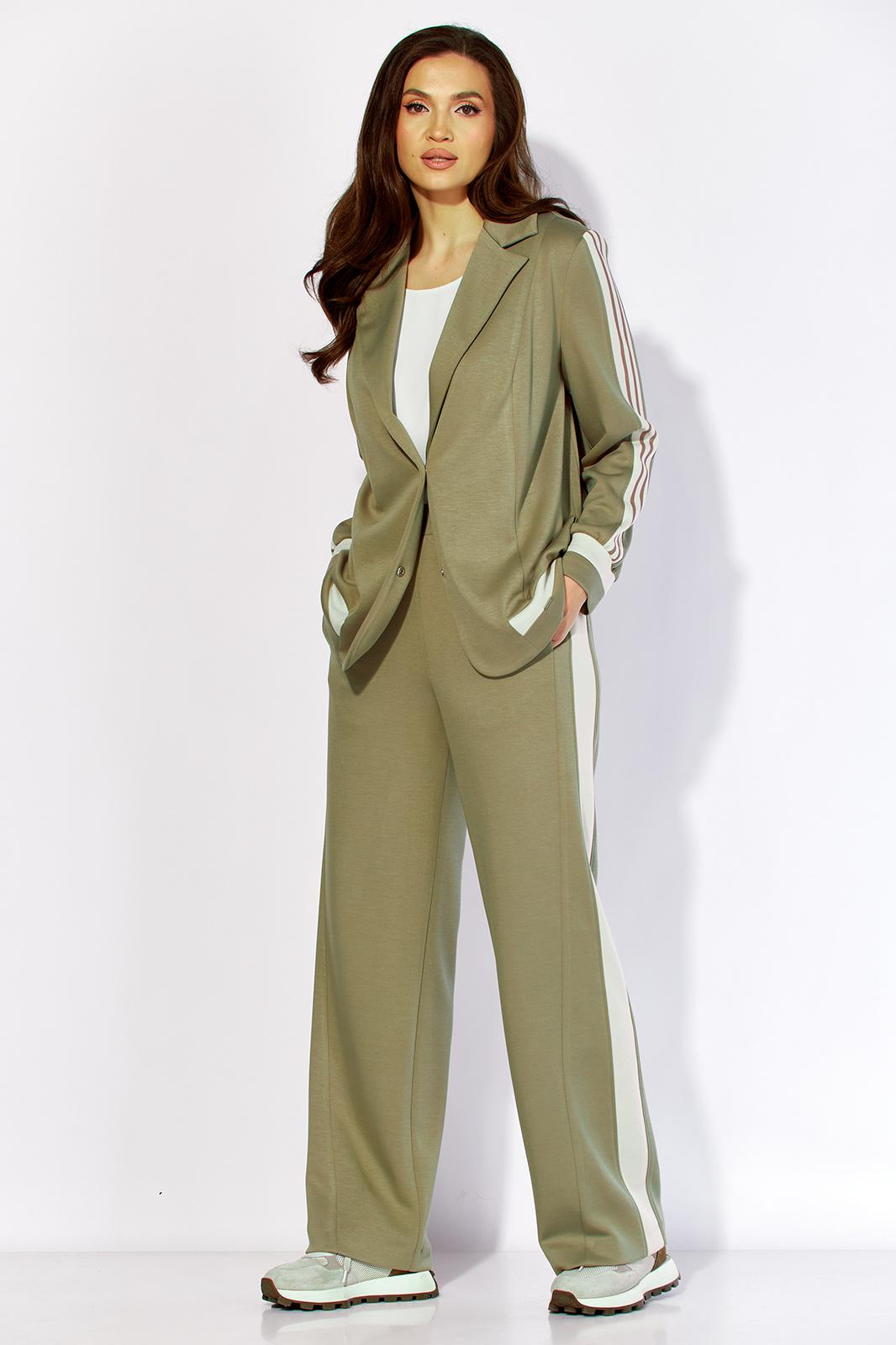 Комплект женский, двухпредметный, состоящий из жакета и брюк, из трикотажного полотна T E N S E L Жакет прямого силуэта, по низу на широкой подрезной планке. По переду вертикальные рельефы. Воротник отложной с лацканами. Крой борта, по низу, закруглен. Застежка центральная, на кнопки. Рукав втачной, длинный с отделочным лампасом и манжетой по низу. Манжета рукава и планка низа, с отделочными деталями. Спинка со средним швом. Жакет без подкладки . Брюки прямые. По переду фигурные рельефы.Карманы в рельефах. По боку отделочный лампас. Пояс притачной, с резинкой. Центральная часть пояса гладкая.
