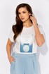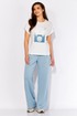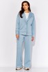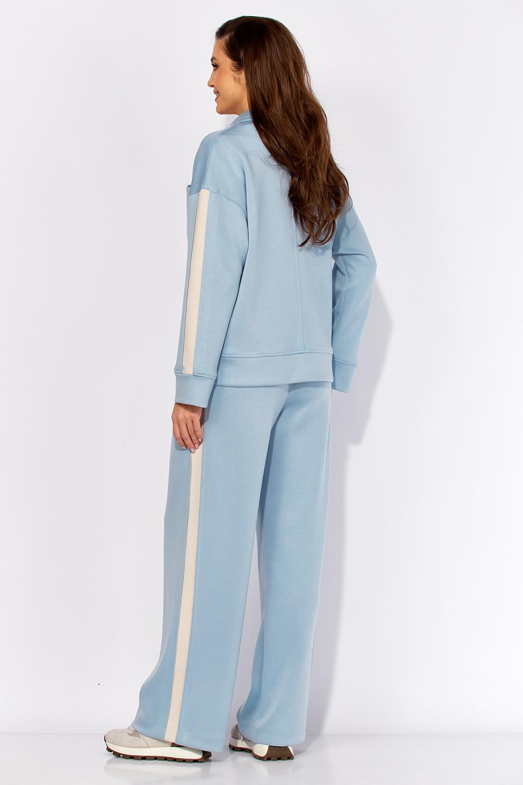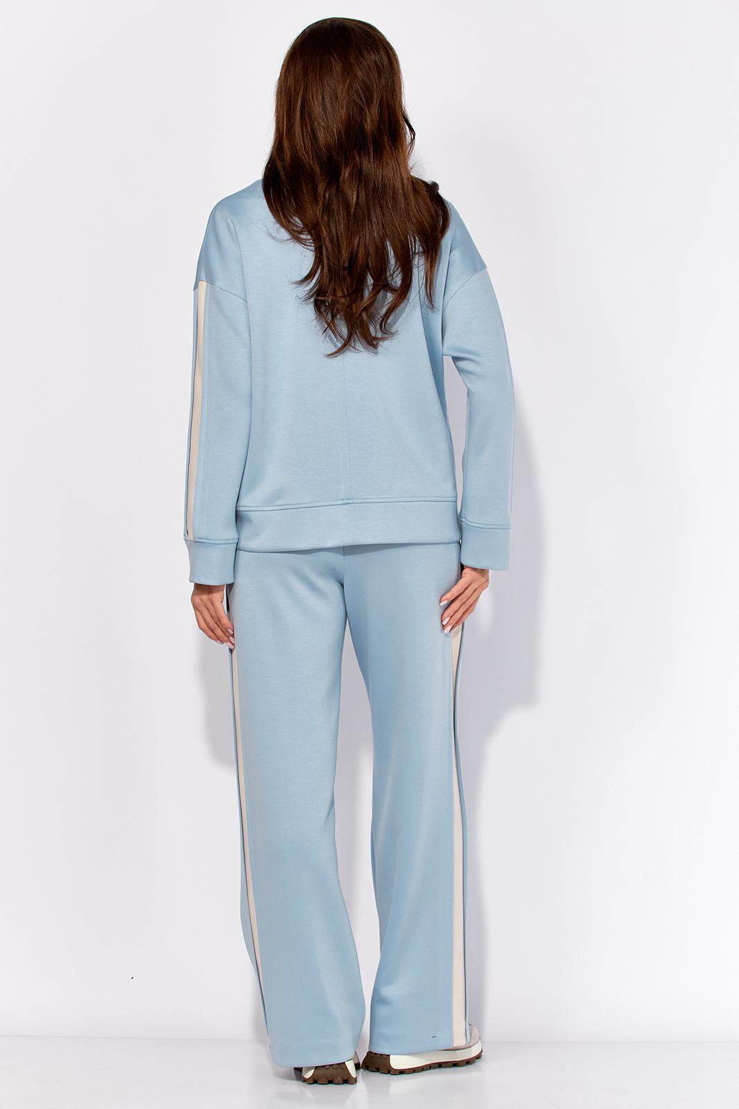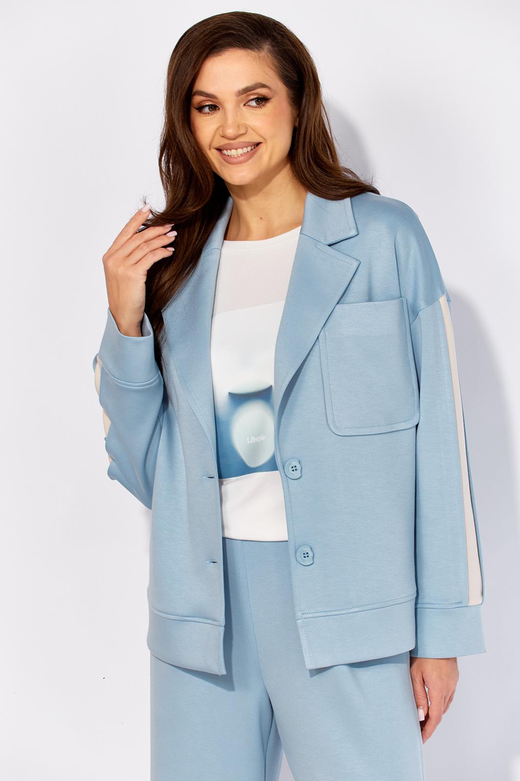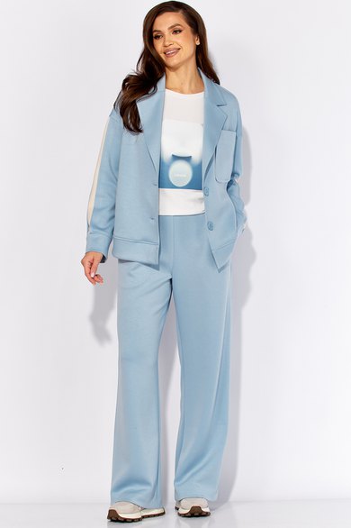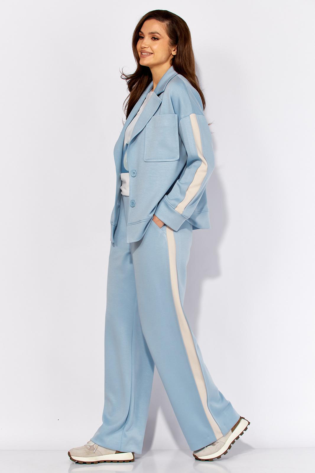 Комплект женский, 3х предметный, состоящий из жакета, топа и брюк. Жакет и брюки выполнены из трикотажного полотна T E N S E L, топ-хлопковый трикотаж (кулирка). Жакет прямого силуэта с длинным рукавом. Рукав со спущенной линией плеча, по низу манжета. По рукаву отделочный лампас со складками. Воротник отложной с лацканами. Застежка центральная на петли и пуговицы. На левой полочке накладной карман. По низу жакета отрезная планка. Спинка со средним швом. Брюки прямые, с наклонными карманами спереди и мягкими складками. По боку отделочный лампас со складками. Пояс притачной, с резинкой и гладкой центральной частью. Топ прямого силуэта, с коротким цельнокройным рукавом. Горловина круглая, с отрезной планкой. По переду топа яркий принт