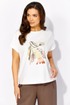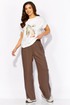Комплект женский, 3х предметный, состоящий из куртки брюк и топа. Куртка-парка, облегченная, без подкладки, прямого силуэта. Рукав реглан, длинный, по низу на резинке. Горловина оформлена капюшоном с кулисой. По переду карманы в рельефах. Застежка центральная, потайная, на петли и пуговицы. Низ куртки регулируется кулисой с фиксатором по бокам. Спинка без особенностей. Топ из трикотажного хлопкового полотна, прямого силуэта с коротким цельнокройным рукавом. Горловина круглая, с подрезной планкой. Перед задекорирован принтом. Брюки прямые, широкие. По переду наклонные карманы и ягкие складки. Пояс притачной, по центру гладкий, дальше с резиной. В брюках подкладка (шорты)
