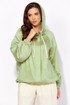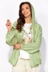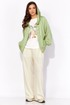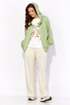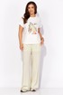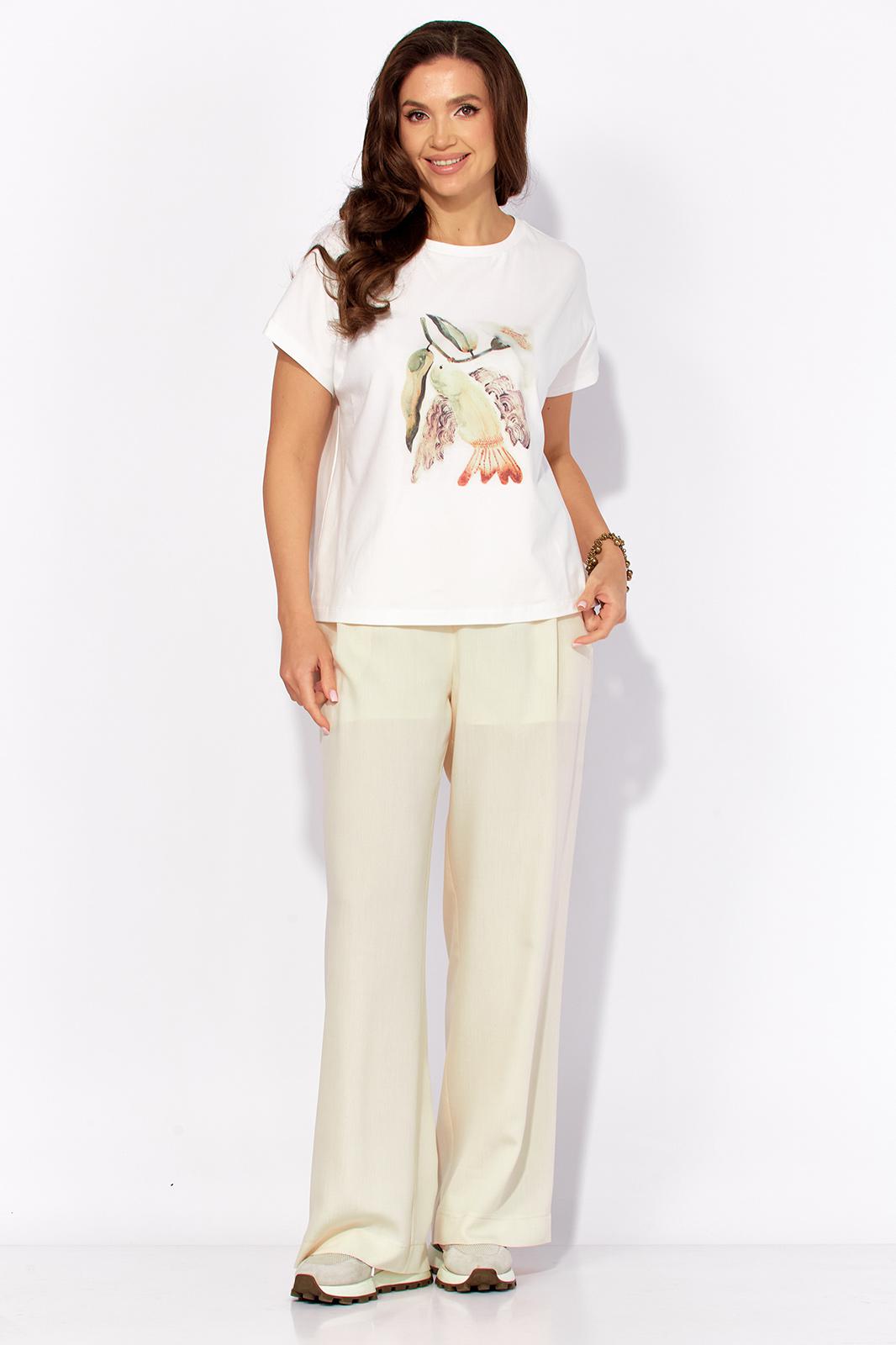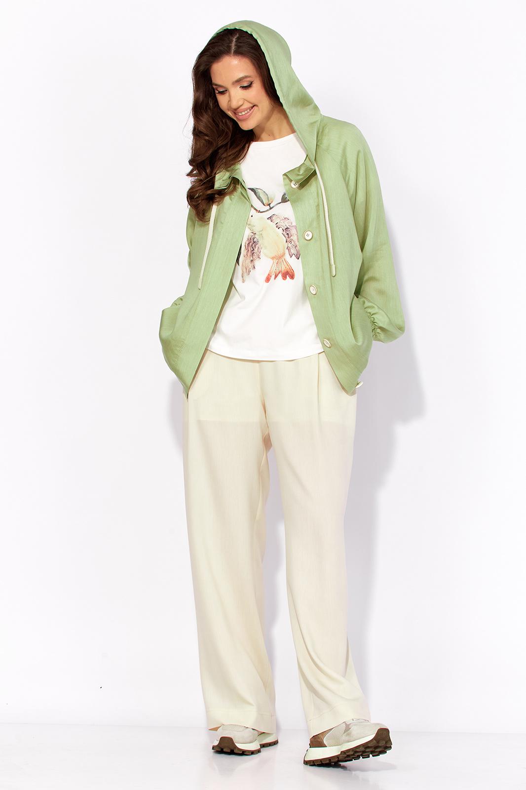 Комплект женский, 3х предметный, состоящий из куртки брюк и топа. Куртка-парка, облегченная, без подкладки, прямого силуэта. Рукав реглан, длинный, по низу на резинке. Горловина оформлена капюшоном с кулисой. По переду карманы в рельефах. Застежка центральная, потайная, на петли и пуговицы. Низ куртки регулируется кулисой с фиксатором по бокам. Спинка без особенностей. Топ из трикотажного хлопкового полотна, прямого силуэта с коротким цельнокройным рукавом. Горловина круглая, с подрезной планкой. Перед задекорирован принтом. Брюки прямые, широкие. По переду наклонные карманы и ягкие складки. Пояс притачной, по центру гладкий, дальше с резиной. В брюках подкладка (шорты)