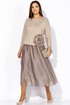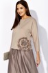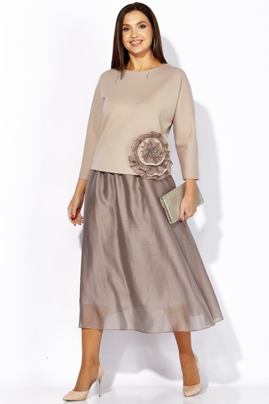 Комплект женский, 2х предметный, состоящий из блузки и юбки. Блузка полуприлегающего силуэта с цельнокройным рукавом длинной 3/4. Выполнена из трикотажного полотна тенсел. Вырез горловины лодочка По низу блузки, слева, декоративный элемент из рюши, в сочетании двух видов ткани. По спинке средний шов. Юбка широкая к низу, из текстильной ткани вуалька На подкладке. Пояс притачной с резинкой по кругу.