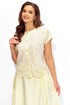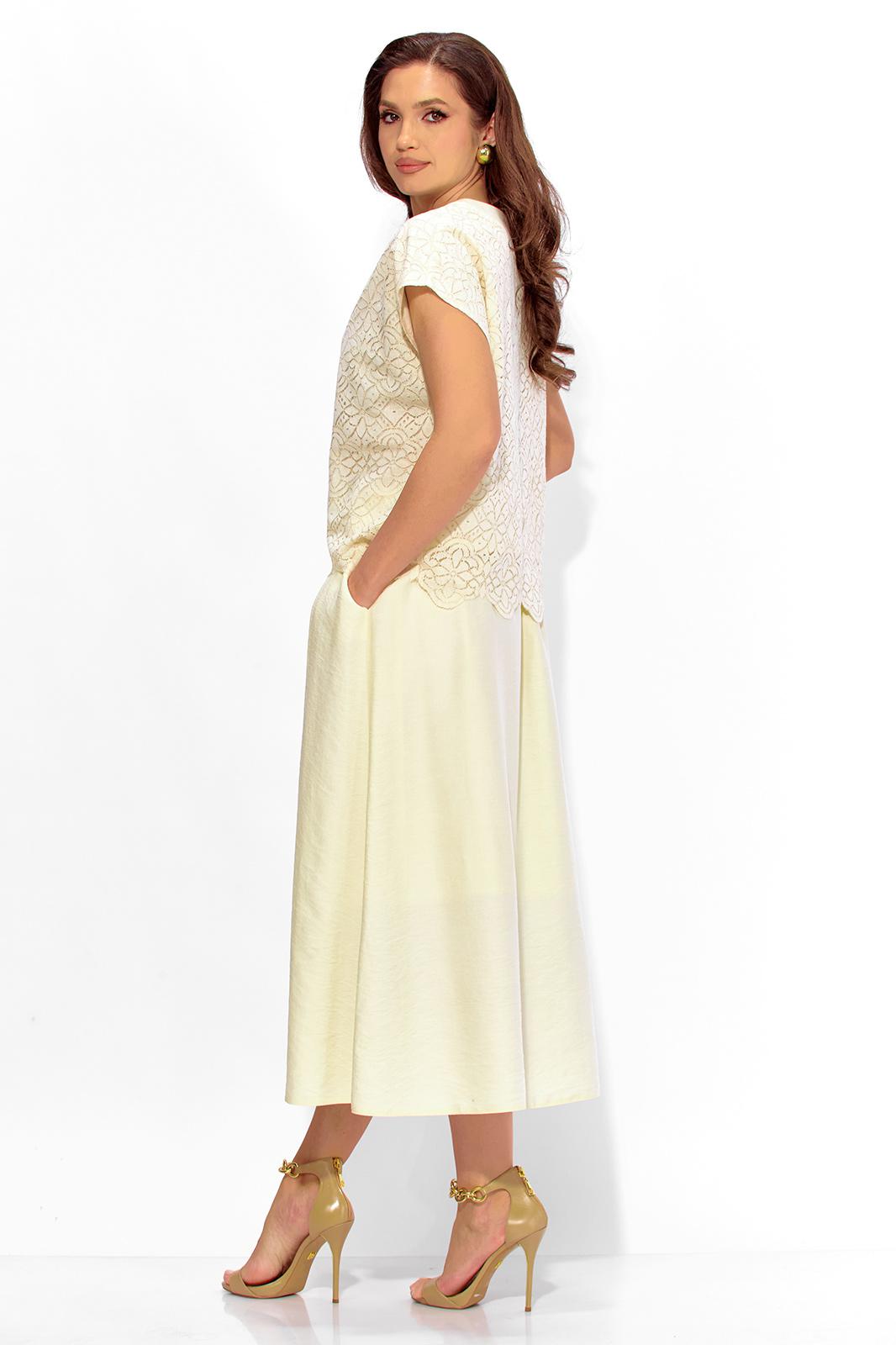 Комплект женский, 2х предметный, состоящий из блузки и юбки. Блузка выполнена из кружевного полотна, с отделочной тканью, на хлопковой подкладке. Блузка прямого силуэта, с цельнокройным коротким рукавом. Вырез горловины круглой формы с отделочной планкой. Застежка центральная, с планкой, на петли и пуговицы. Низ блузки фигурный. Юбка расширенная, из текстильной вискозной ткани, на хлопковой подкладке. По переду мягкие встрачные складки и наклонные карманы. Пояс притачной, по переду гладкий, сзади с резинкой. Комплект женский, 2х предметный, состоящий из блузки и юбки. Блузка выполнена из кружевного полотна, с отделочной тканью, на хлопковой подкладке. Блузка прямого силуэта, с цельнокройным коротким рукавом. Вырез горловины круглой формы с отделочной планкой. Застежка центральная, с планкой, на петли и пуговицы. Низ блузки фигурный. Юбка расширенная, из текстильной вискозной ткани, на хлопковой подкладке. По переду мягкие встрачные складки и наклонные карманы. Пояс притачной, по переду гладкий, сзади с резинкой.