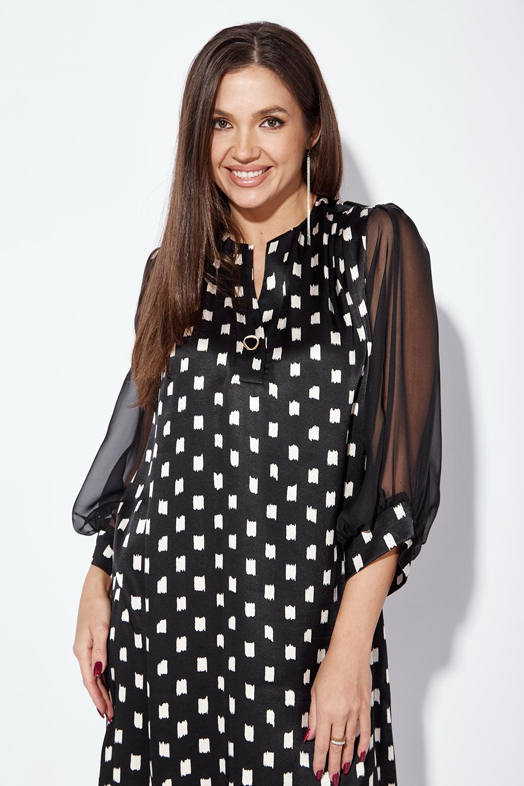 Платье женское, А силуэта, с втачным рукавом, длинной 3/4. Рукав расширенный к низу с разрезом по шву. Разрез зафиксирован на навесную петлю и отделочную пуговицу. Вырез горловины фигурной формы. Перед задекорирован вышивкой из пайеток. По спинке средний шов и талевые вытачки. Застежка на потайную тесьму молния в среднем шве.