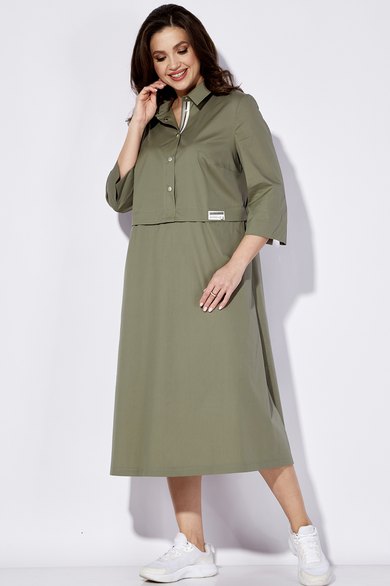 Платье женское, расширенное к низу, отрезное по талии. Рукав втачной , длиной 3/4 , по низу с разрезом на локтевом шве. По переду нагрудные вытачки. Воротник рубашечный на отрезной стойке. Застежка лифа платья центральная, на кнопки. Внутренняя планка акцентирована отделочной тесьмой. Спинка со средним швом. По низу лифа отлетная складка. Нижняя часть платья (юбка) расширенная, с карманами и разрезами по бокам.