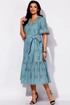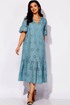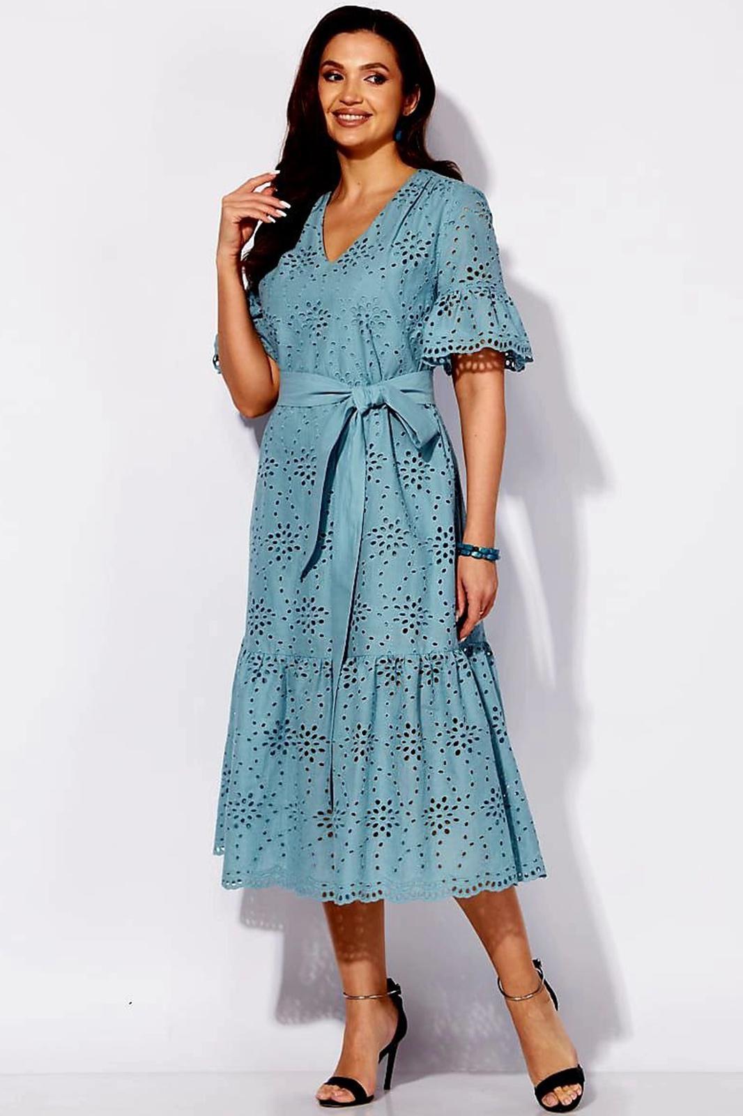 Платье женское, расширенное к низу, А образного силуэта, втачного покроя. Платье выполненоиз кружевного полотна на подкладке. Рукава до локтя с воланои по шву притачивания, по низу с каймой. По переду V образная горловина, кокетка переходящая на спинку, в швах в швах притачивания которой расположена сборка. По спинке кокетка. Низ платья оформлен воланом со сборкой и фигурной каймой. К платью прилагается пояс.