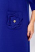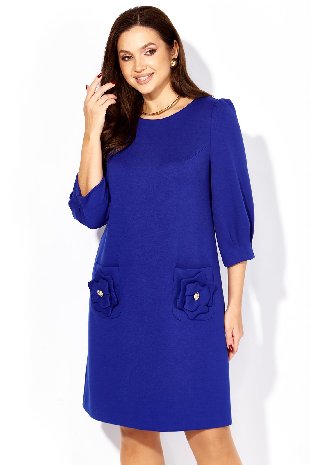 Платье женское, А силуэта, с рукавом длинной 3/4. Рукав втачной, со сборкой по окату, и мягкими складками по низу. По переду нагрудные вытачки. Вырез горловины круглой формы. Карманы накладные, акцентированы стилизированным цветком с декором. По спинке средний шов с отделочной нашивкой сверху.