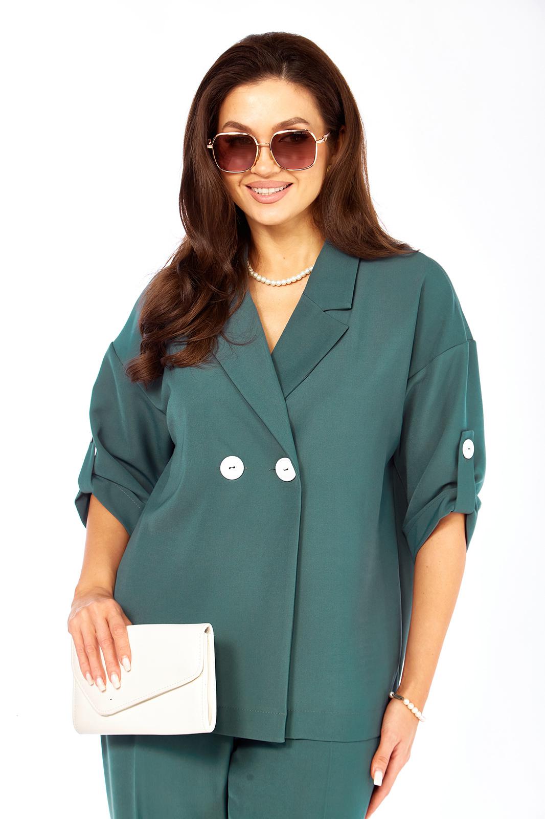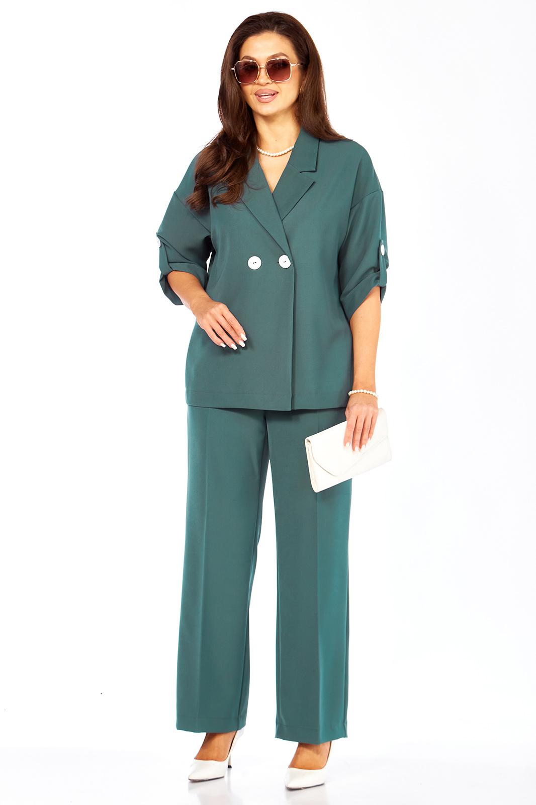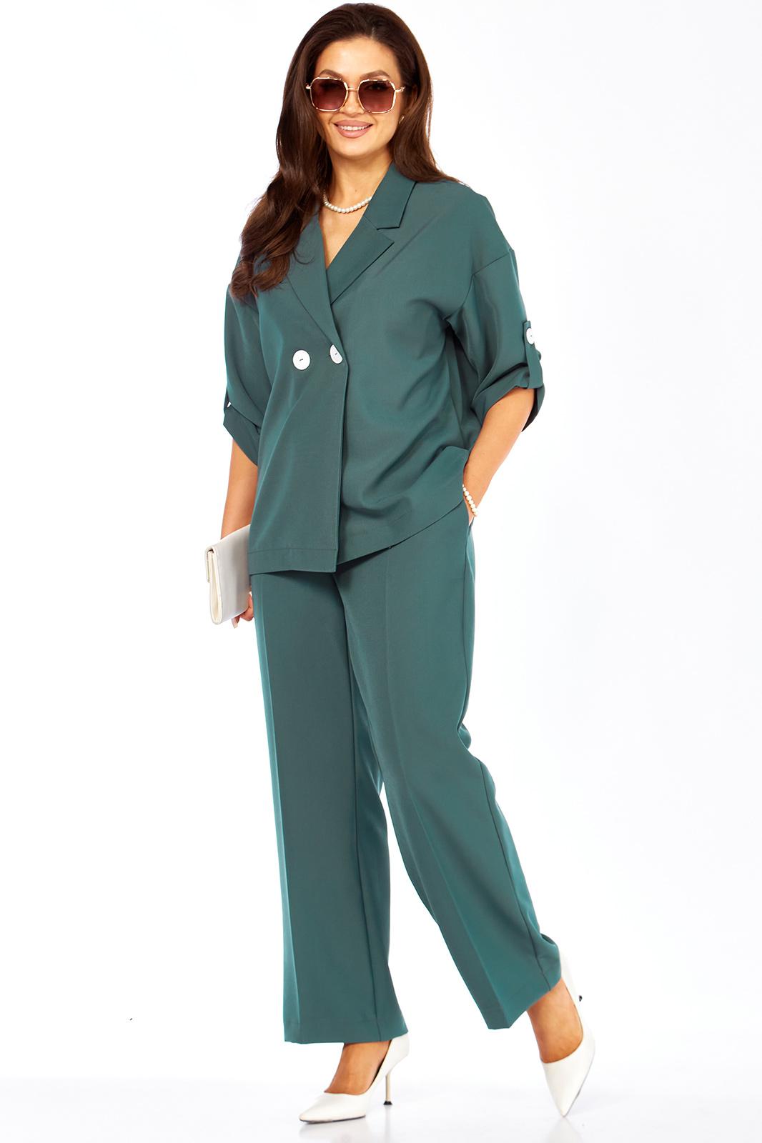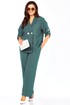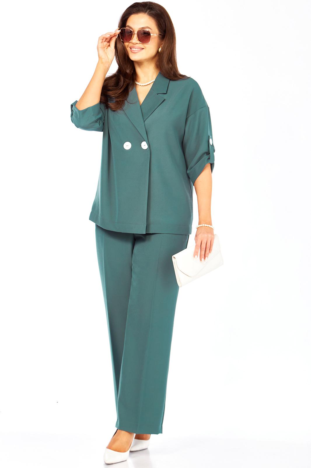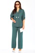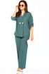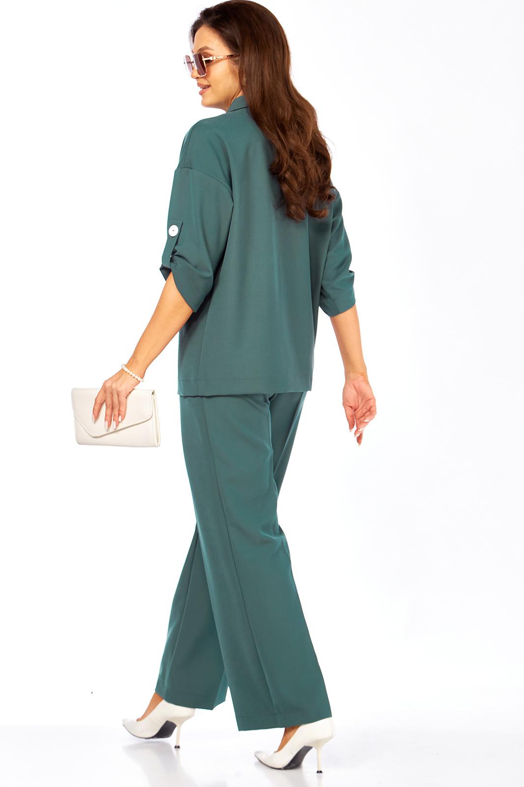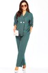 Очень стильный ,элегантный ,модный женский комплект . Состоит их брюк палаццо и жакета прямого силуэта , со спущенной проймой ,что придает свободу движению и комфорта при носке. Интересный дизайн жакета , двубортный с одним рядом крупных пуговиц контрастного цвета. Рукав на пате с пуговицей контрастного цвета меньшего размера. При желании рукав можно удлинить ,расстегнув пуговицу. Длина жакета по спинке от плеча — 70,5 см. Брюки палаццо прямые с функциональными карманами, сзади на резинке. Длина брюк -101 см.