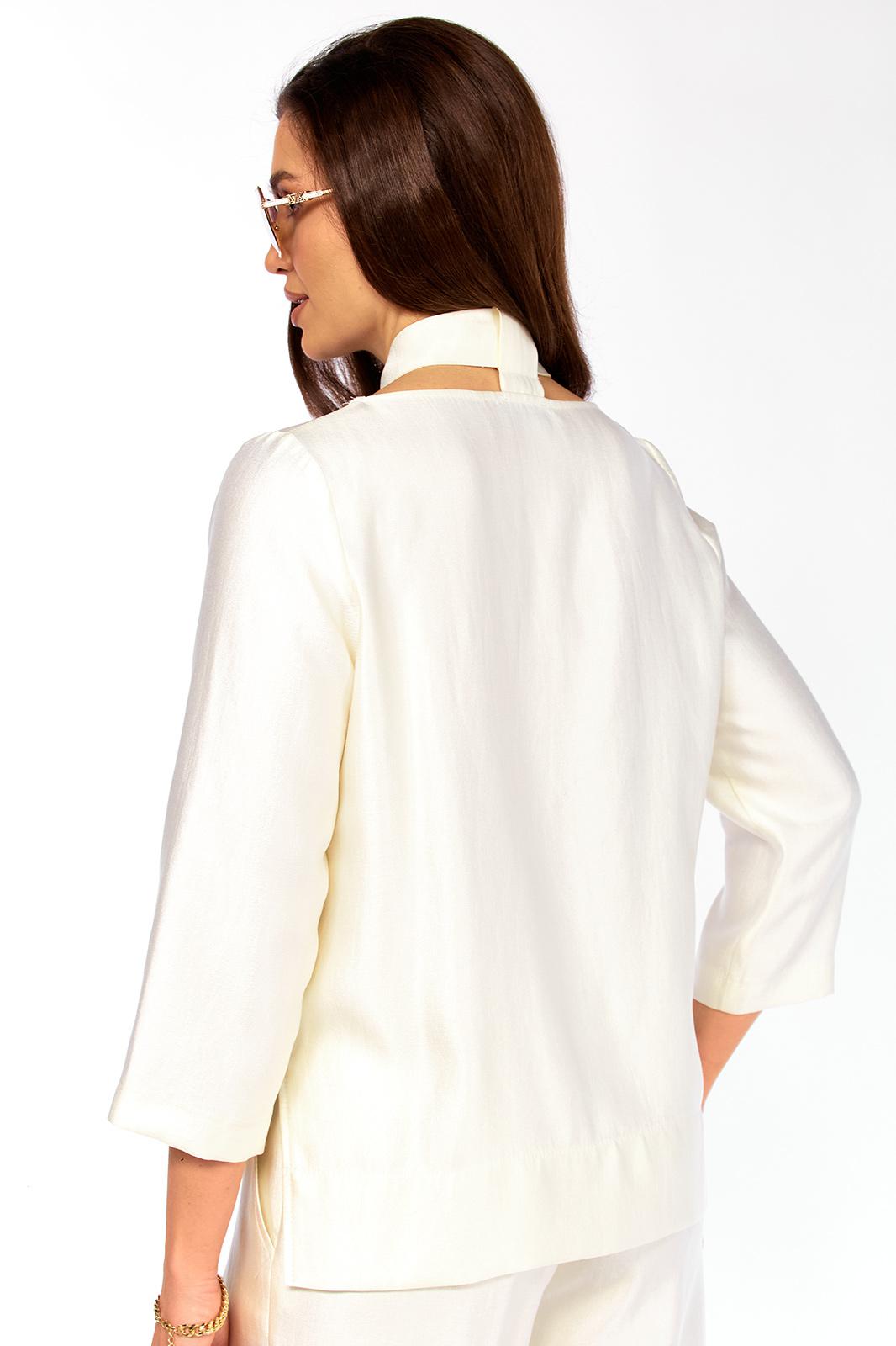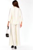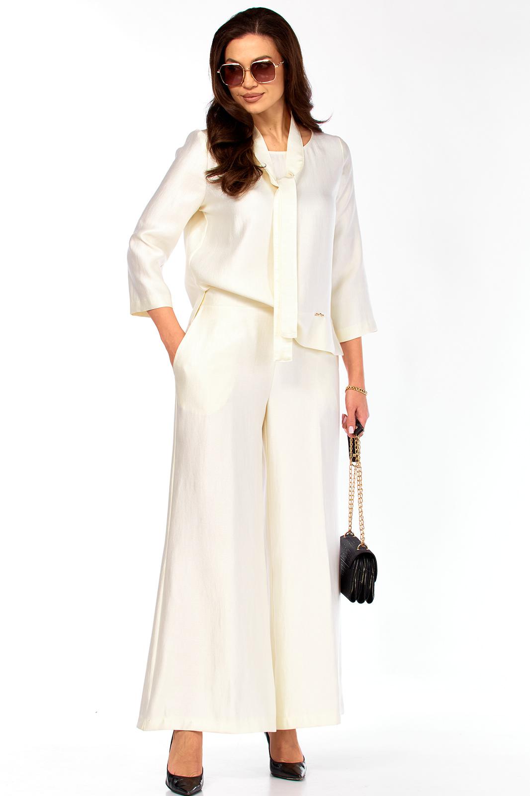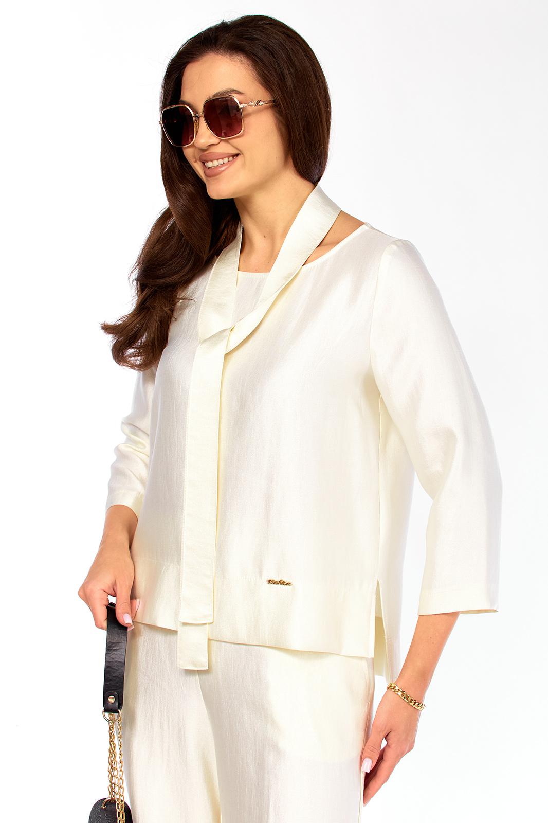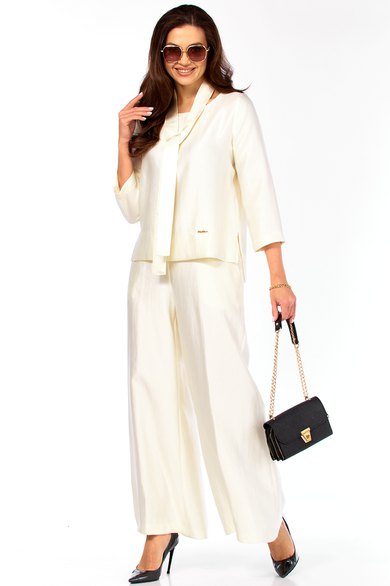 Стильный, оригинальный, красивый, удобный комплект, подходит как для торжественного случая,так и для повседневной носки. Обращаем ваше внимание на блузон, он с очень интересным вырезом, со спинки переходящий в шарфик, у которого много вариантов носки, что придает стильный образ изделию. Рукав втачной 7/8 -50 см. По спинке блузон от плеча 67 см, длиннее переда на 9 см. Брюки стильные, с расширением от бедер, пояс сзади на резинке. Длина брюк -104 см. Рост модели 173 см.