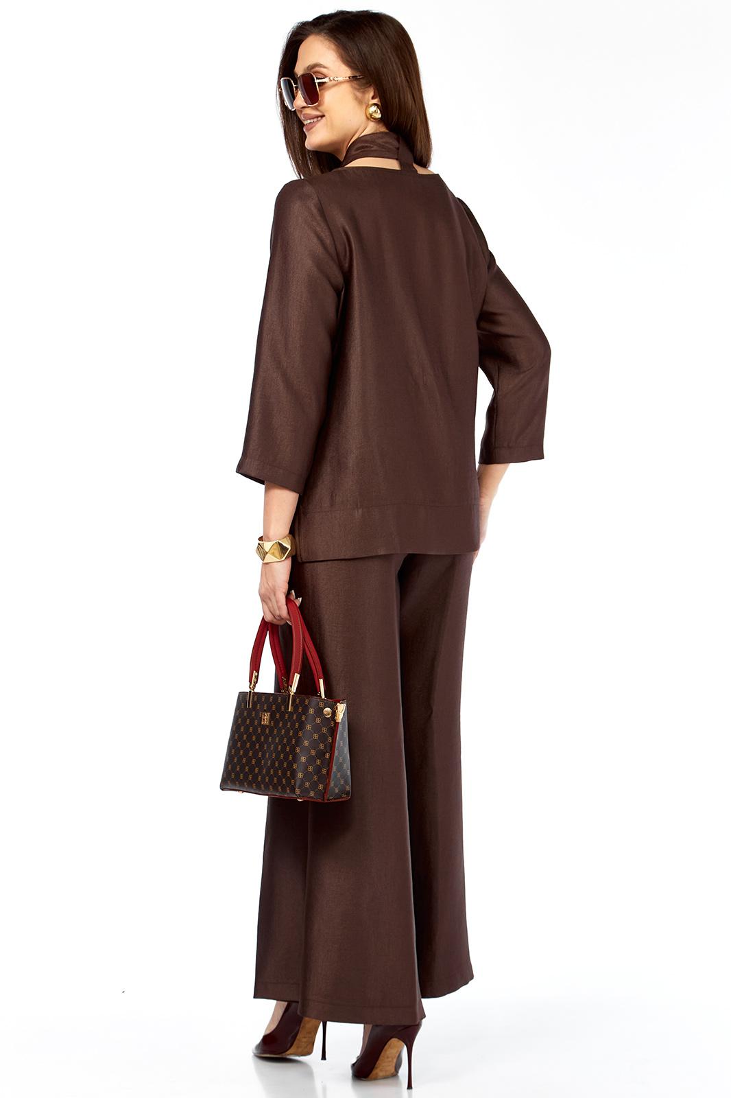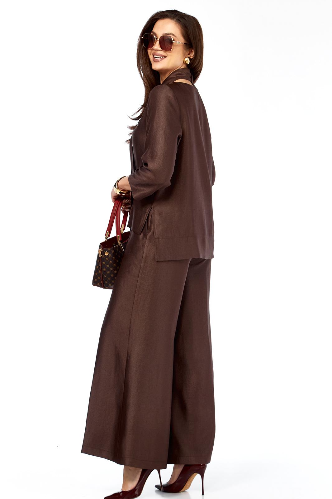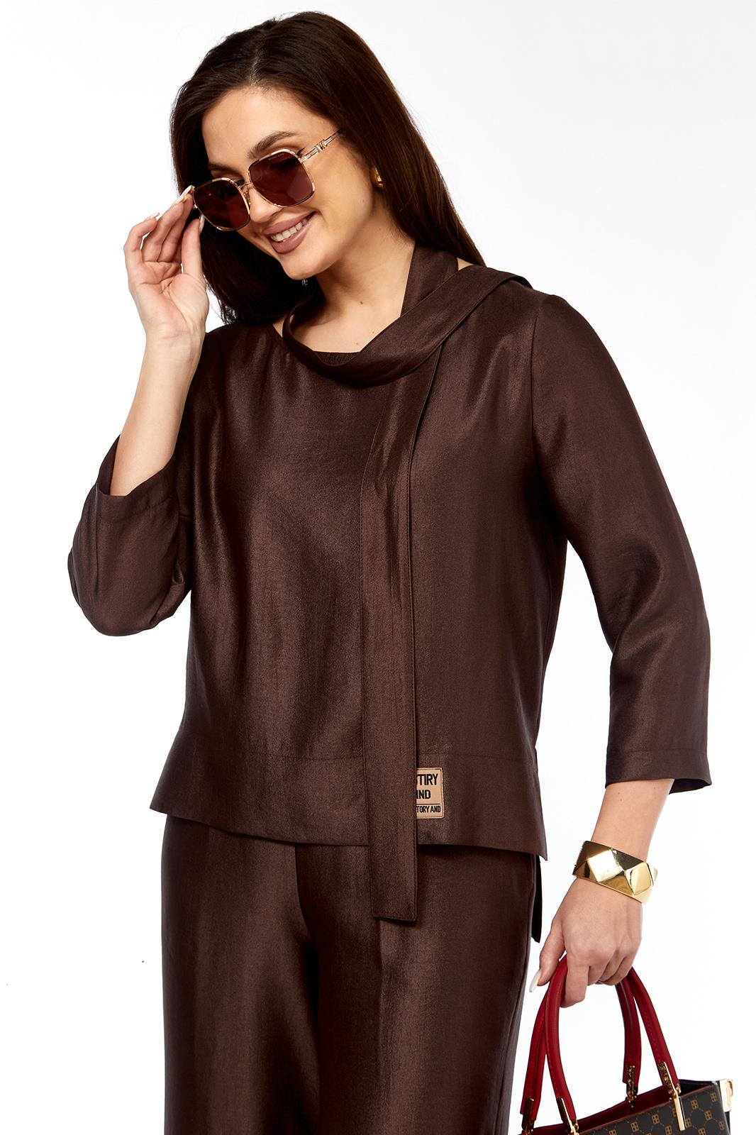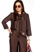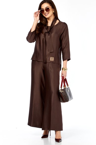 Стильный, оригинальный, красивый, удобный комплект, подходит как для торжественного случая,так и для повседневной носки. Обращаем ваше внимание на блузон, он с очень интересным вырезом, со спинки переходящий в шарфик, у которого много вариантов носки, что придает стильный образ изделию. Рукав втачной 7/8 -50 см. По спинке блузон от плеча 67 см, длиннее переда на 9 см. Брюки стильные, с расширением от бедер, пояс сзади на резинке. Длина брюк -104 см. Рост модели 173 см.