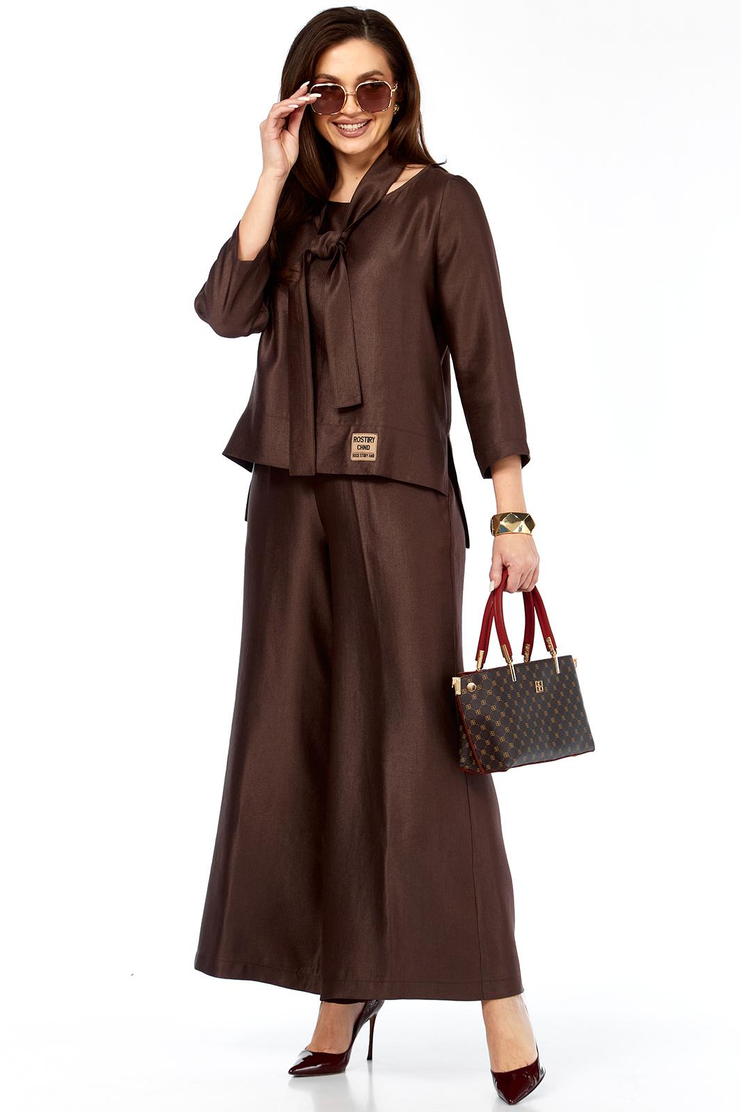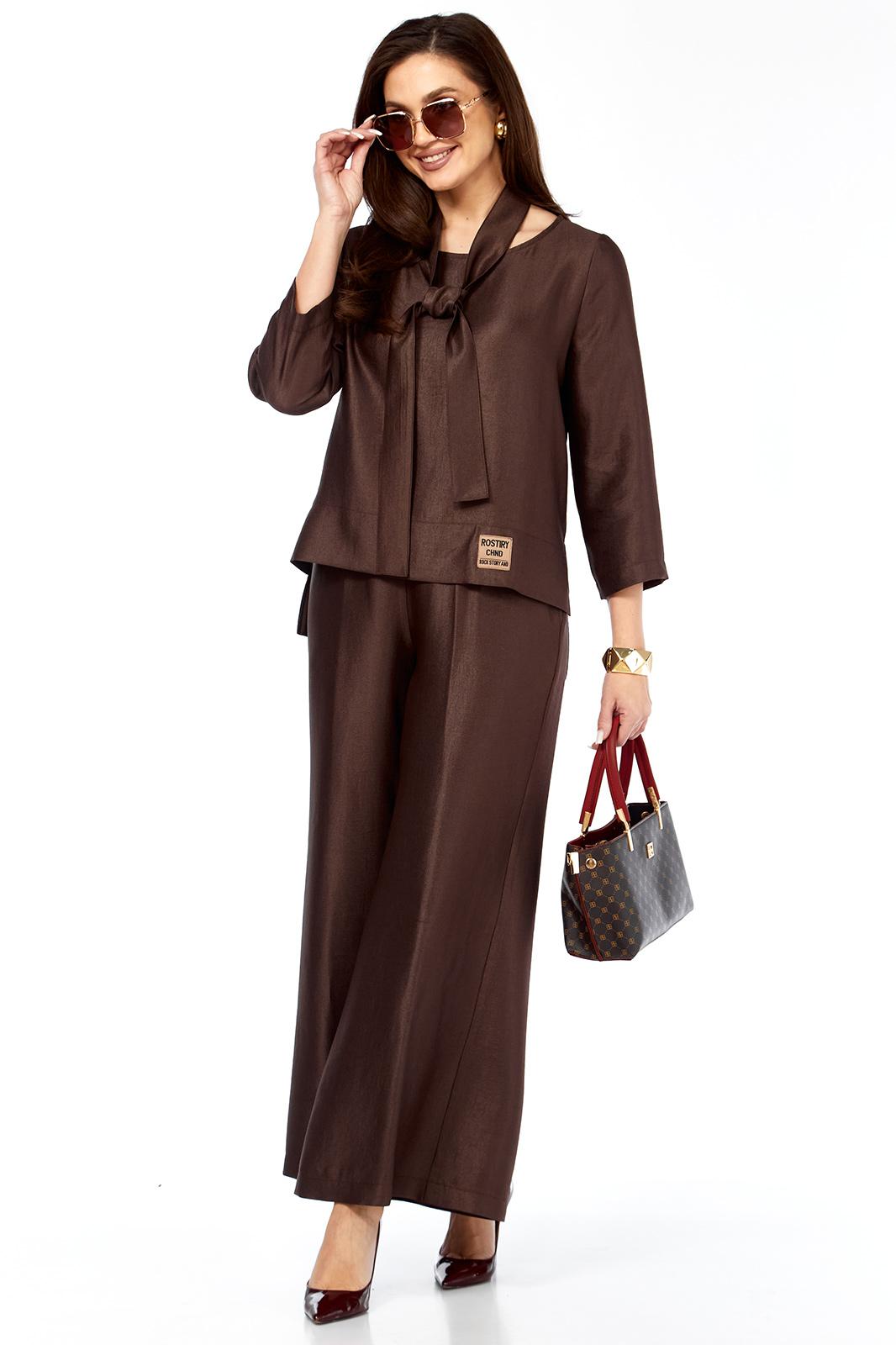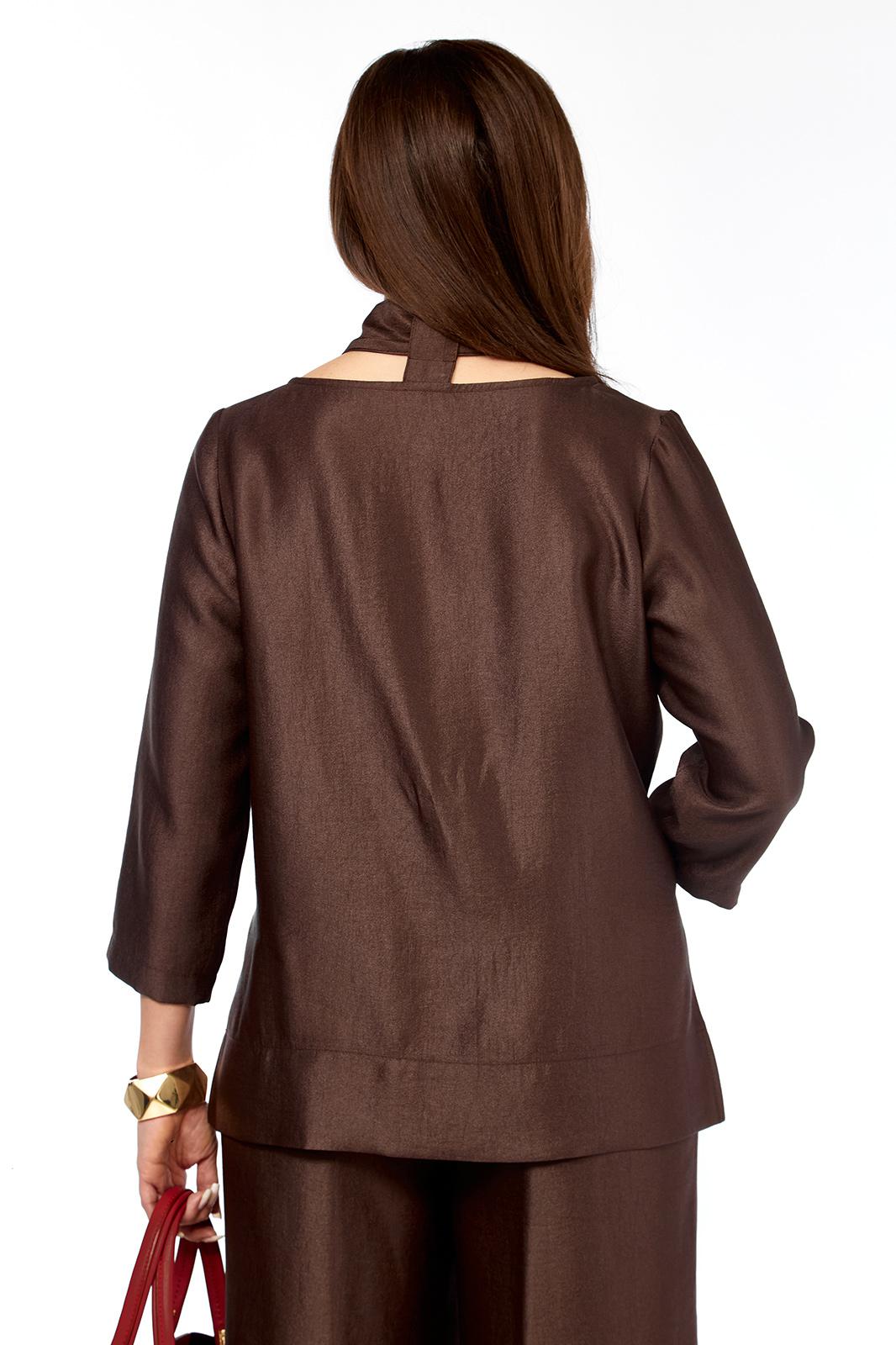 Стильный, оригинальный, красивый, удобный комплект, подходит как для торжественного случая,так и для повседневной носки. Обращаем ваше внимание на блузон, он с очень интересным вырезом, со спинки переходящий в шарфик, у которого много вариантов носки, что придает стильный образ изделию. Рукав втачной 7/8 -50 см. По спинке блузон от плеча 67 см, длиннее переда на 9 см. Брюки стильные, с расширением от бедер, пояс сзади на резинке. Длина брюк -104 см. Рост модели 173 см.