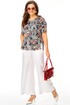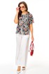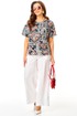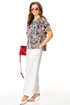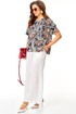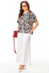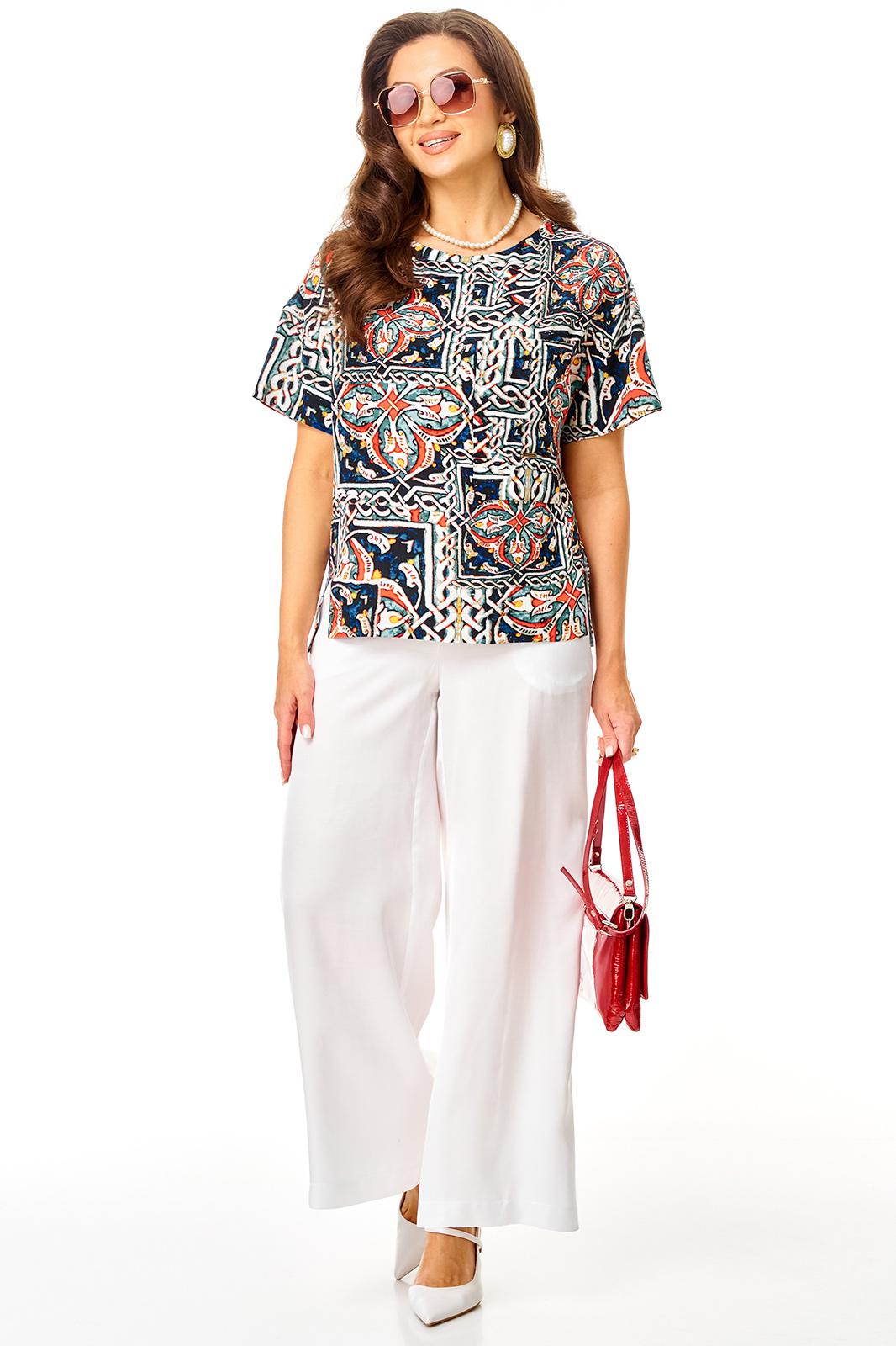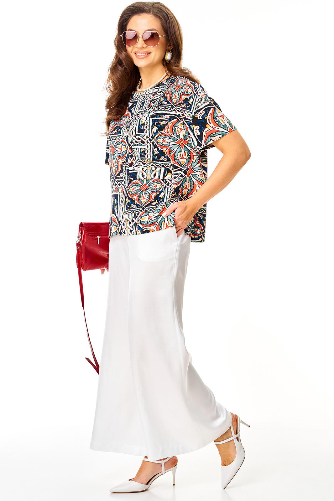 Стильный, легкий, из натуральной ткани вискоза летний комплект, состоит из стильных брюк и блузона. Блузон прямого силуэта, с разрезиками по бокам, спереди интересный функциональный карман. По спинке двойная кокетка. Длина блузона по спинке от плеча 64 см. Брюки стильные, с расширением от бедер, пояс сзади на резинке, по бокам функциональные карманы. Длина брюк -104 см.