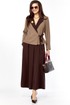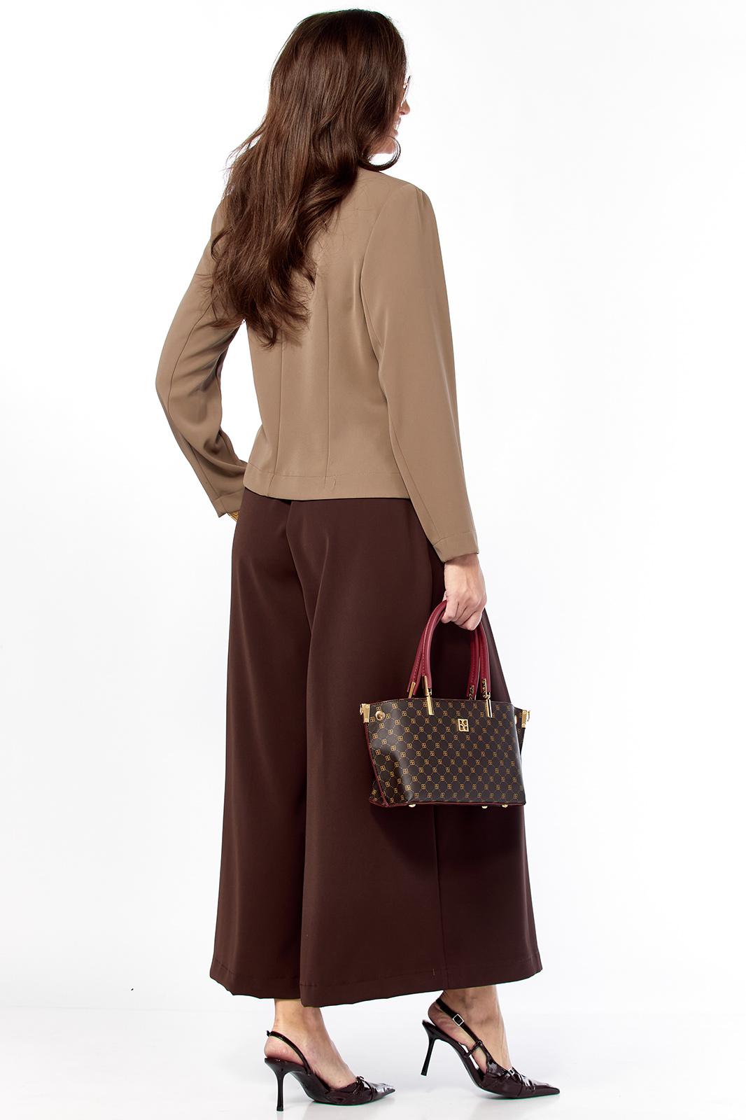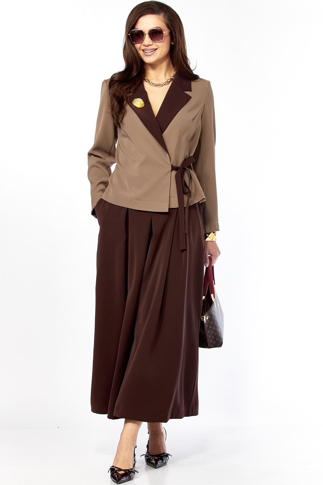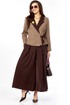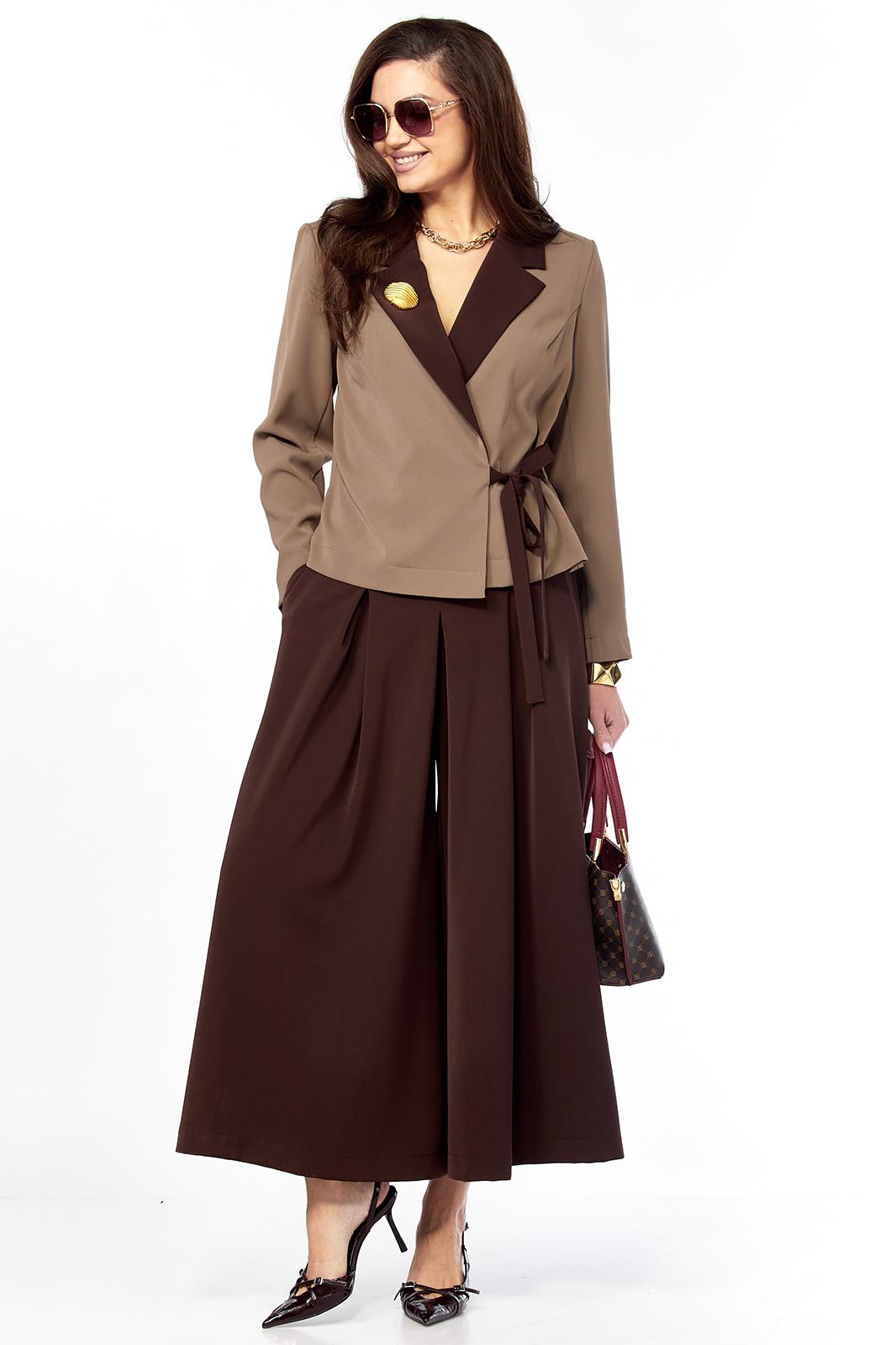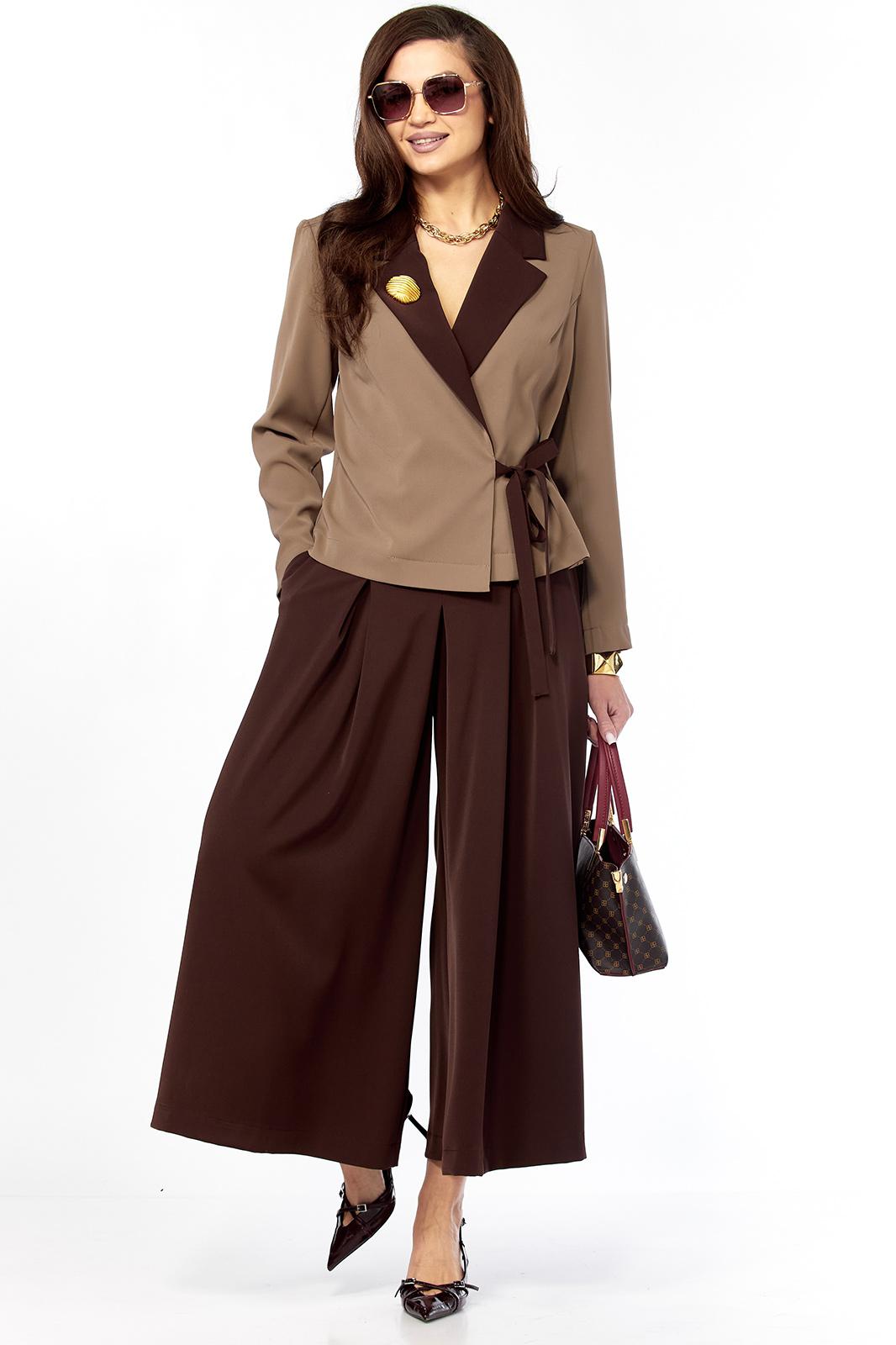Очень стильный, элегантный, модный женский комплект, состоит из юбки-брюк ( кюлоты ) и жакета . Жакет с воротником контрасного цвета ,в цвет юбки-брюк , с поясом застежкой , тоже контрастного цвета Втачной рукав - 60 см/ Длина жакета по спинке от плеча — 57 см( р 46-50) и 59 см ( р52-56). На воротнике красивая пуговица золото-метал крупная , что придает элегантность комплекту. Очень интересный фасон кюлот, с хорошей посадкой, с первого взгляда похожи на юбку. Длина кюлот- 95 см.