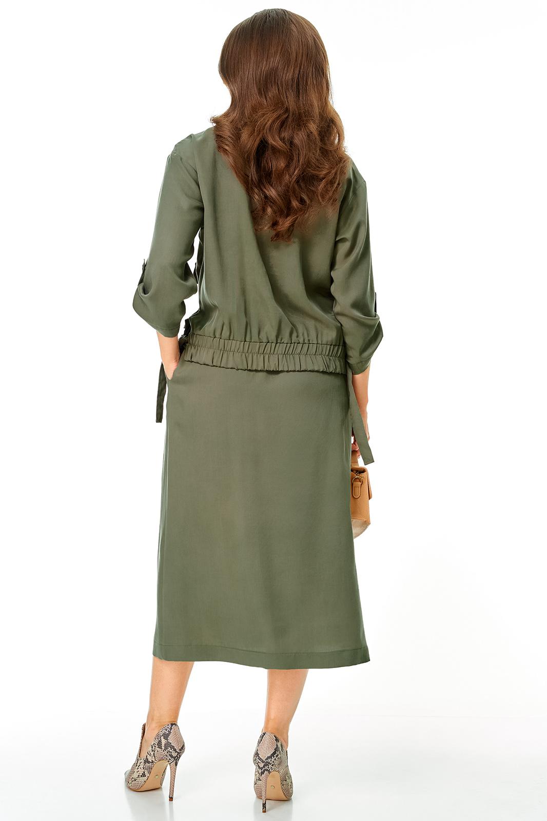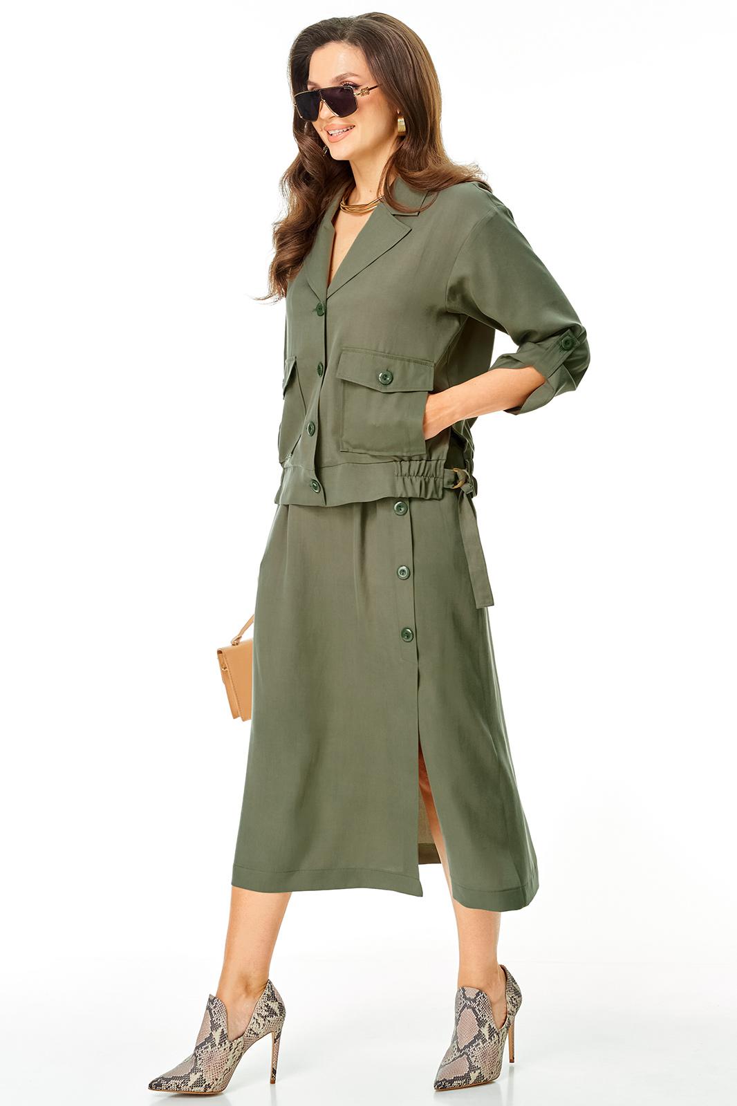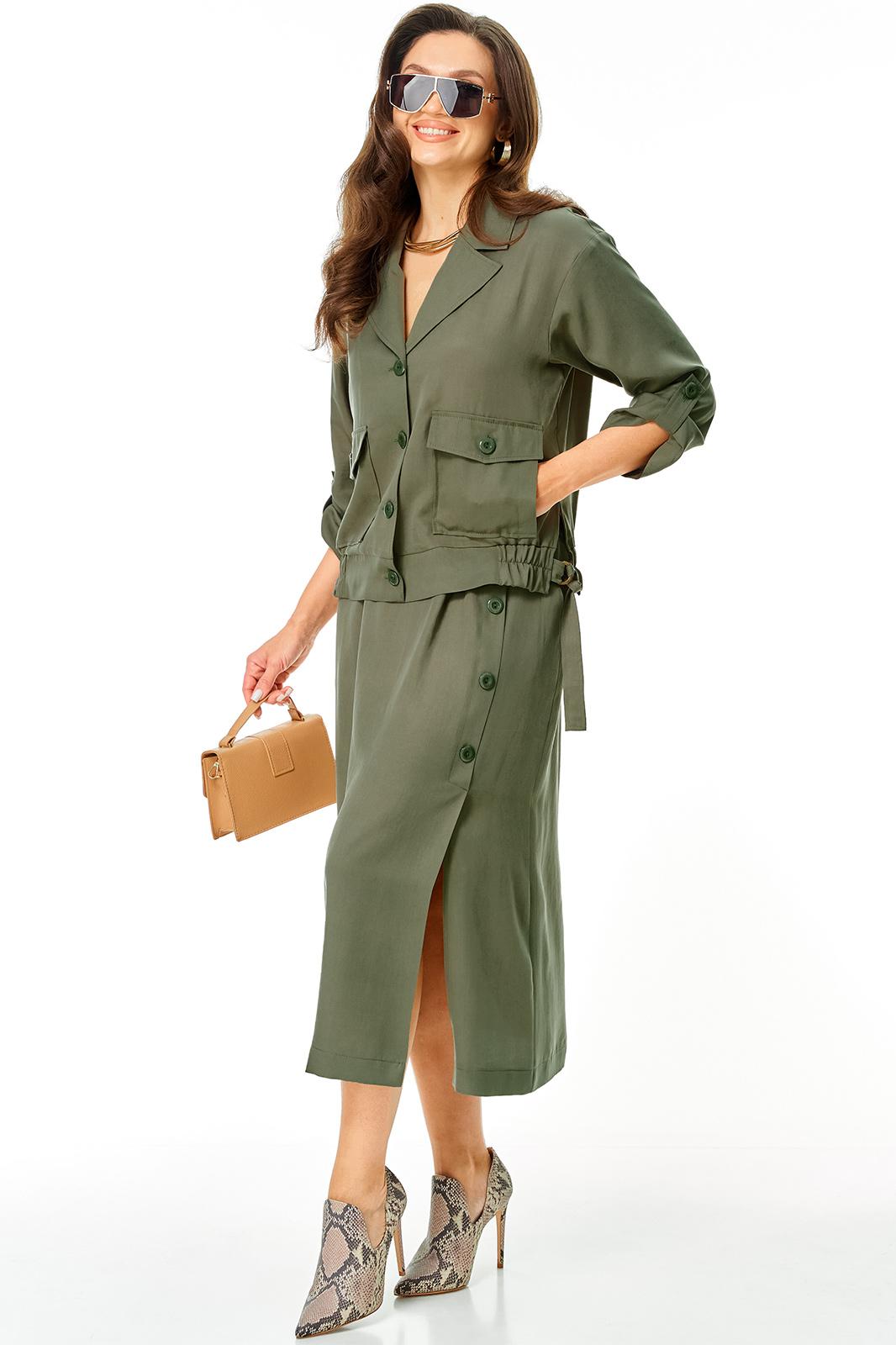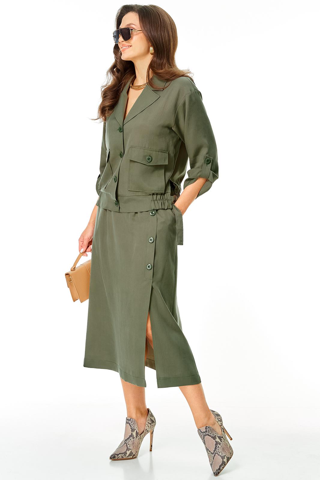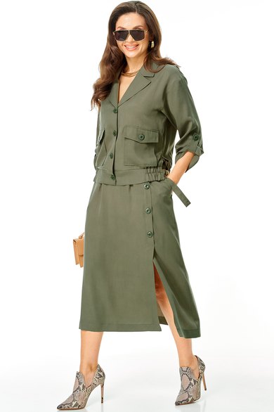 Очень стильный, красивый летний комплект из натуральной ткани Тенсель. Жакет со спущенной проймой и патами снизу, при желании можно удлинить рукав. Обратите внимание на карманы, у которых вход сбоку. По бокам жакет на полукольцах и шлевкой. По низу планка на широкой резинке. Длина жакета по спинке 60 см. Юбка по переду с двумя неглубокими складками, сбоку на планке с тремя пуговицами. Пояс сзади на резинке , по бокам функциональные карманы. Длина юбки — 84 см.
