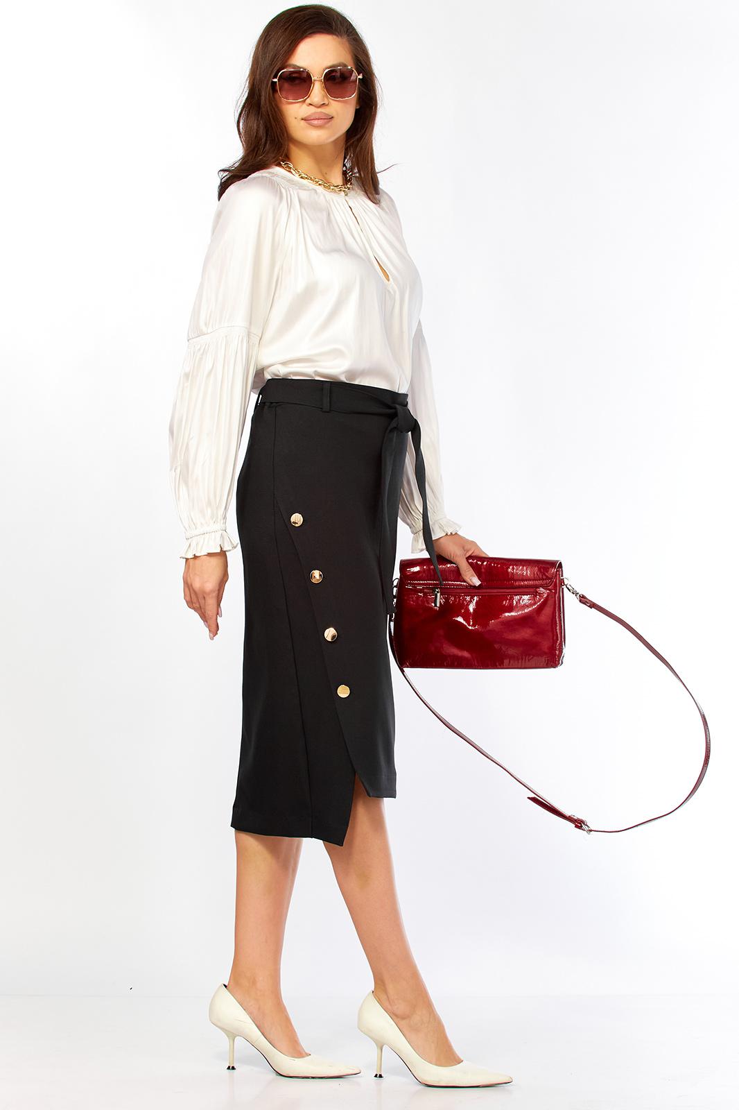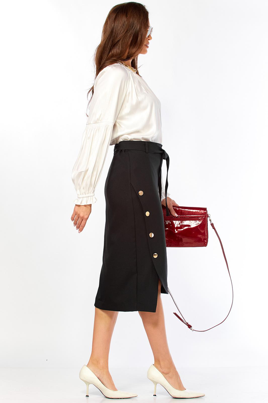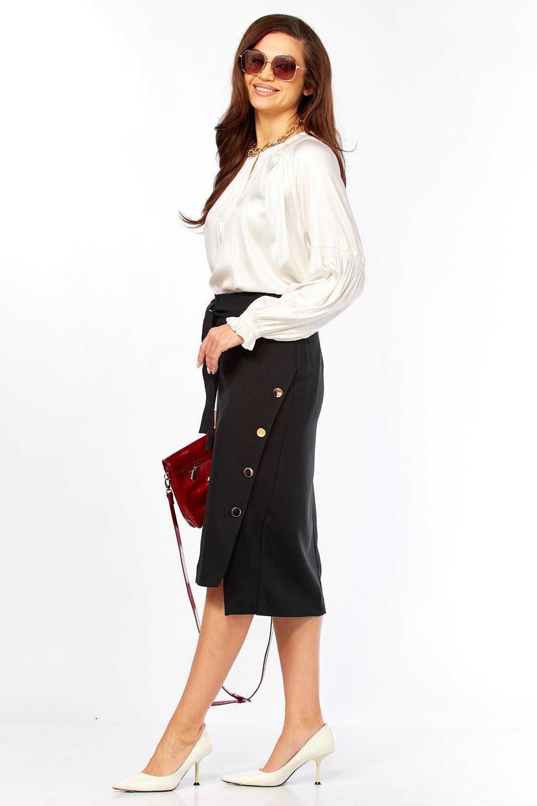Очень стильная, красивая, элегантная женская юбка из очень качественной ткани Надия. Интересный дизайн юбки, по переду вставка с декоративными пуговицами золото-метал. Заужена к низу ,что придает просто шикарный вид. Юбка по переду -65 см , по спинке -74,5 см. Пояс со шлевками и поясом, по бокам на резинке.