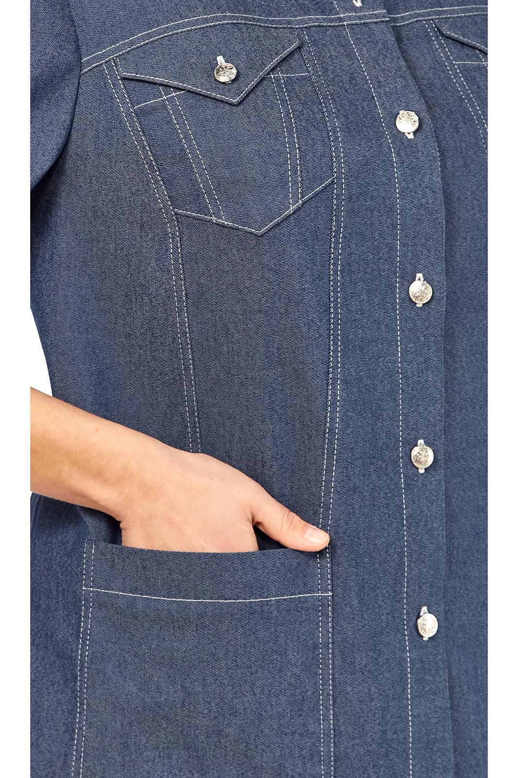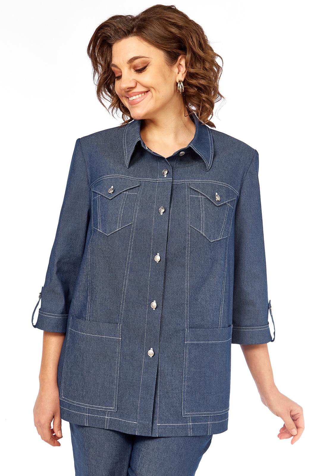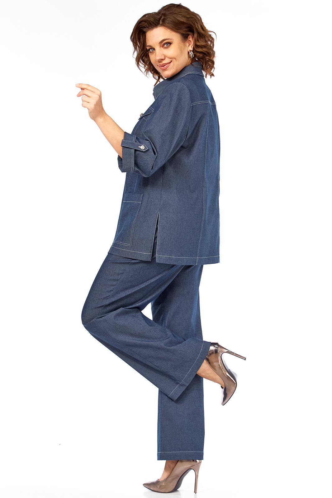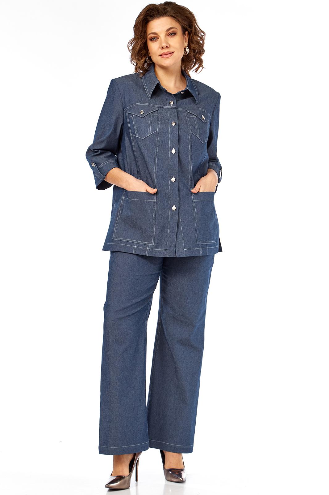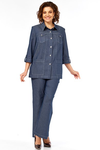 Стильный комплект-двойка из хлопкового облегчённого джинса с эластаном. Свободный крой рубашки и брюк обеспечивает максимальный комфорт. Подходит для создания повседневных образов в сочетании с любой обувью и аксессуарами. Рубашка с центральной бортовой застёжкой на 6 петель и пуговиц. На полочках обработаны кокетки, рельефные швы, карманы. Спинка с кокеткой, рельефными швами. В боковых швах обработаны разрезы. Рукав втачной, одношовный, с цельнокроеной манжетой и застёгивающейся патой. Воротник стояче-отложной со стойкой. Брюки прямые, на притачном поясе с пуговицей, шлёвками и резинками в районе боковых швов. На передних половинках обработаны функциональные карманы. На задних половинках — кокетки, накладные карманы.