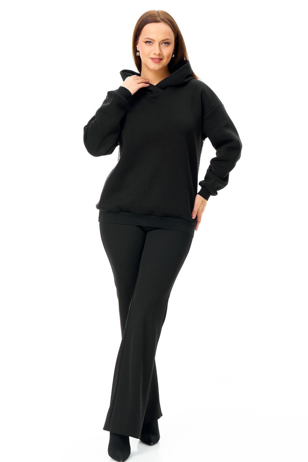 Брюки из трикотажного утепленного полотна в мелкий рубчик со стрейчем. Брюки хорошо тянуться по ширине. Полуприлегающего силуэта, слегка расширены от колена. Зрительно удлиняют ноги. Высокая посадка на талии, застежка молния сбоку, по поясу спинки резинка.