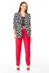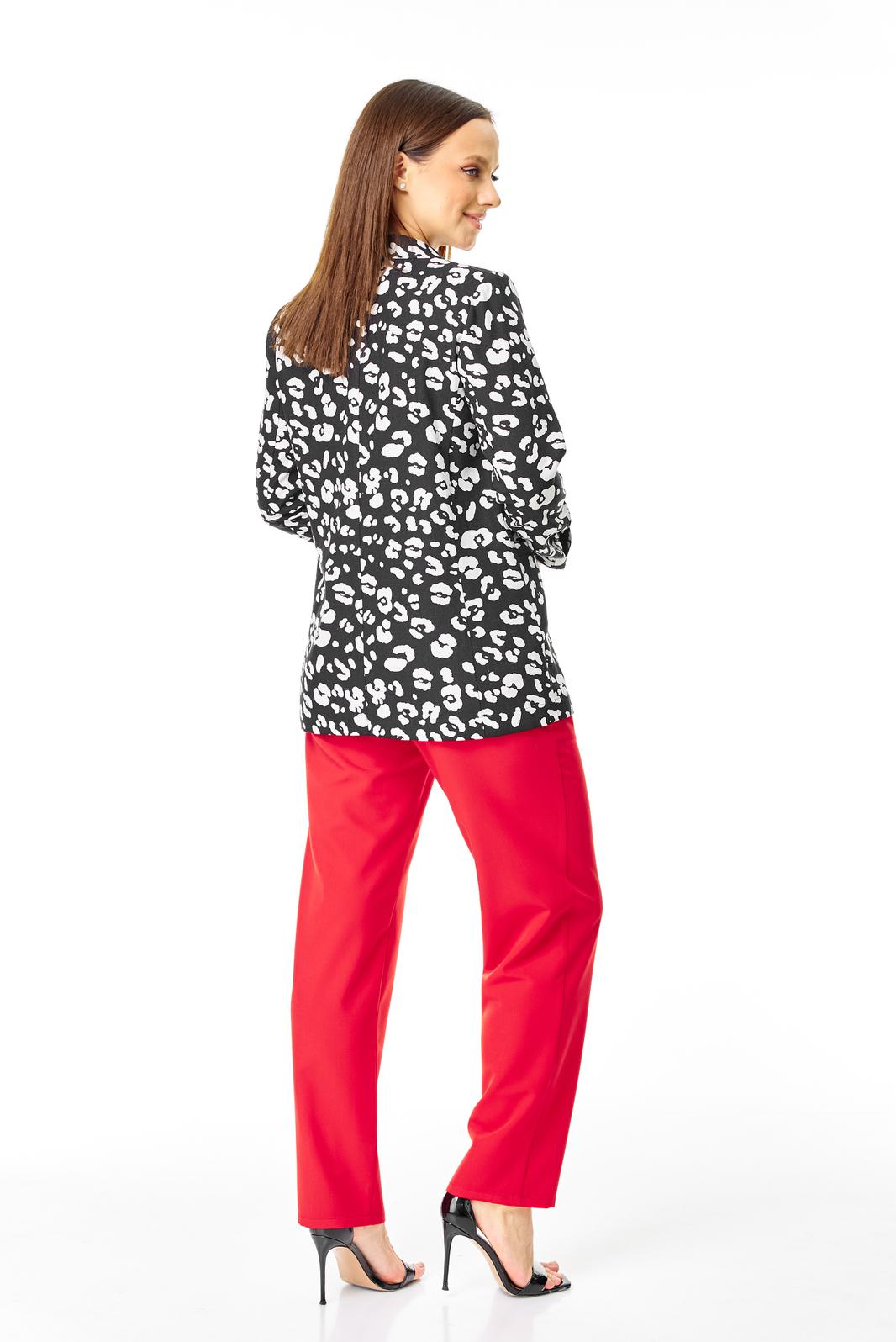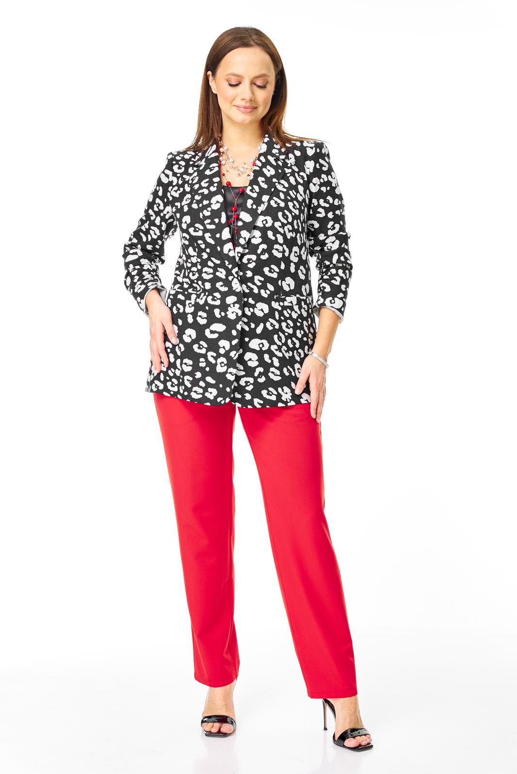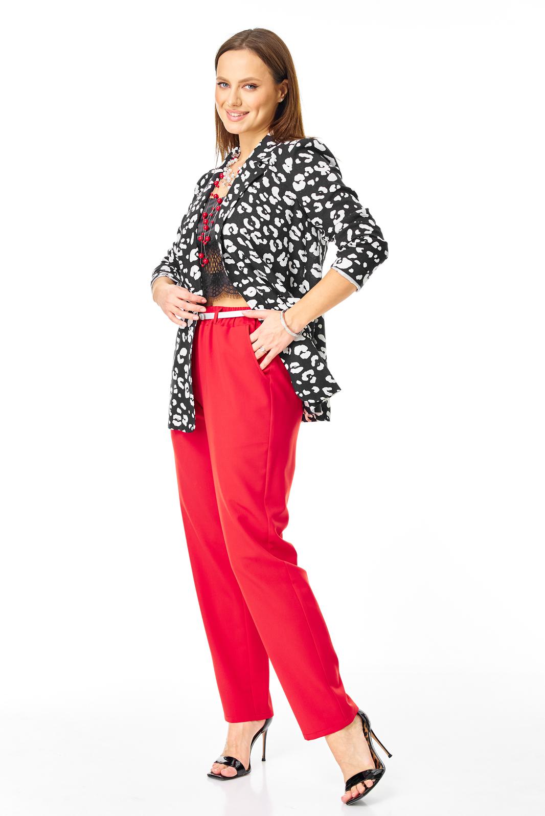 Стильный легкий костюм в дизайнерском цветовом решении состоит из хлопкового жакета и брюк из поливискозы с акцентом на ремень.