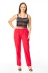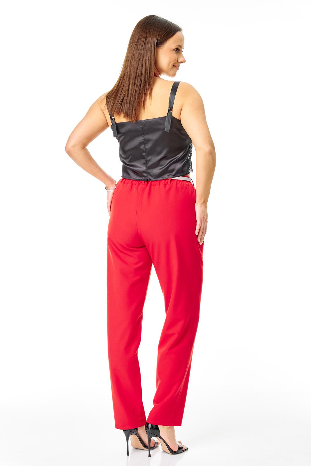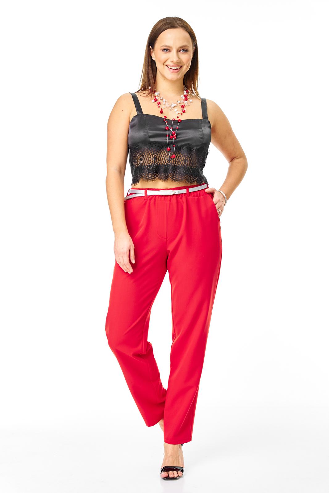 Комплект в страстном цветовом сочетании состоит из черного атласного корсета на бретелях и удобных зауженных брюк в красном цвете с ремнем из серебристой экокожи.