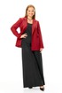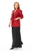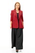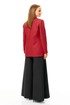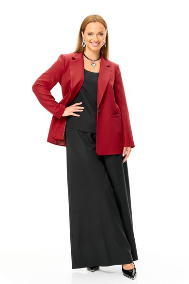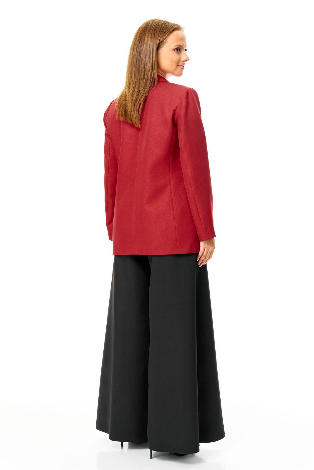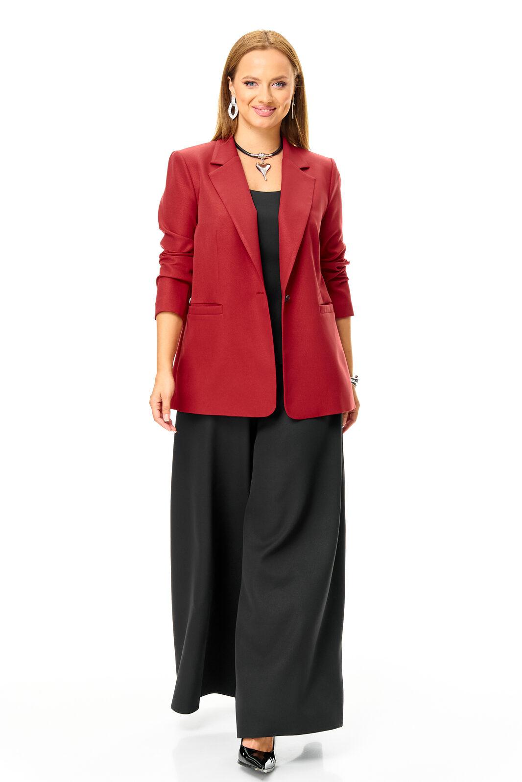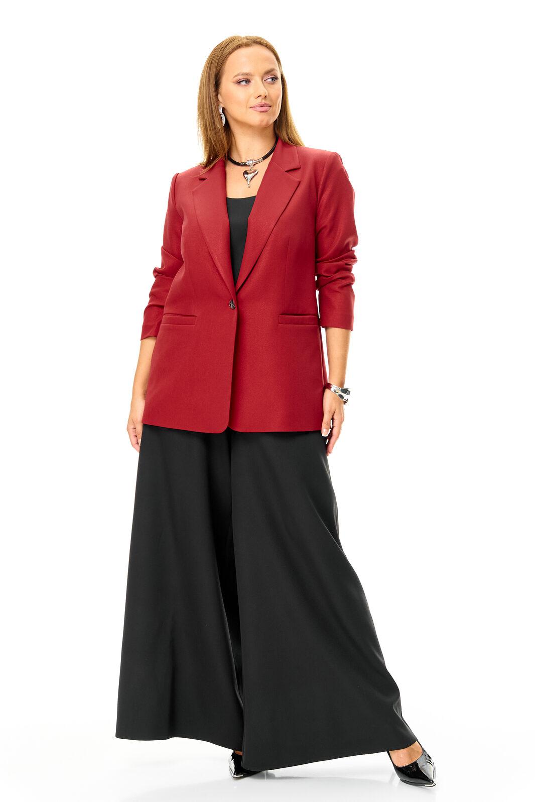 Яркий стильный жакет на жаккардовой подкладке в комплекте струящихся черных брюк и блузы.
