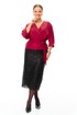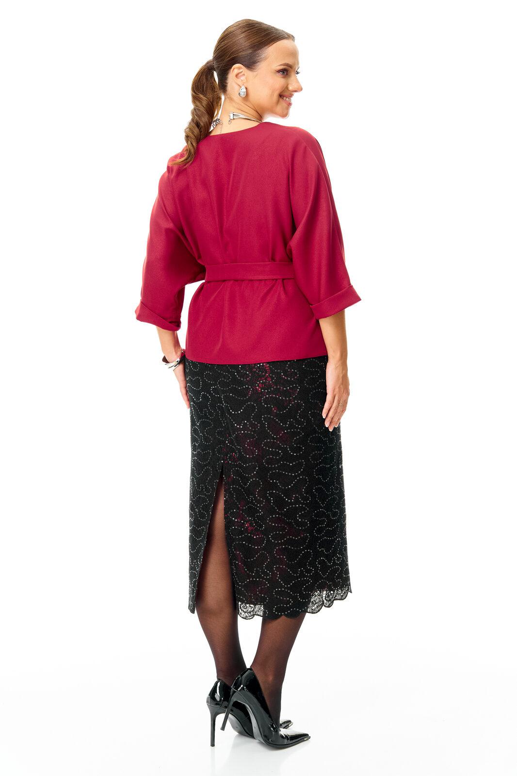 Юбка из плотного черного кружева на красной саржевой подкладке зауженная к низу с разрезом по спинке. Застежка «потайная молния» по среднему шву спинки.