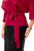 Блуза свободного силуэта. Горловина «на глубокий запах». Рукав цельнокроеный с манжетой. По низу переда планка, через которую протянут пояс. Спинка прямая.