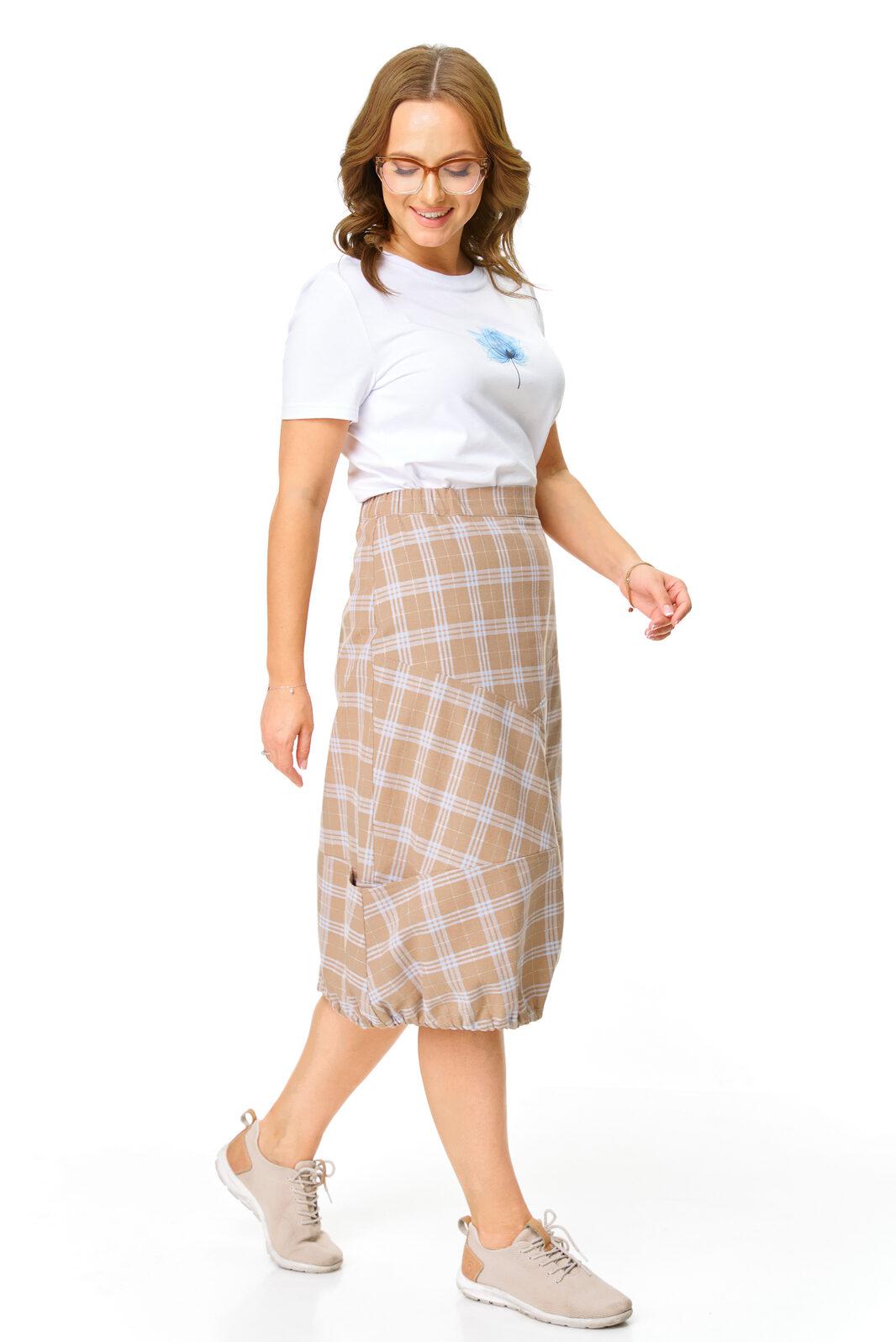 Юбка из плотного хлопка в клетку полуприлегающего силуэта по низу расширена и собрана на «стяжке». Направление клетки «антисимметрия». Застежка по спинке на «потайную» молнию. Пояс притачной с резинкой по бочкам. Карман с боку ниже бедра. С одной стороны разрез. Юбка без подкладки.