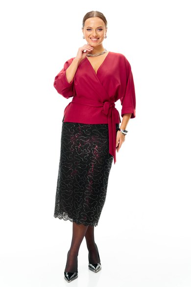 Юбка из плотного черного кружева на красной саржевой подкладке зауженная к низу с разрезом по спинке. Застежка «потайная молния» по среднему шву спинки.