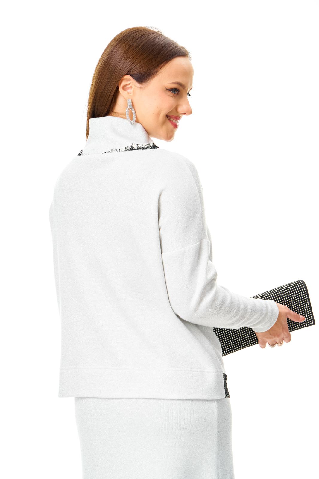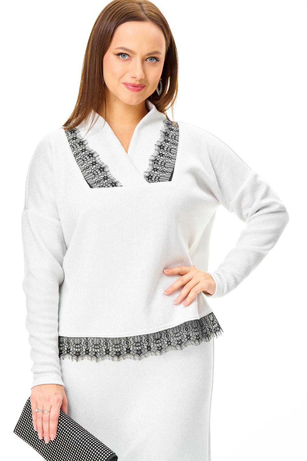Уютный джемпер свободного силуэта. Воротник с глубоким запахом переходит в планку на груди. Рукав зауженный длинный. Воротник и низ переда с кружевной отделкой.