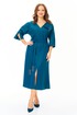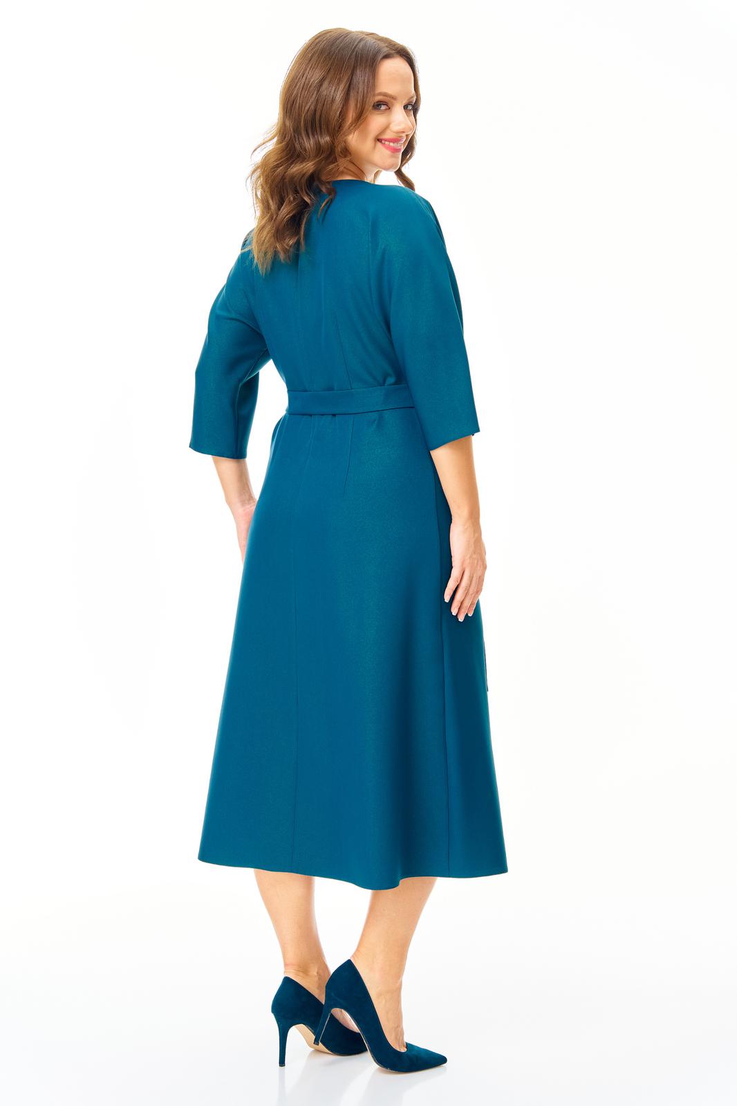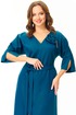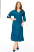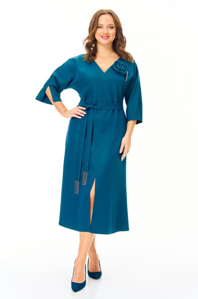 Нарядное элегантное платье из плотной ткани с легким блеском. Украшено съемным цветком. Полуприлегающего силуэта с небольшим расклешением к низу. Горловина V-образной формы. Застежка молния по спинке. Рукав цельнокроеный с разрезом. По переду невысокий соблазнительный разрез. Пояс съемный. Платье без подкладки.