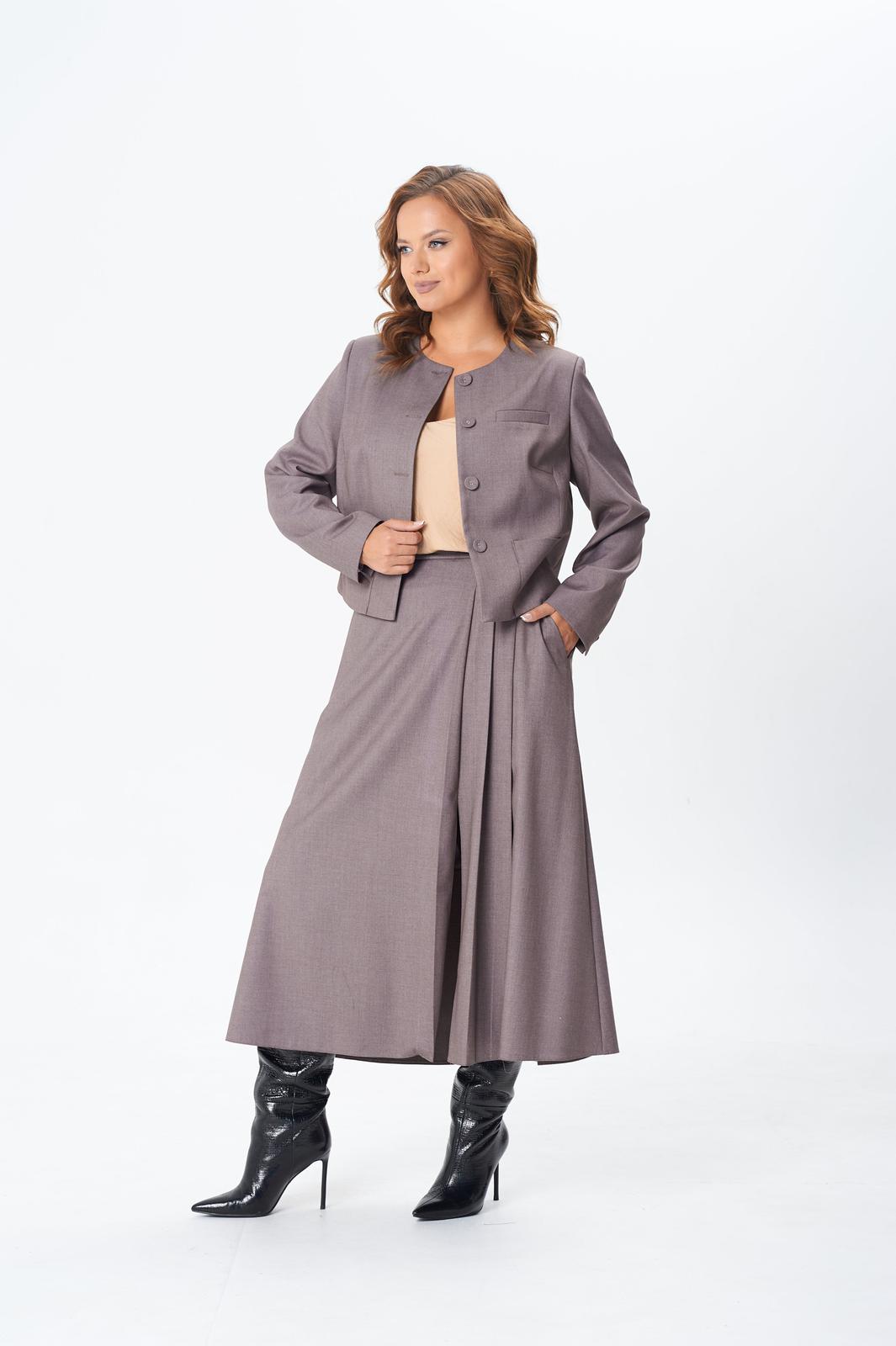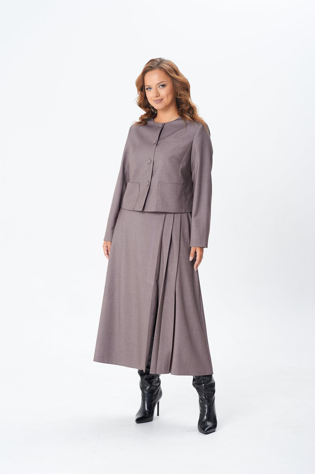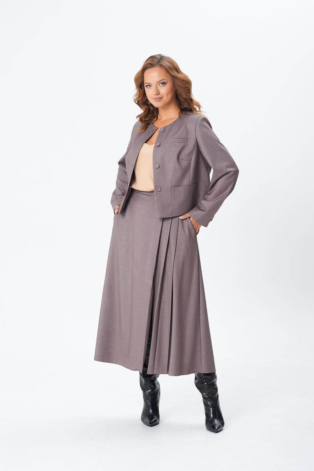 Комплект женский двойка состоит из укороченного жакета и юбки миди, выполнен из плательно-костюмной однотонной ткани, на подкладке. По переду жакета центральная застежка на петли и пуговицы, нагрудная вытачка от вертикального рельефа, накладные карманы, декоративный карман листочка. По спинке средний шов и вертикальный рельеф из проймы. Горловина округлой формы. Рукав двухшовный длинный, с небольшим разрезом внизу локтевого шва. Юбка расклешенная к низу, на подкладке, с поясом. По передней части ассиметрия: с левой стороны три складки, в одной из складок разрез. По задней части средний шов с застежкой на потайную молнию, в боковых швах функциональные карманы.