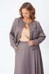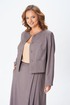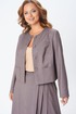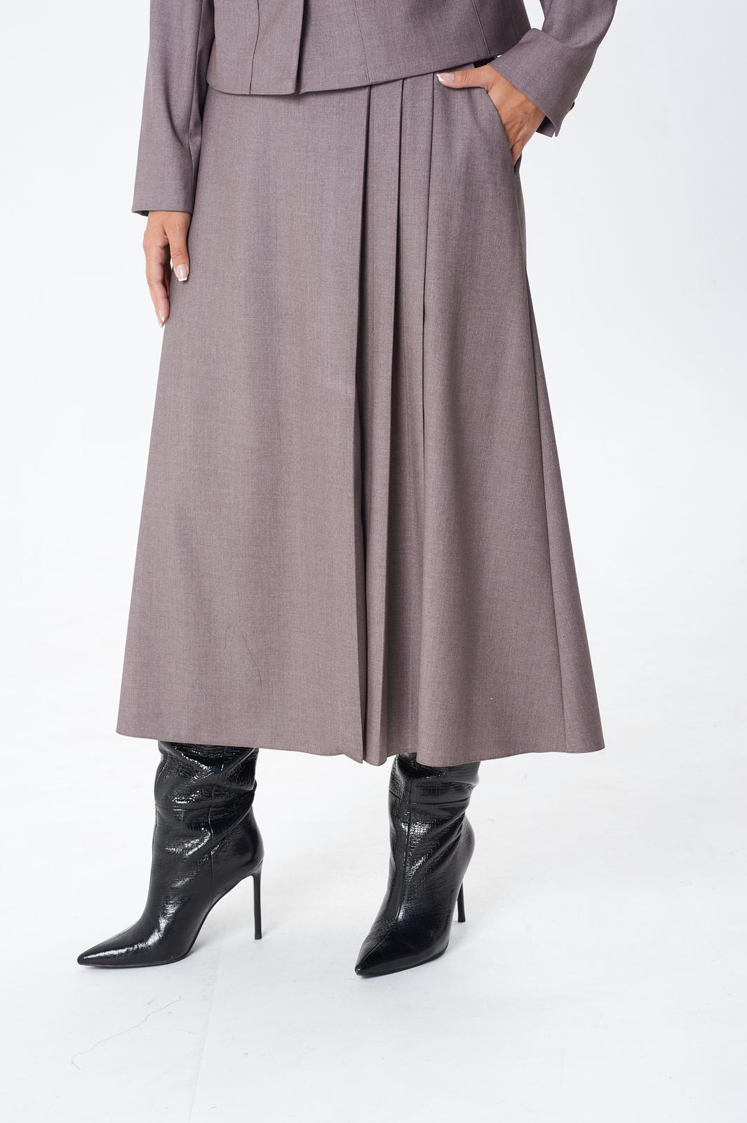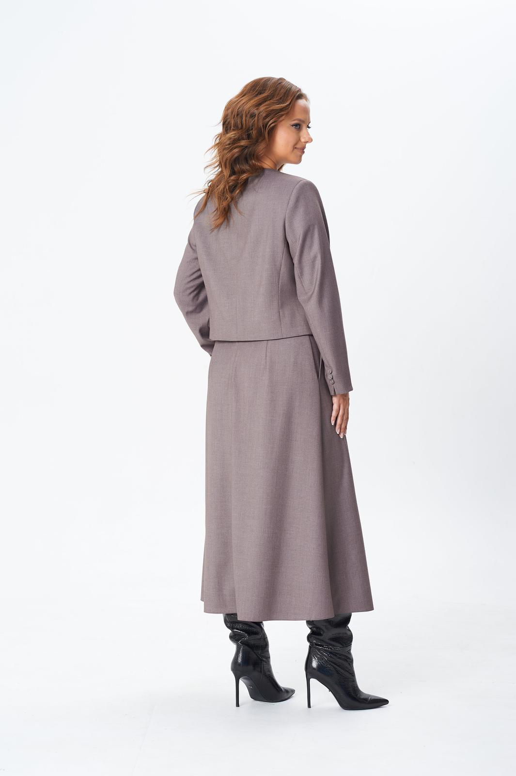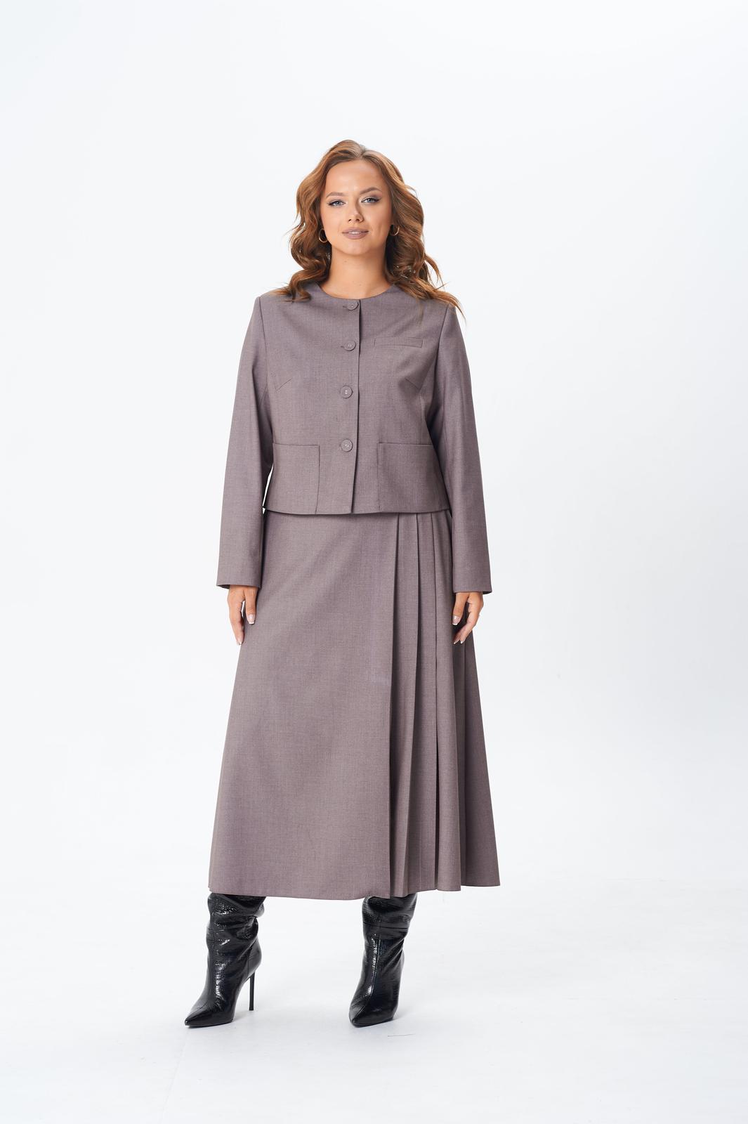 Комплект женский двойка состоит из укороченного жакета и юбки миди, выполнен из плательно-костюмной однотонной ткани, на подкладке. По переду жакета центральная застежка на петли и пуговицы, нагрудная вытачка от вертикального рельефа, накладные карманы, декоративный карман листочка. По спинке средний шов и вертикальный рельеф из проймы. Горловина округлой формы. Рукав двухшовный длинный, с небольшим разрезом внизу локтевого шва. Юбка расклешенная к низу, на подкладке, с поясом. По передней части ассиметрия: с левой стороны три складки, в одной из складок разрез. По задней части средний шов с застежкой на потайную молнию, в боковых швах функциональные карманы.