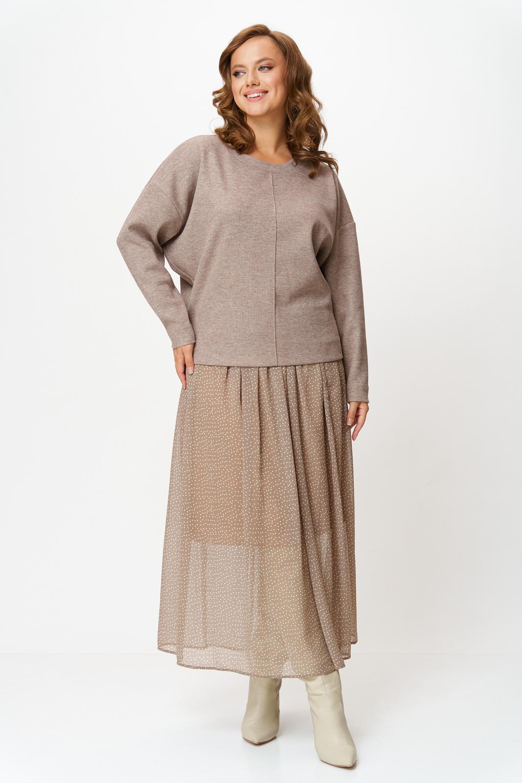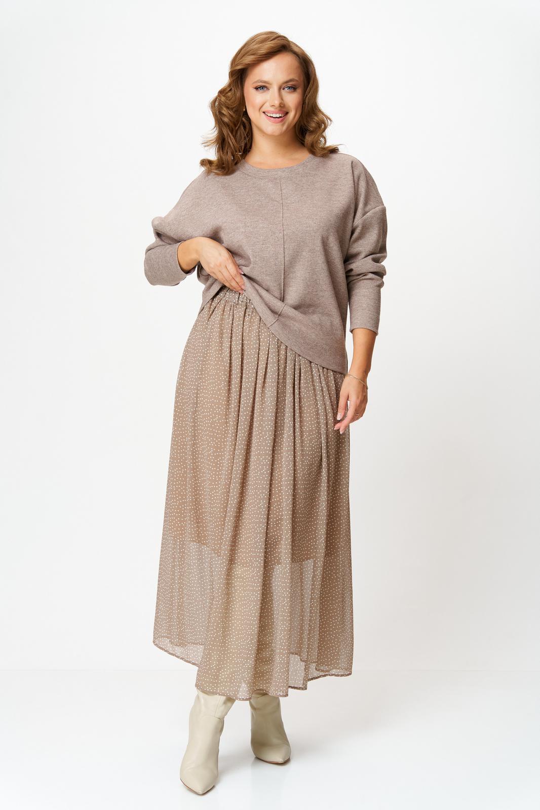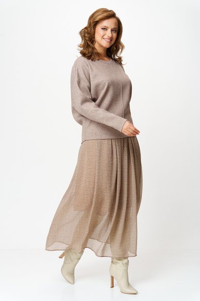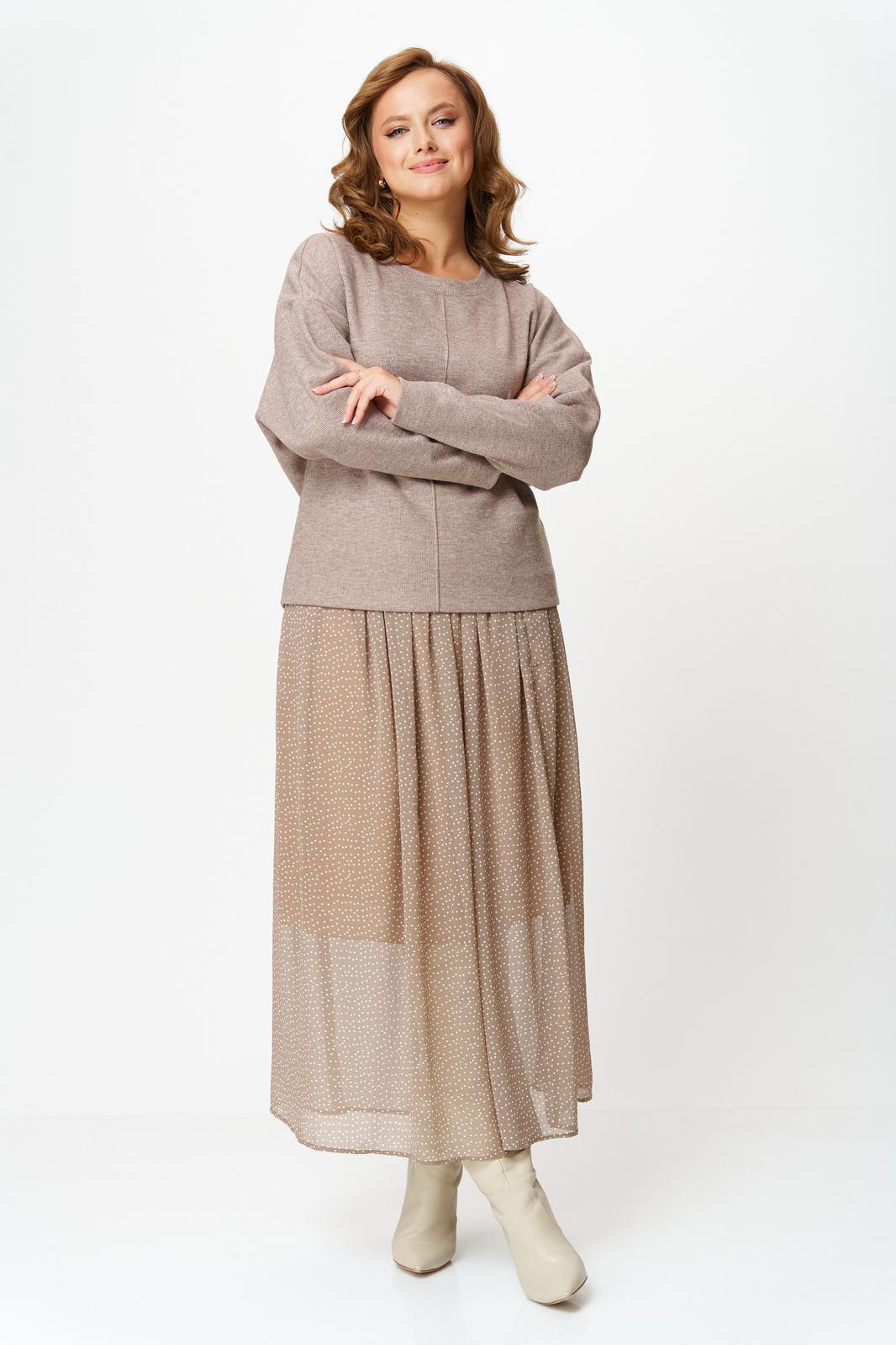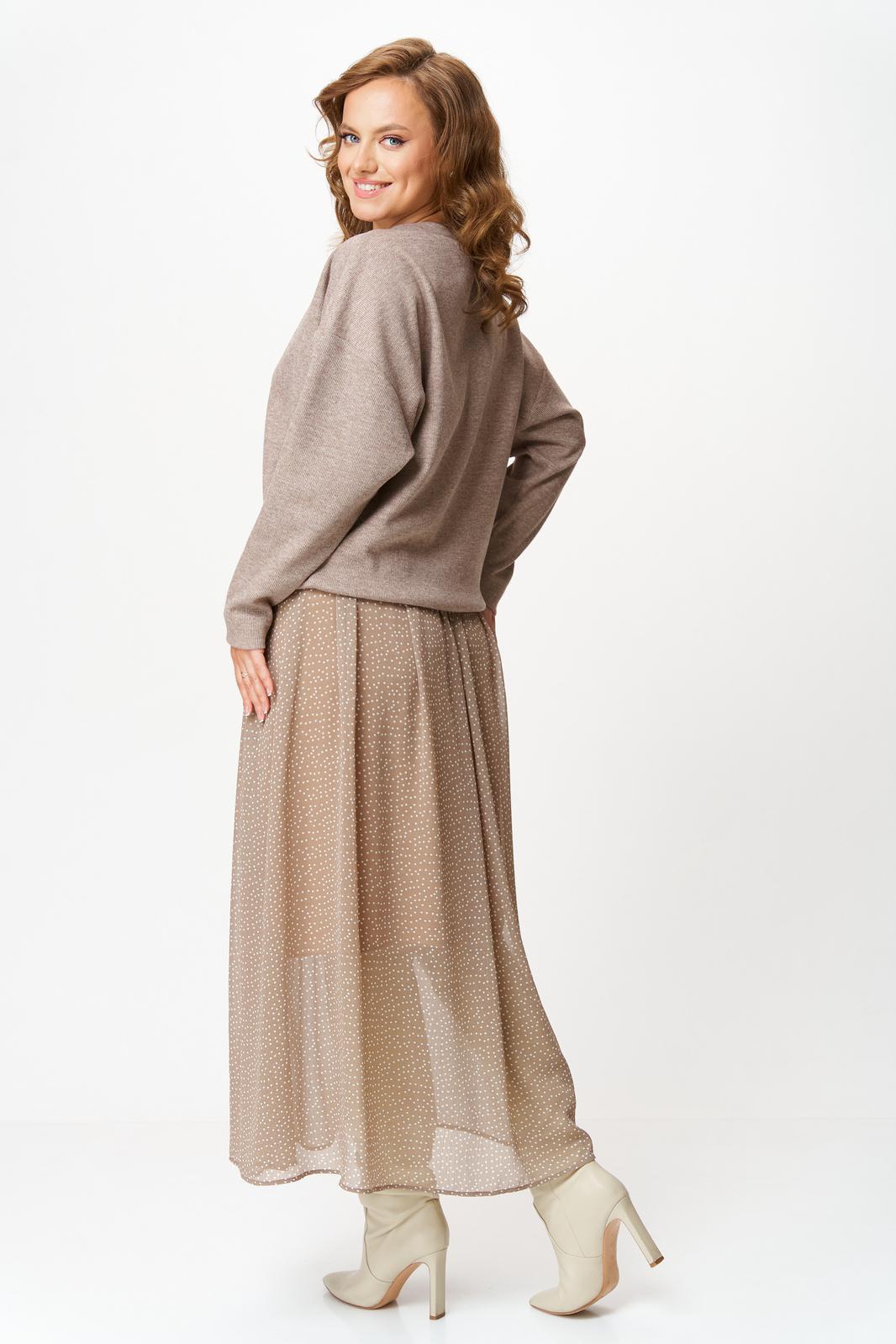 Комплект женский состоит из джемпера и юбки. Джемпер трикотажный свободного покроя типа летучая мышь. По переду и спинке по центру вертикальный декоративный защип, который визуально вытягивает фигуру. Горловина округлой формы, обработана планкой из основной ткани. Юбка миди из шифона с принтом в мелкий горошек. Пояс на резинке. Юбка на подкладке.