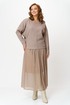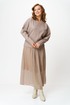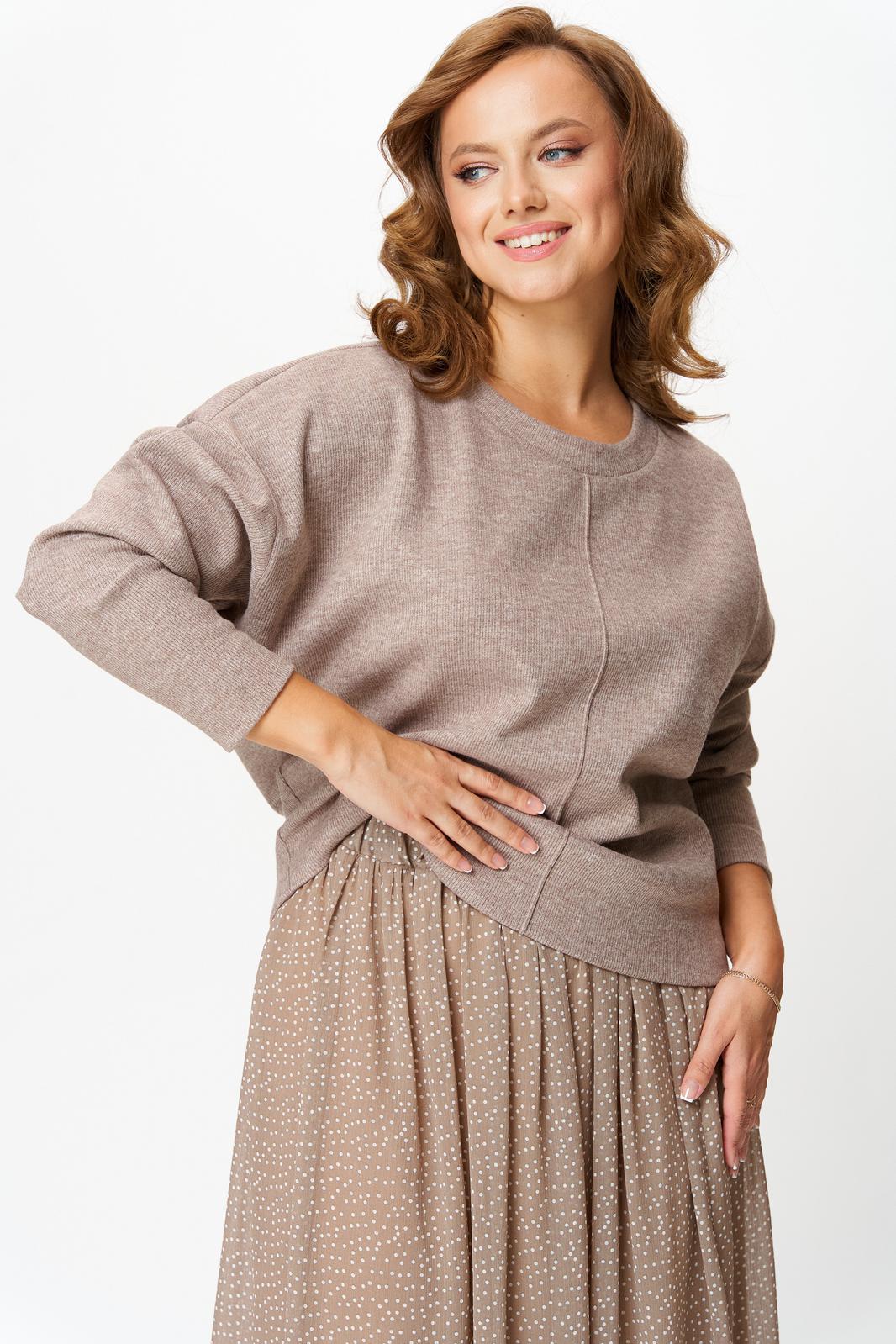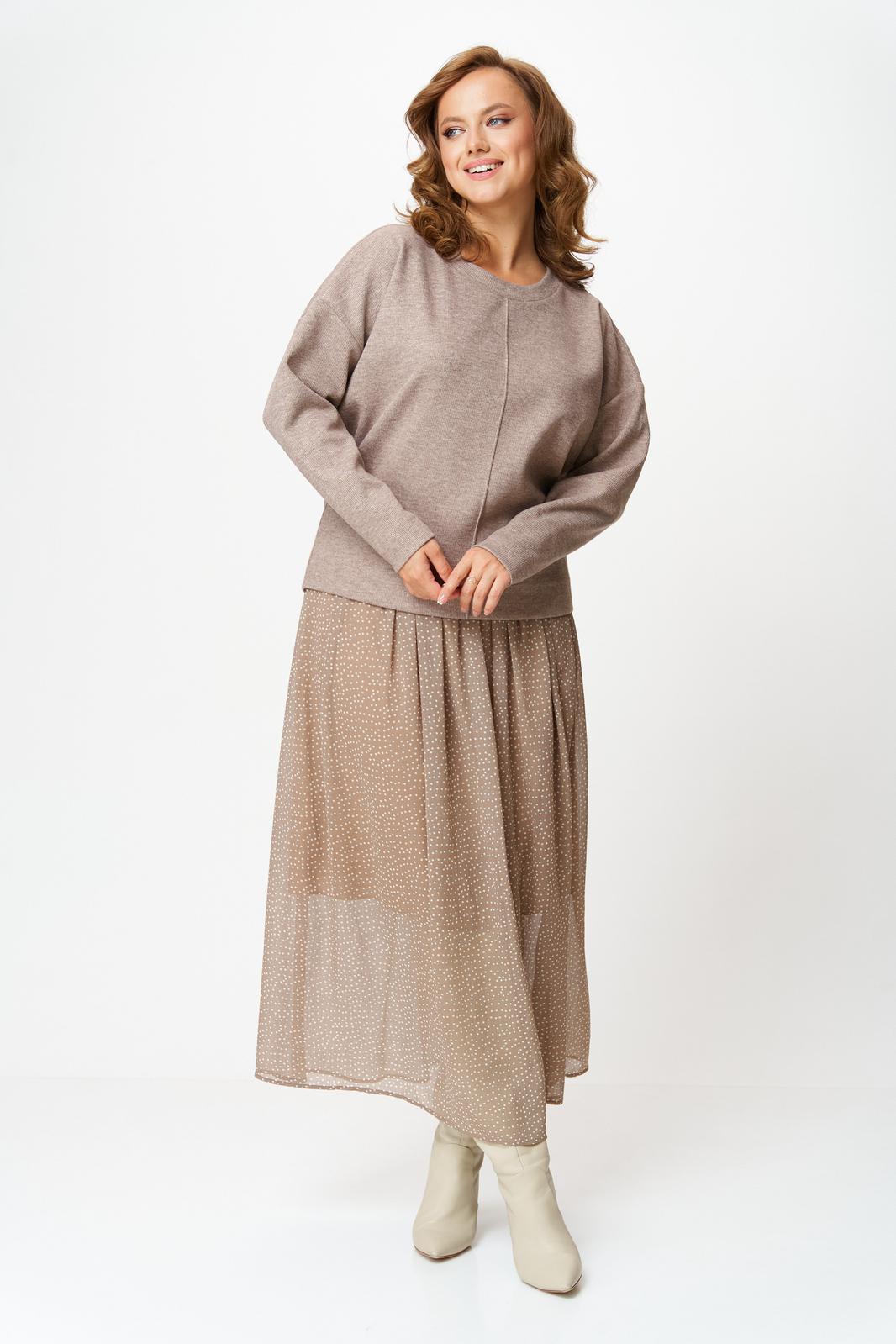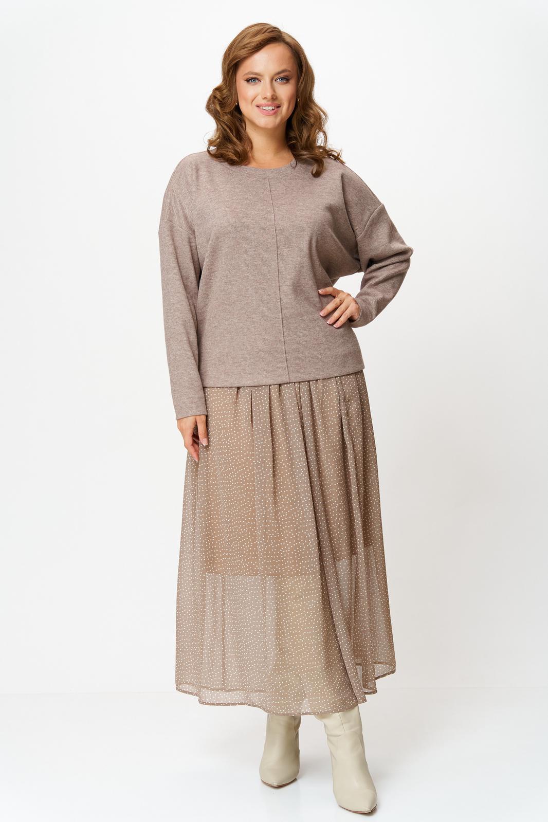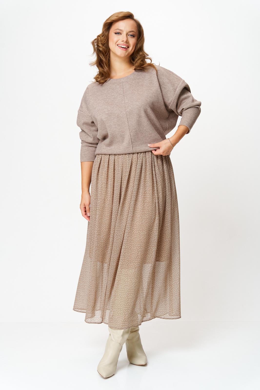 Комплект женский состоит из джемпера и юбки. Джемпер трикотажный свободного покроя типа летучая мышь. По переду и спинке по центру вертикальный декоративный защип, который визуально вытягивает фигуру. Горловина округлой формы, обработана планкой из основной ткани. Юбка миди из шифона с принтом в мелкий горошек. Пояс на резинке. Юбка на подкладке.