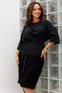 Комплект женский состоит из блузки и юбки. Блузка с цельнокроеным рукавом длиной 3/4. От правого плеча идут мягкие складки к центру переда. Застежка по центру спинки на петлю и пуговицу. По бокам небольшие разрезы. Блузка с поясом. Юбка на поясе выполнена из кружевного полотна на подкладке из основной ткани. На поясе по бокам эластичная тесьма. По среднему шву задней половинки юбки молния, снизу разрез 13,5 см.