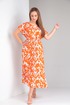 Платье женское из вискозной ткани свободного кроя со спущенным рукавом. По переду: отрезные планки по плечу. По спинке: средний шов, по центру «капелька» с застёжкой на петлю-пуговицу. Рукав цельнокроеный, спущенный, с отложенной манжетой. Горловина в форме «лодочки», обработана обтачкой; по горловине отделочная строчка. В боковых швах карманы и шлицы (длина края 39 см). В комплект входит декоративный пояс.