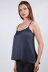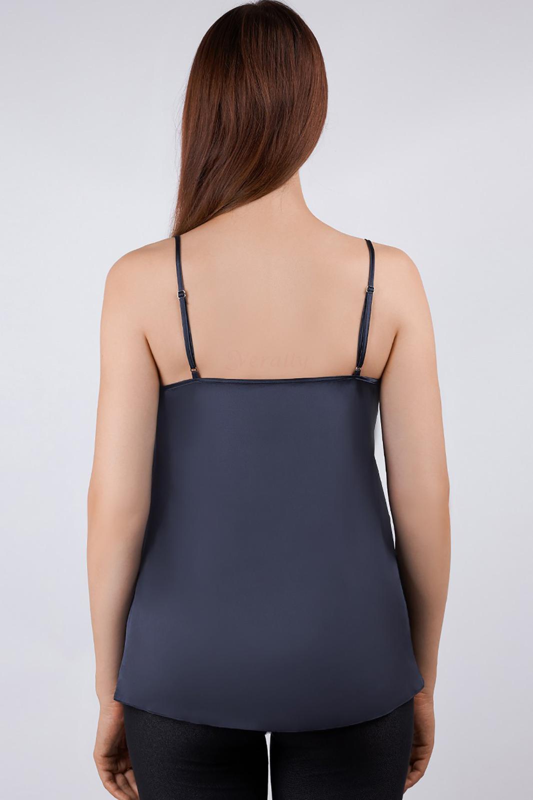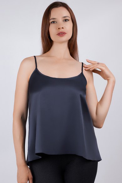 Топ женский из эластичного искусственного шелка на узких регулируемых бретелях. Низ изделия укорочен по переду и переходит плавной линией на удлиненную спинку.