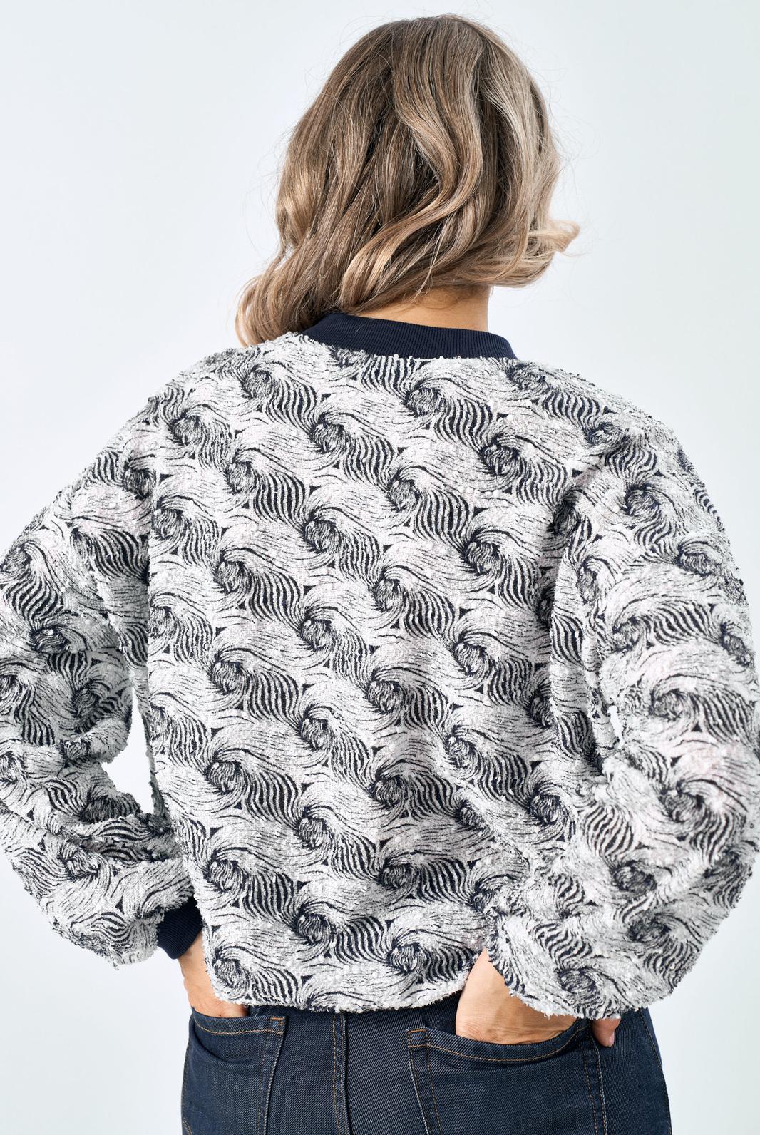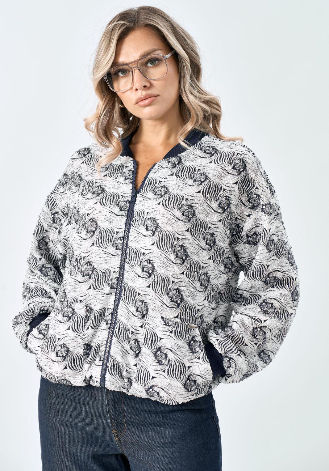 Стильная бомбер. Выполнен из текстильной ткани. Изделие с центральной застежкой на металлическую молнию. Горловина со вставкой из отделочной ткани. По переду изделия карманы. Рукав спущенный. Низ на манжете. По низу изделия сборка на резинку.