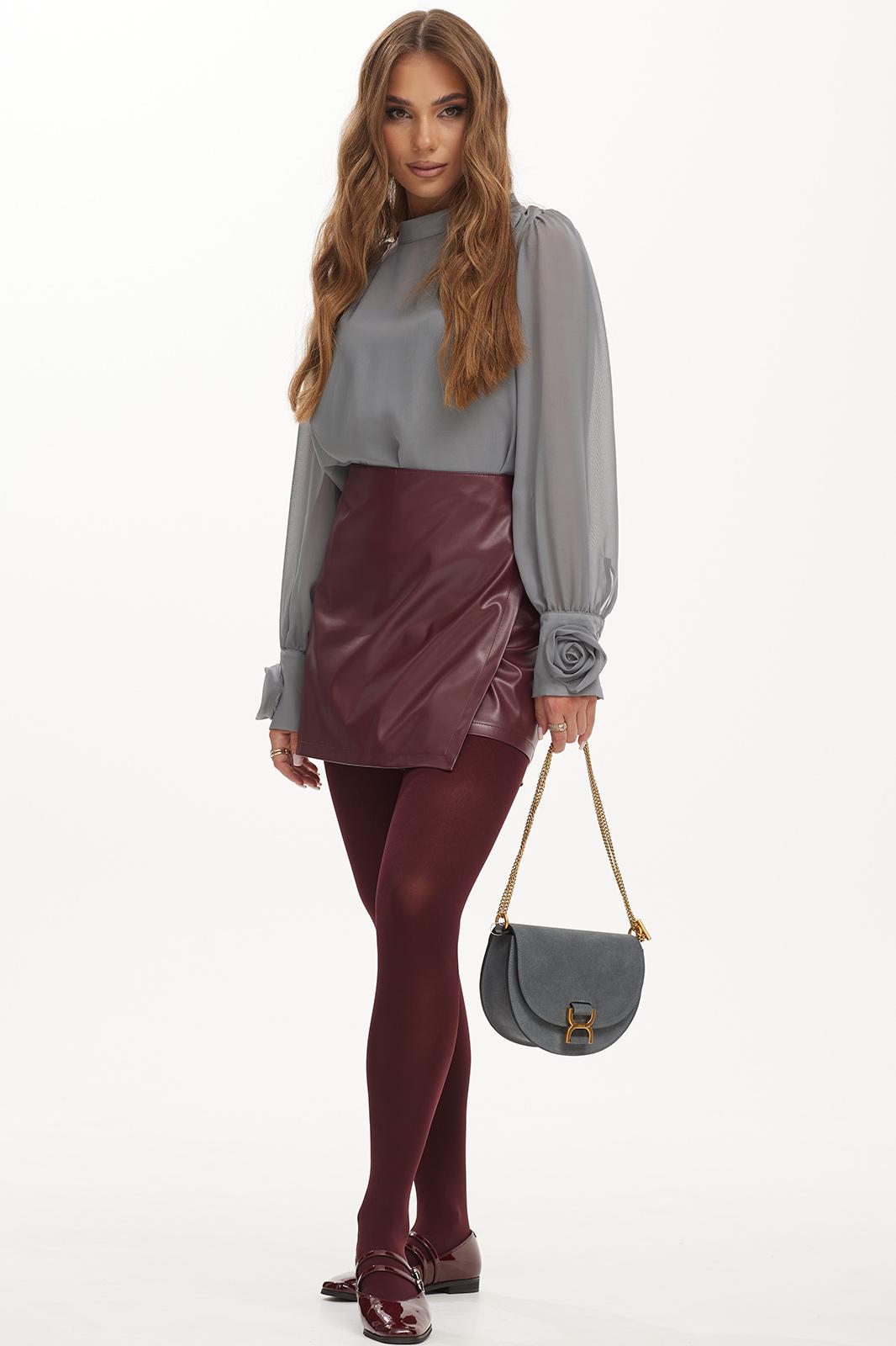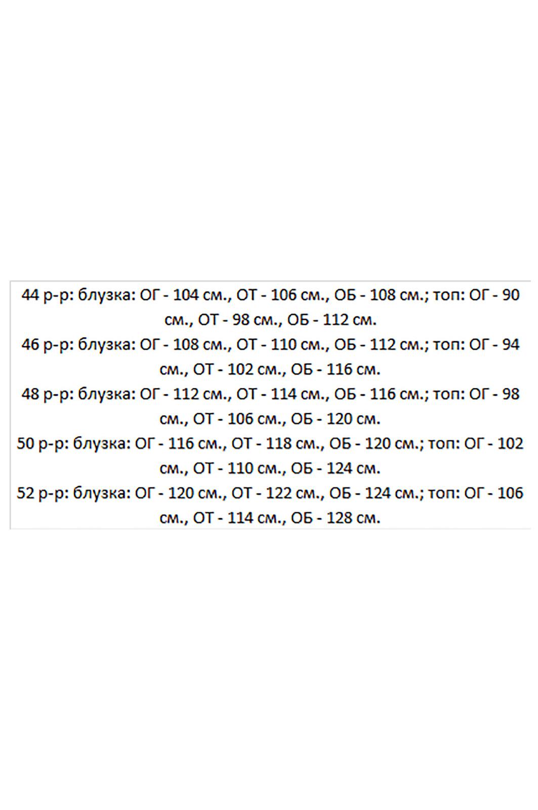 Блузка из шифоновой ткани прямого силуэта. Воротник стойка. Застежка по горловине спинки на петлю и пуговицу. Рукав прямой с манжетой по низу. Манжета с застежкой на петлю и пуговицу. На переде и манжетах декоративный элемент «роза». В комплекте топ из шифоновой ткани на регулируемых бретелях. Длина блузки 64 см. топ - 58 см. Длина рукава 75 см. (от горловины)
