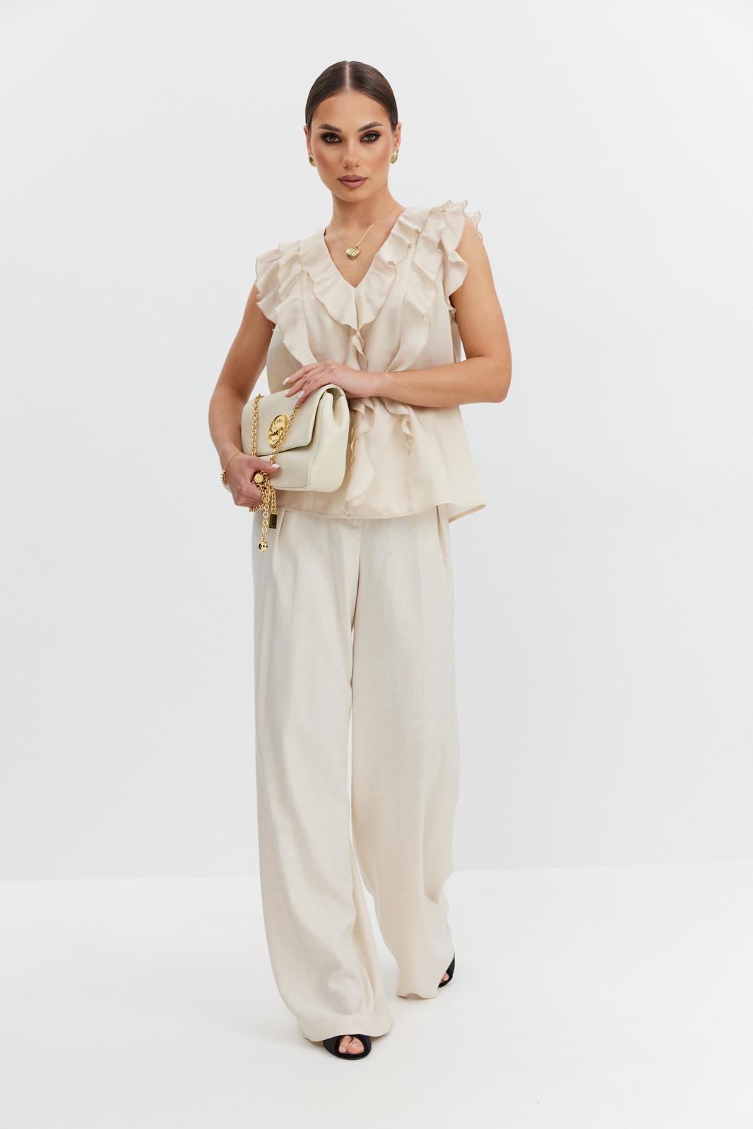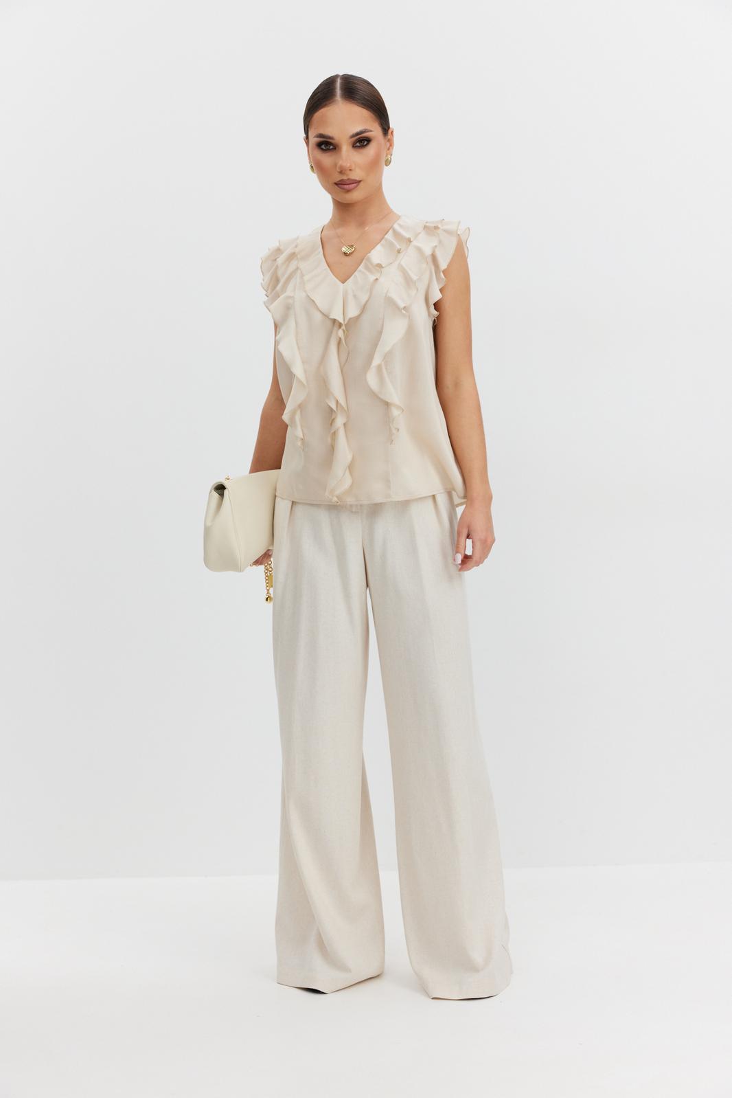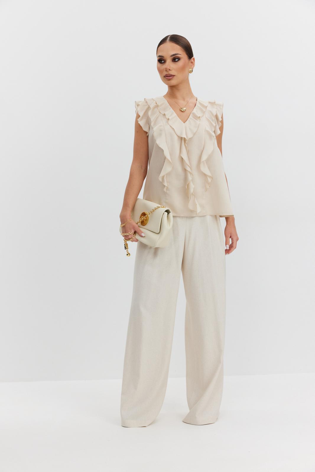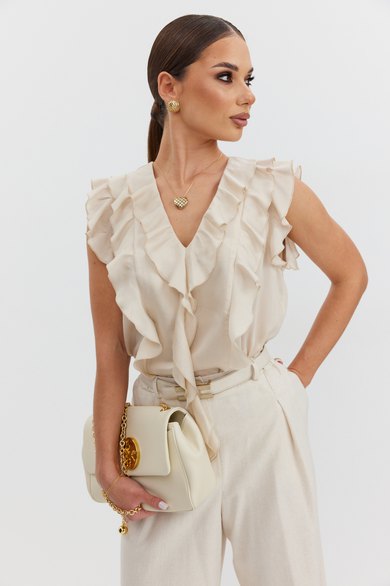 Блузка женская прямого силуэта из полупрозрачной блузочной ткани вуаль, длиной выше уровня бедер. Блузка с воланами: по горловине переда, рельефам и проймам. Центральные части переда и спинки на подкладке. Вырез горловины V-образной формы.