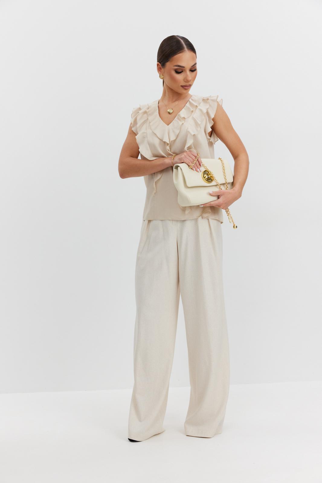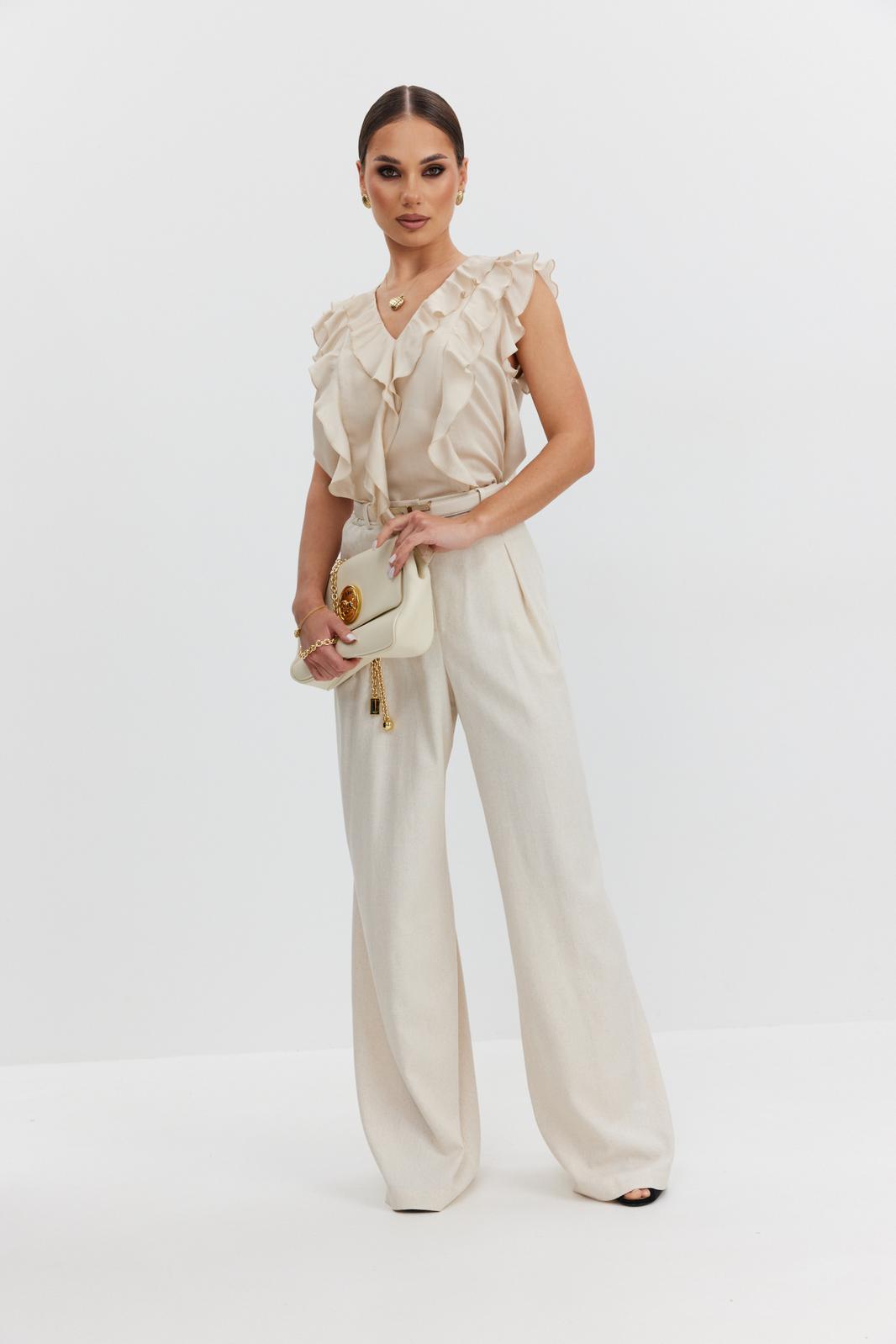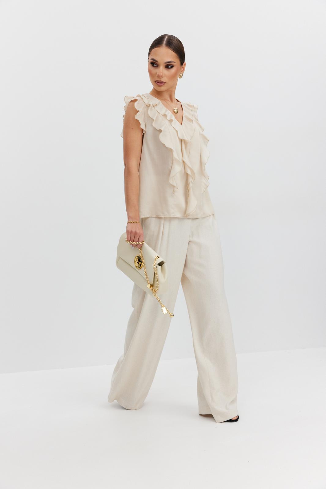 Блузка женская прямого силуэта из полупрозрачной блузочной ткани вуаль, длиной выше уровня бедер. Блузка с воланами: по горловине переда, рельефам и проймам. Центральные части переда и спинки на подкладке. Вырез горловины V-образной формы.