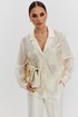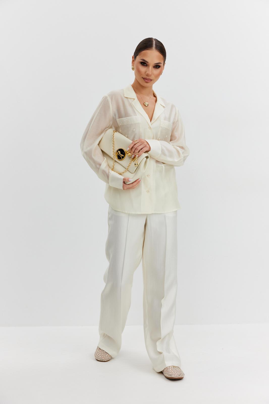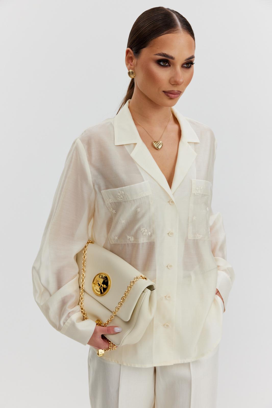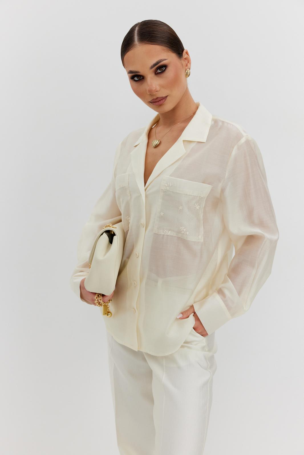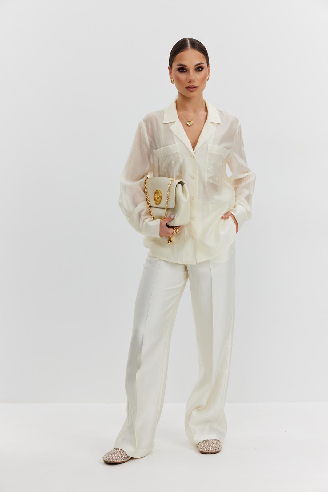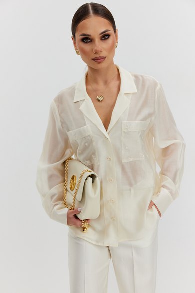 Блузка женская свободного силуэта, из полупрозрачной ткани вуаль. Воротник отложной с лацканами, застежка центральная на 5 петель и пуговиц, по переду накладные карманы из отделочной ткани с вышивкой, рукав свободный, по низу манжета с пуговицами.