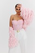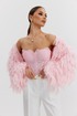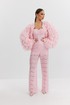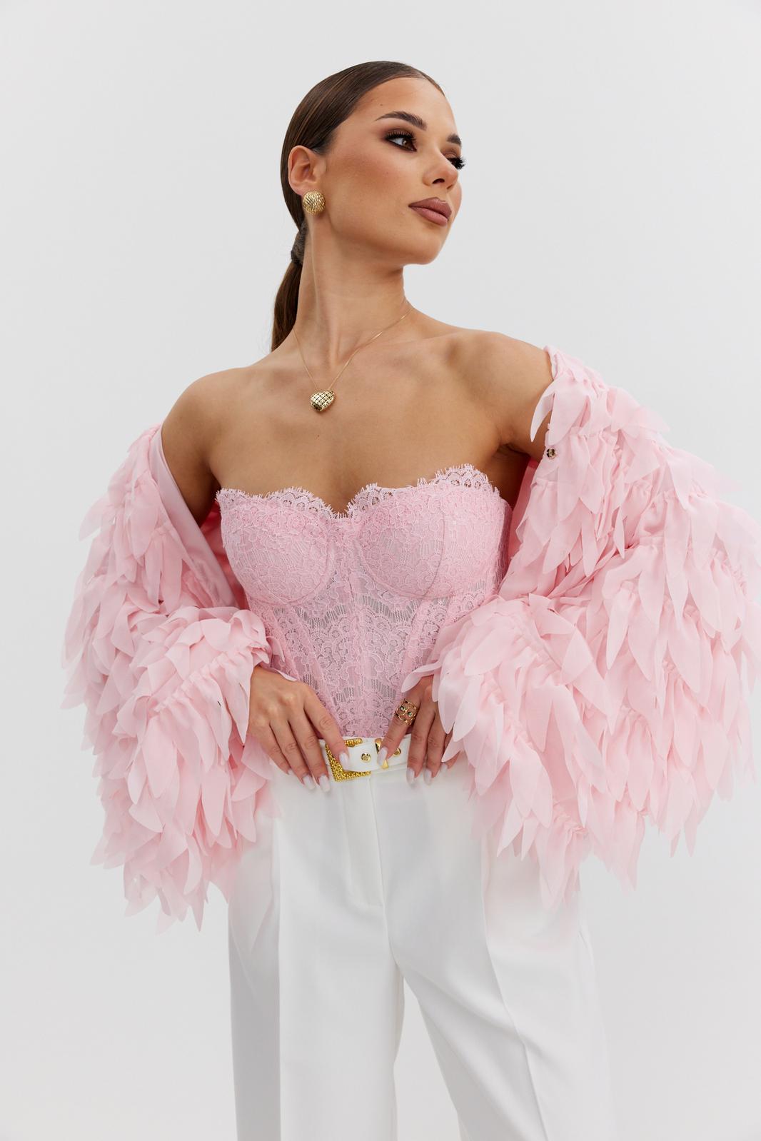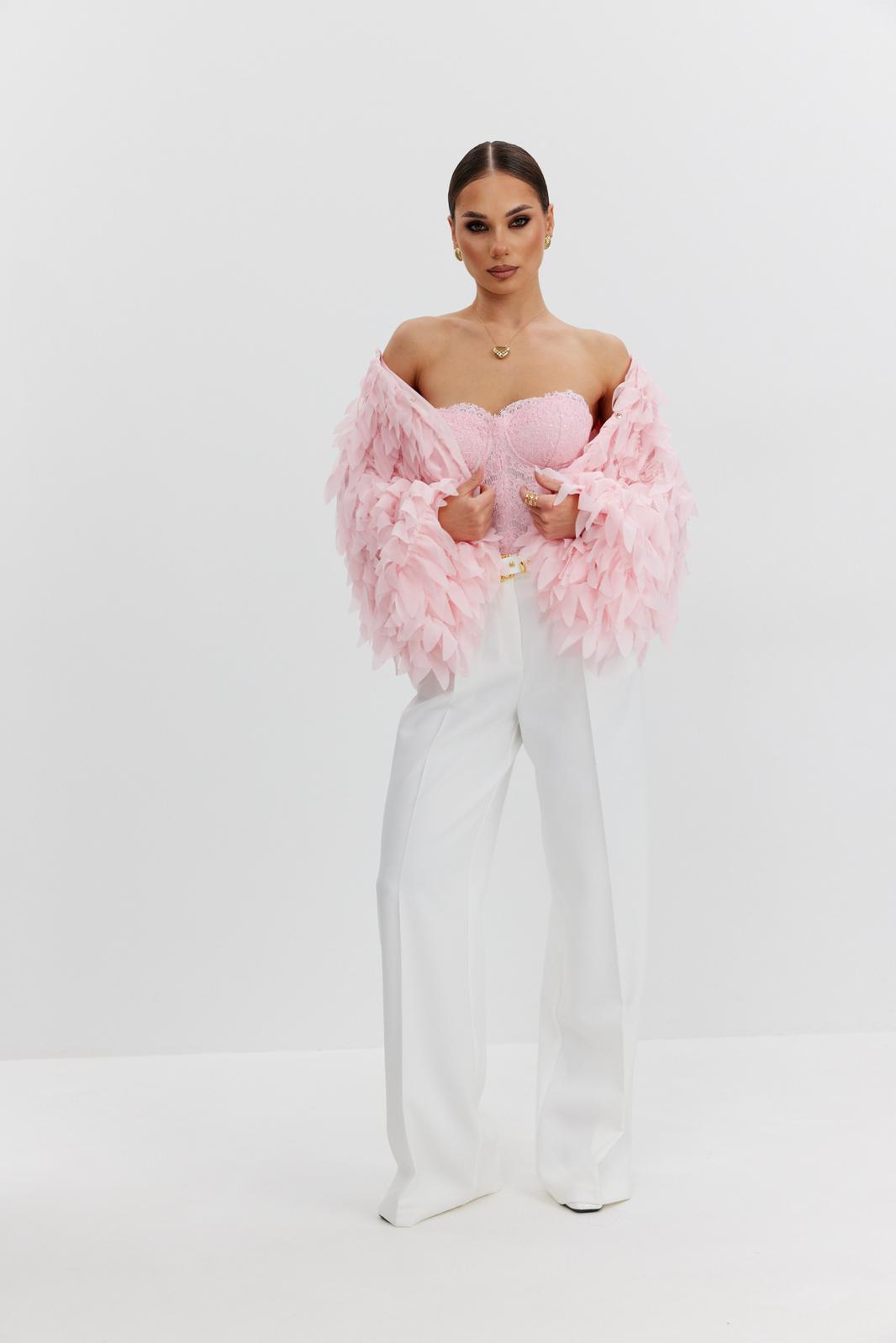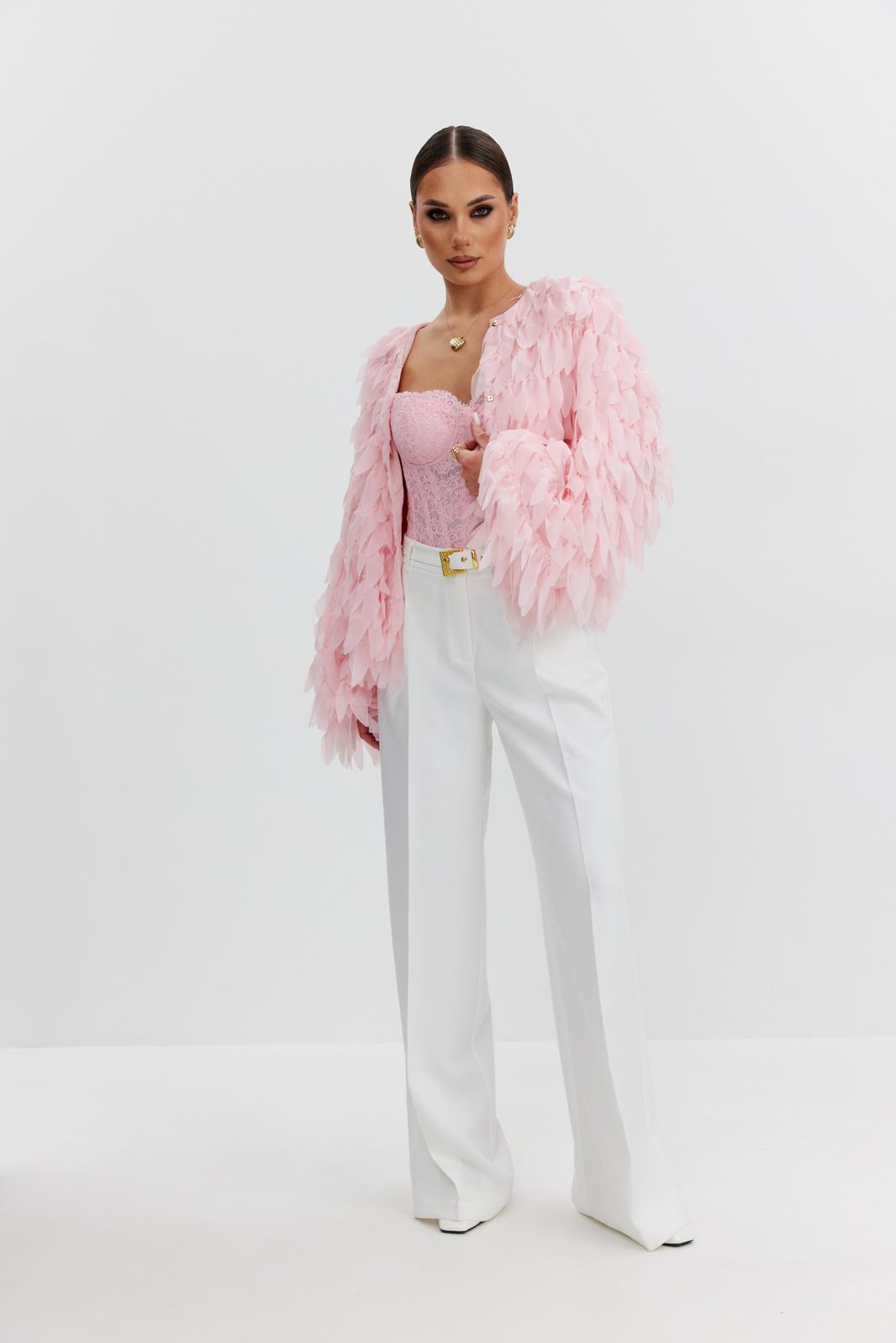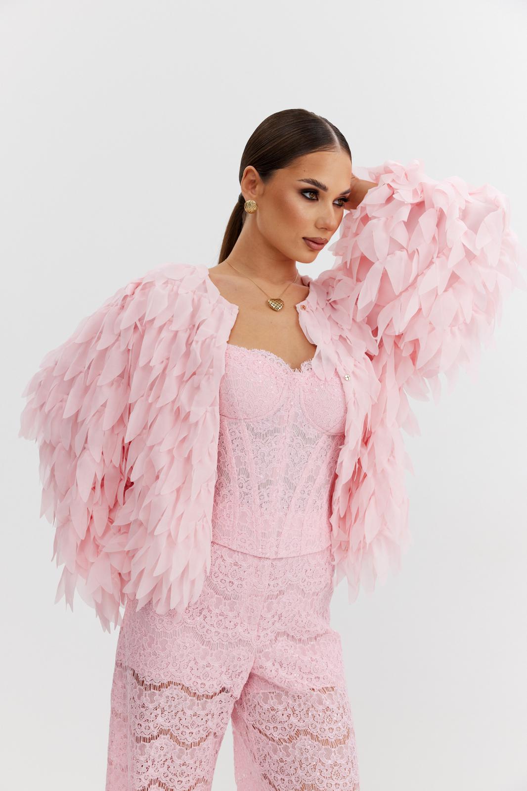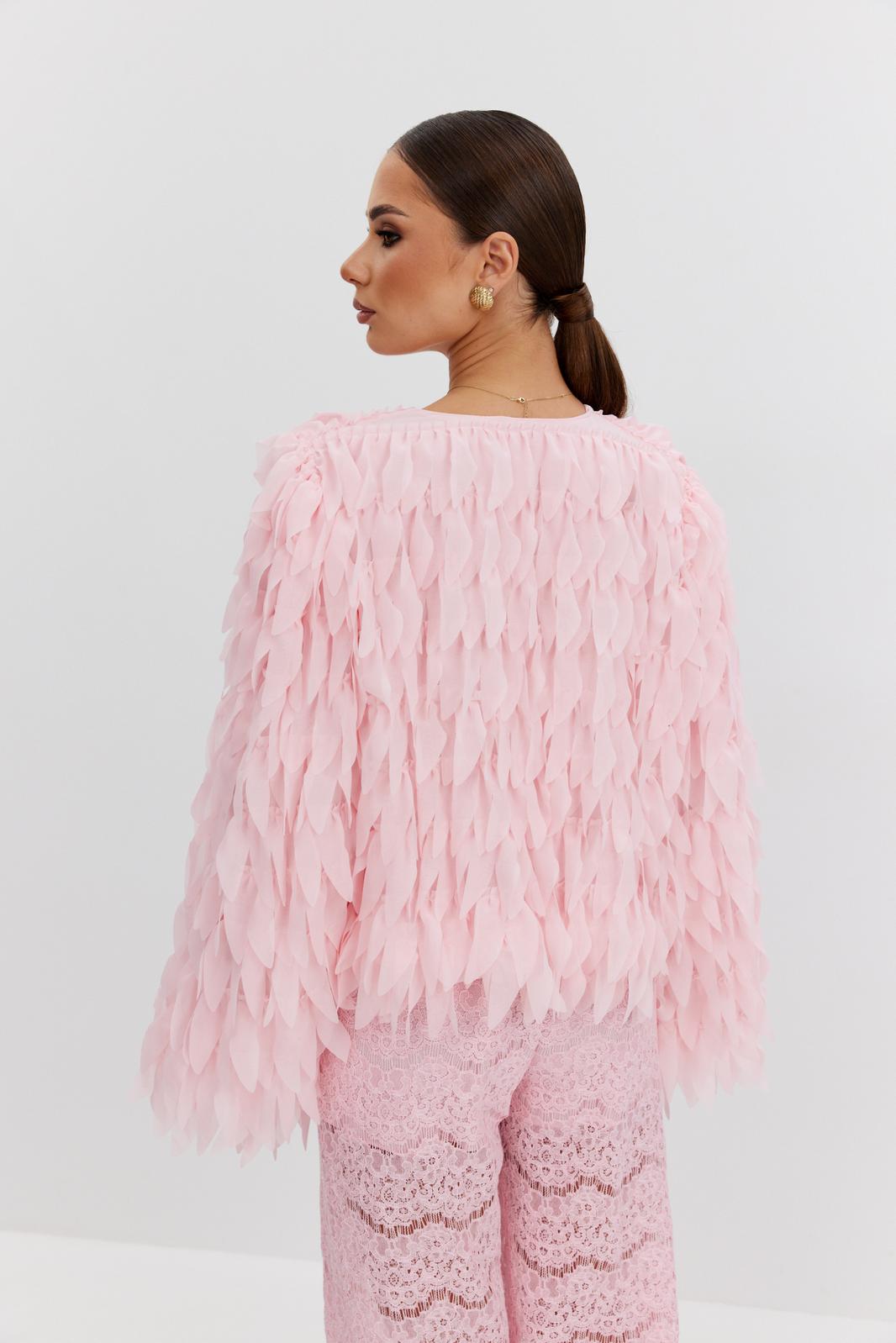 Жакет женский, из костюмно-плательной фактурной ткани, укороченный, прямого силуэта с центральной застежкой на четыре пришивные кнопки. Рукава длинные, расширенные книзу с эффектом «баллон», жакет на подкладке. Жакет прекрасно дополнит любой вечерний праздничный образ.