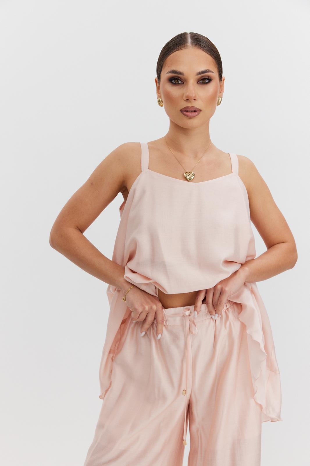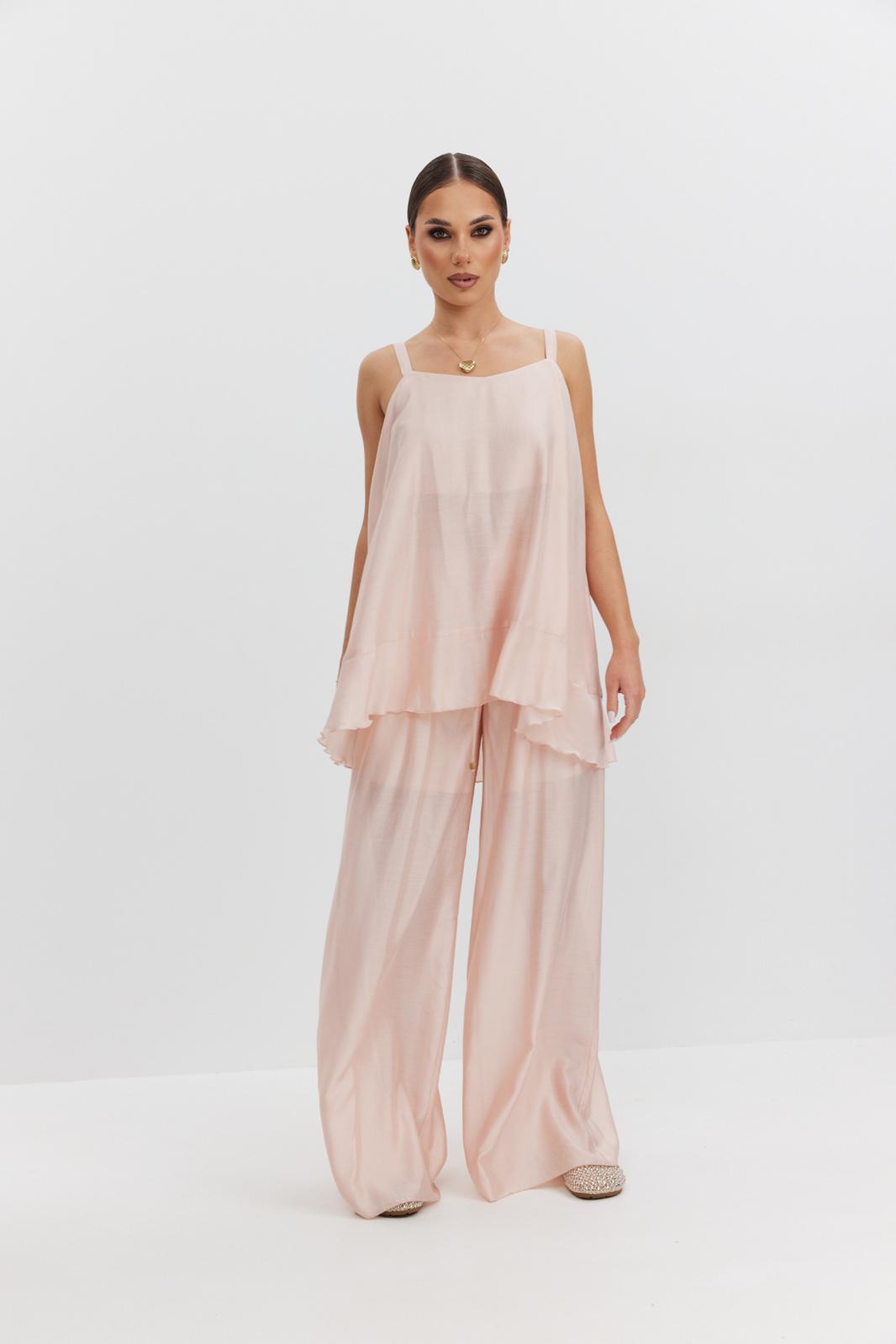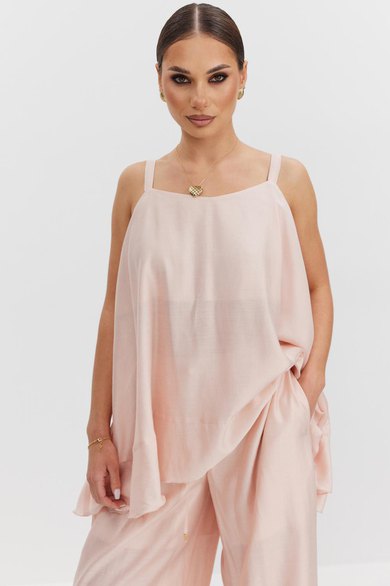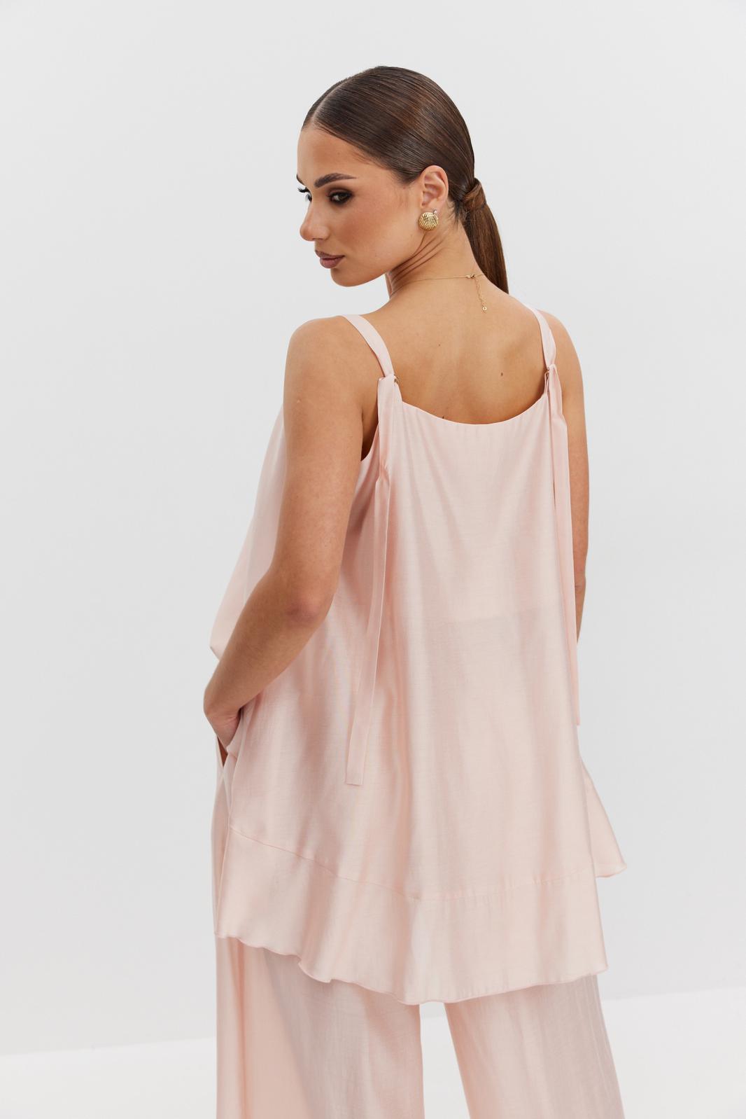 Блузка женская свободного А-силуэта из полупрозрачной блузочной ткани вуаль, длиной ниже уровня бедер, на притачных широких бретелях, регулируемых сзади с помощью «колец-протяжек». Спинка удлиненная, по низу блузки притачная широкая планка. Блузка на подкладке.