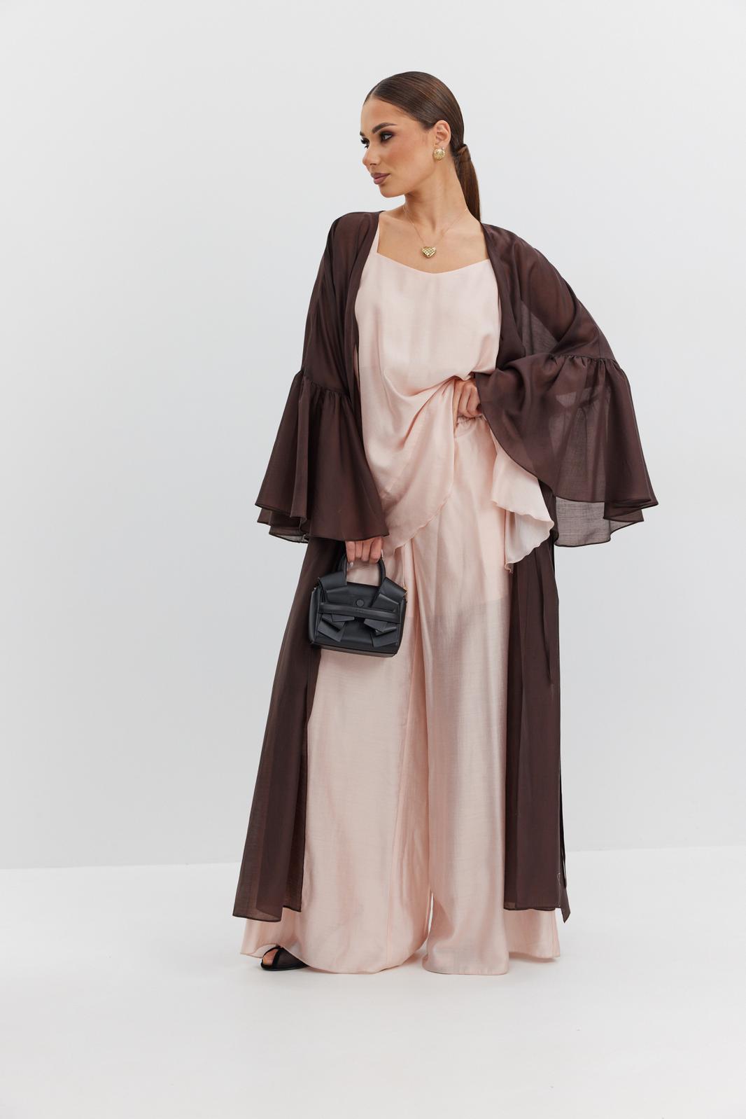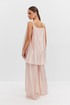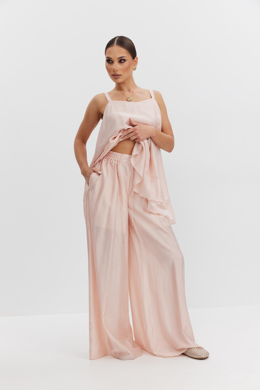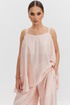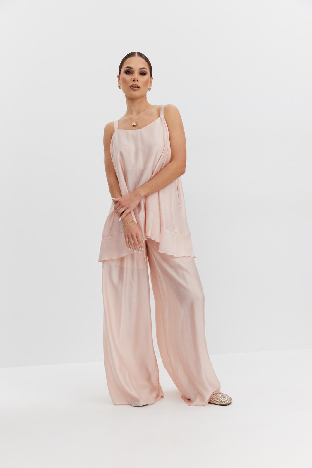 Блузка женская свободного А-силуэта из полупрозрачной блузочной ткани вуаль, длиной ниже уровня бедер, на притачных широких бретелях, регулируемых сзади с помощью «колец-протяжек». Спинка удлиненная, по низу блузки притачная широкая планка. Блузка на подкладке.